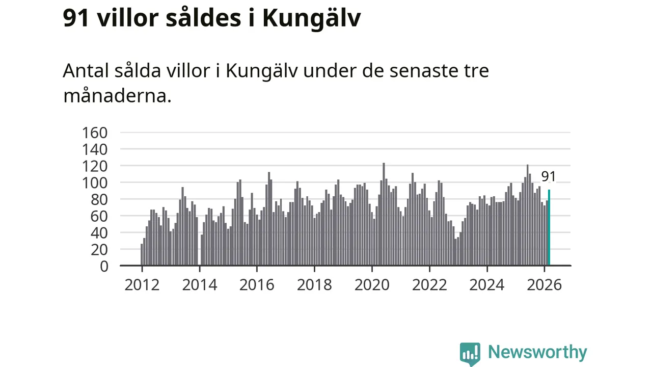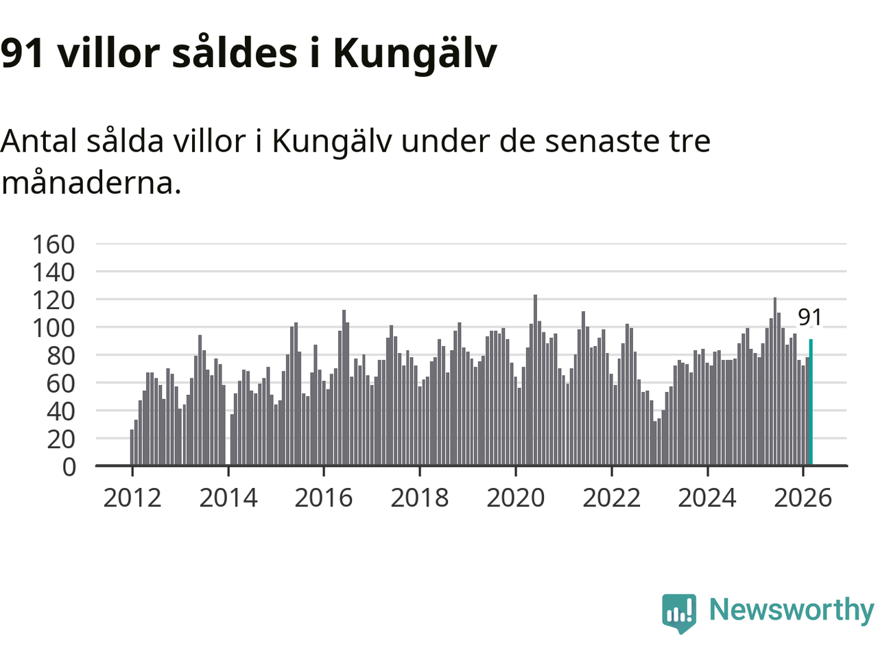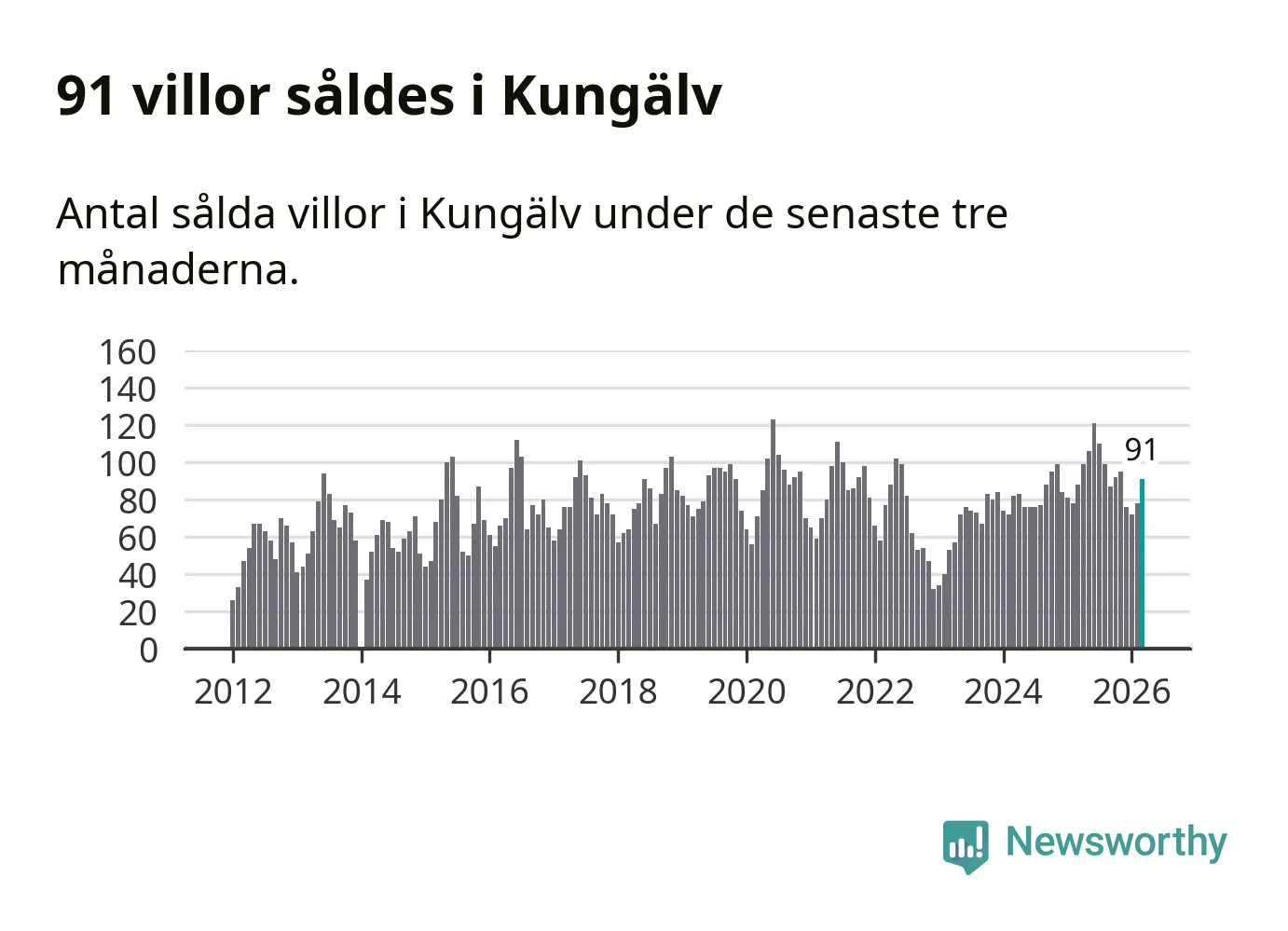 Sammanlagt såldes 91 villor i Kungälvs kommun mellan januari och mars till ett genomsnittligt pris på 5,3 miljoner kronor. I fjol gjordes 88 affärer vid den här tiden på året.