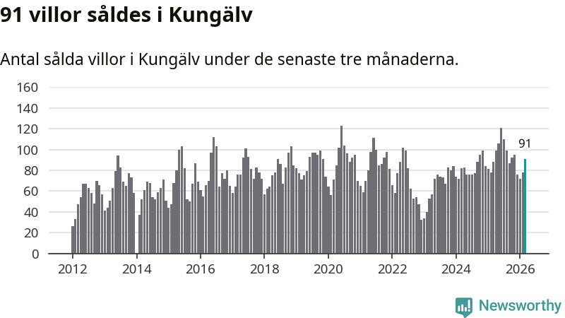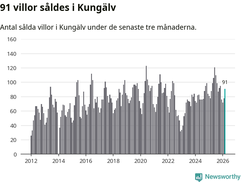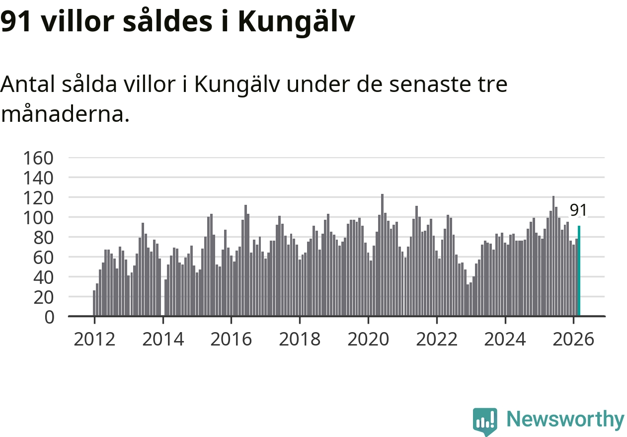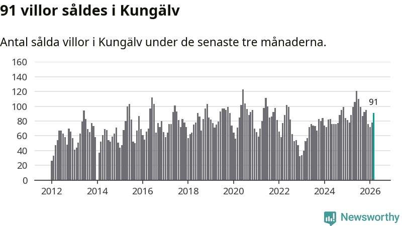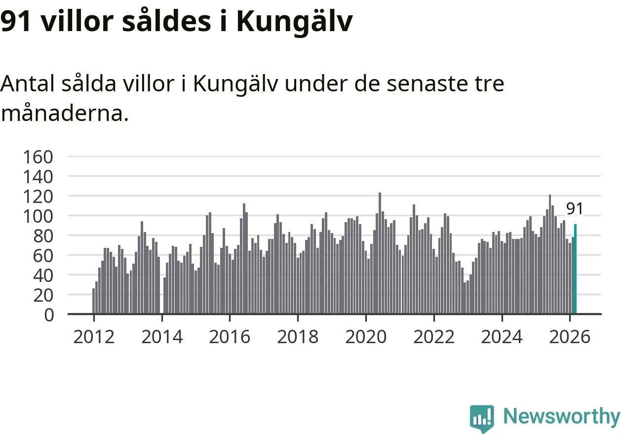 Sammanlagt såldes 91 villor i Kungälvs kommun mellan januari och mars till ett genomsnittligt pris på 5,3 miljoner kronor. I fjol gjordes 88 affärer vid den här tiden på året.