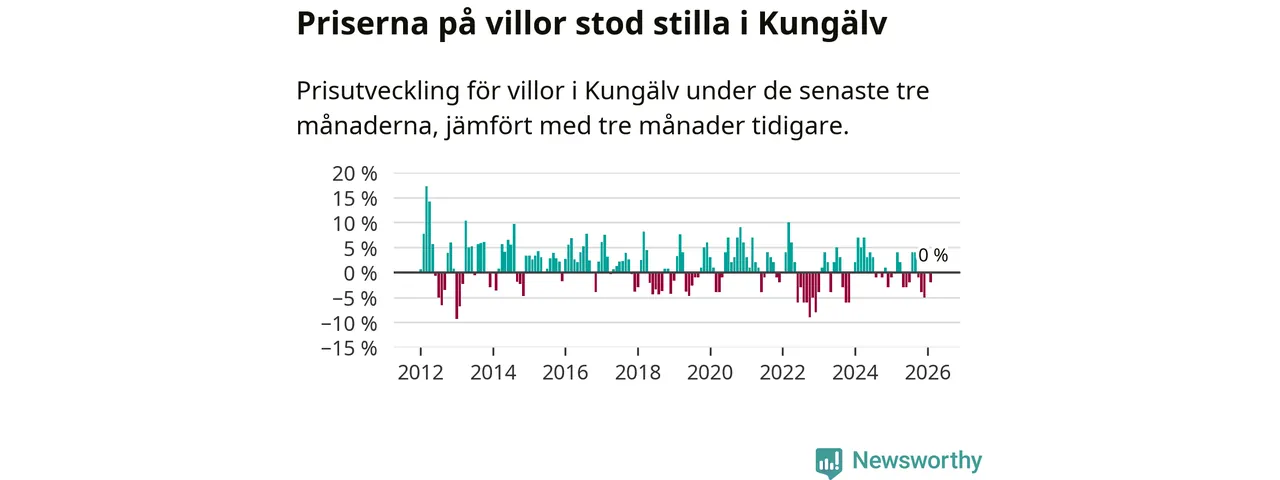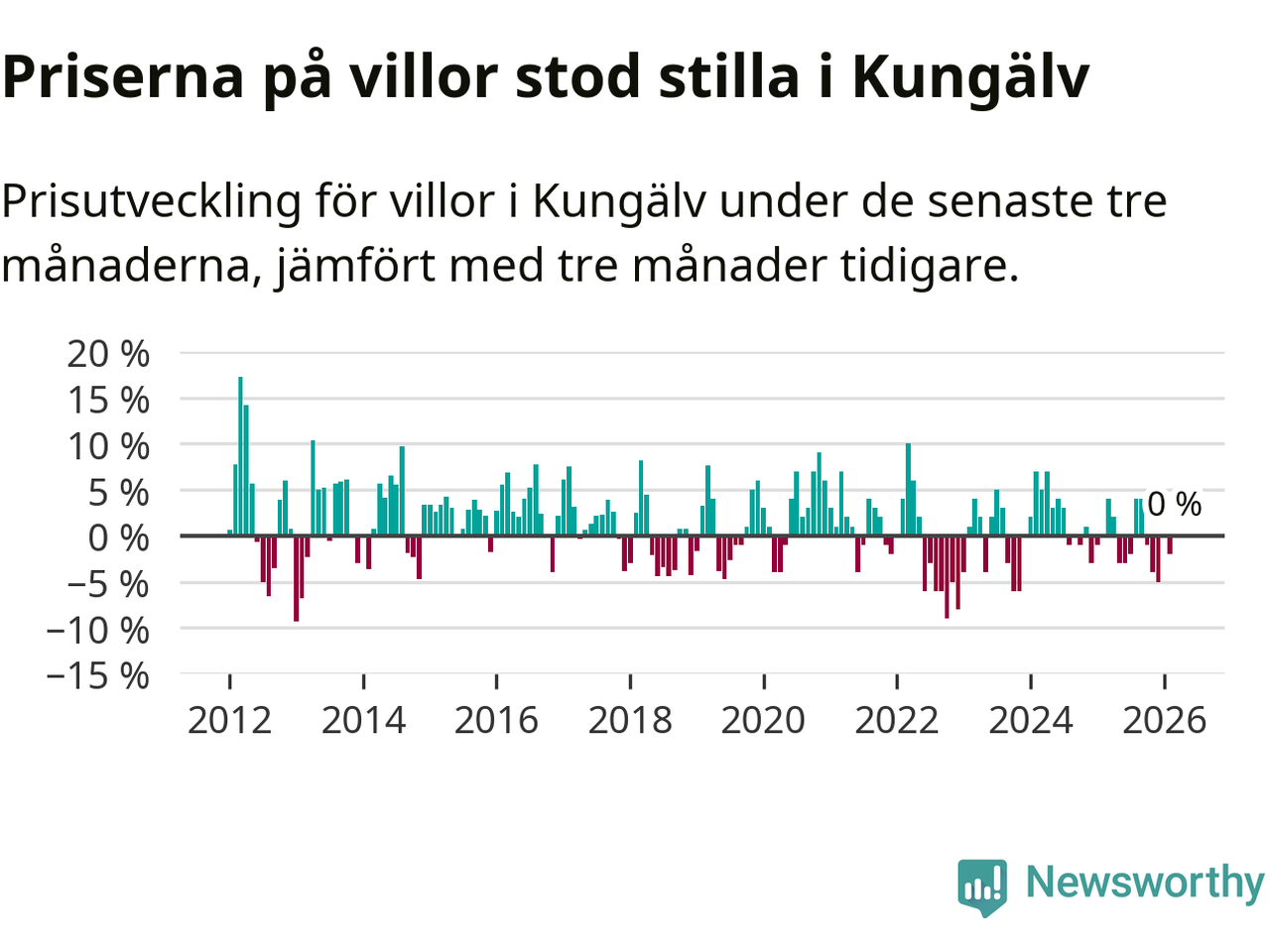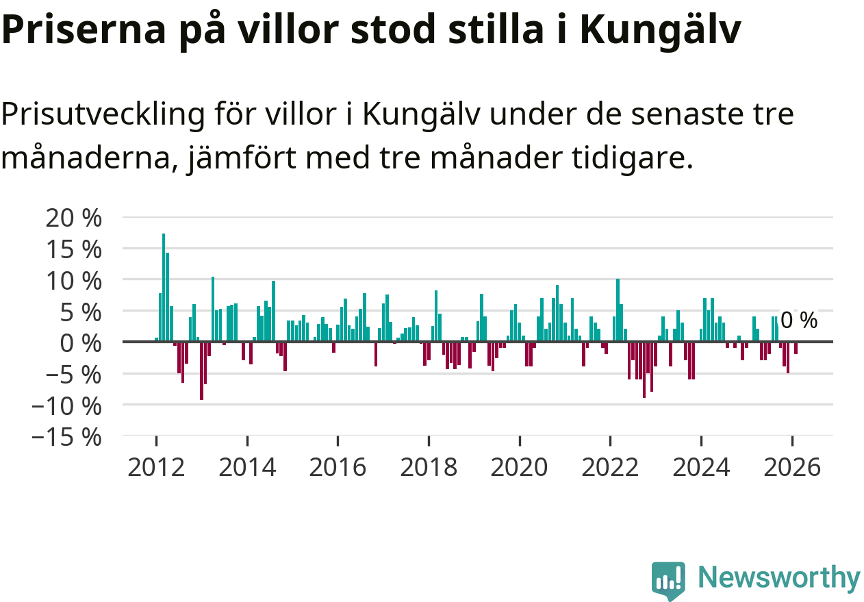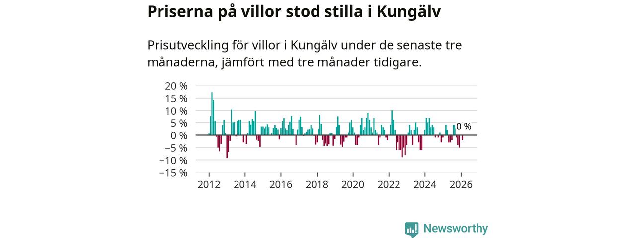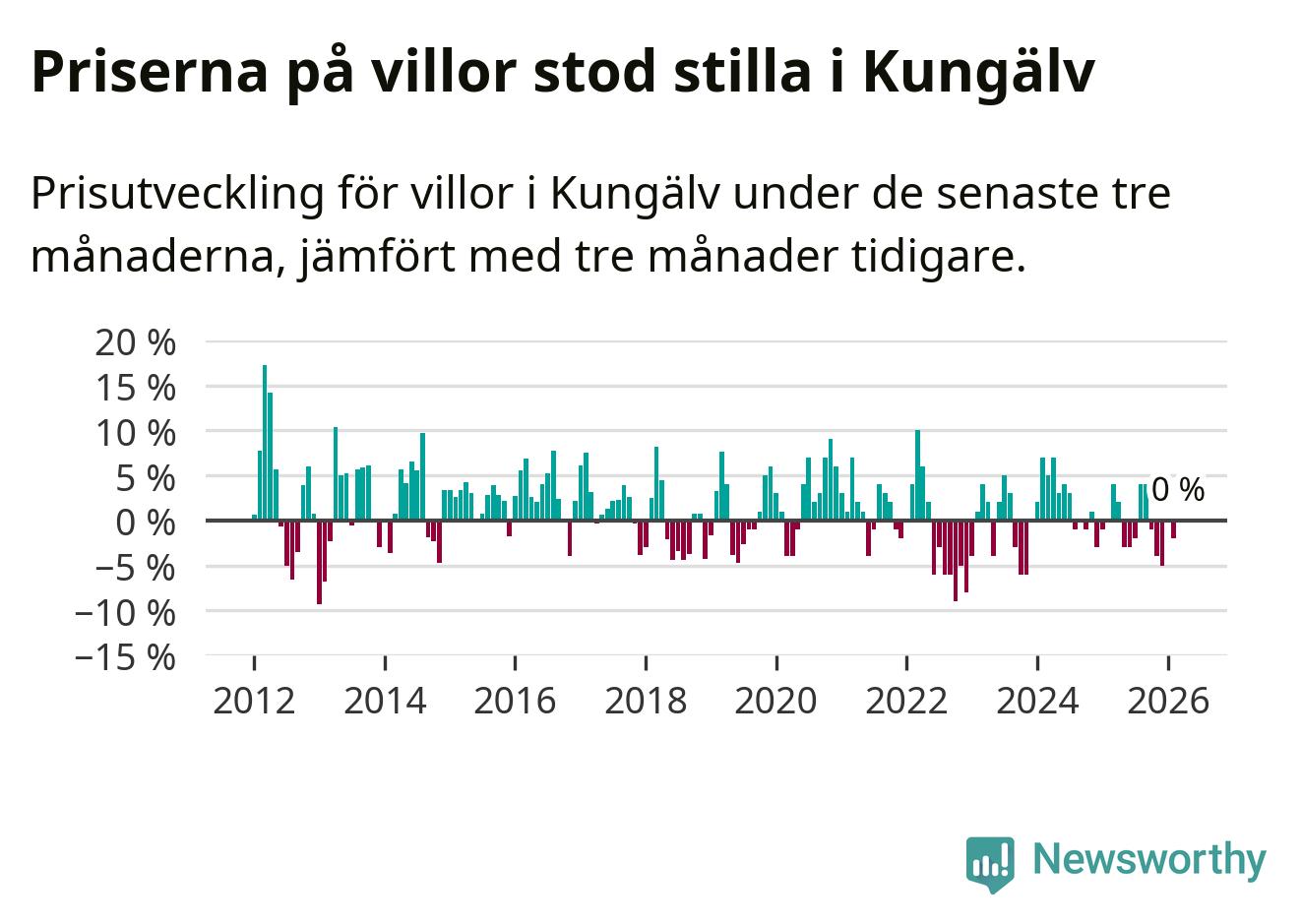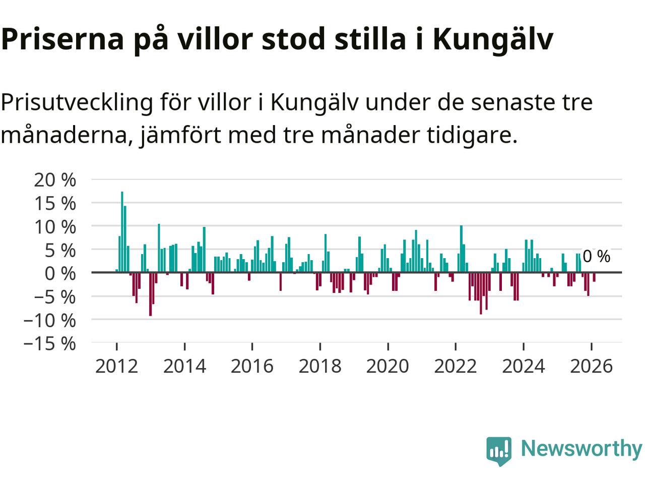 Villapriserna står i stort sett stilla i Kungälvs kommun. Medelpriset på de på försäljningarna under de senaste tre månaderna låg på samma nivå som för tre månader sedan.