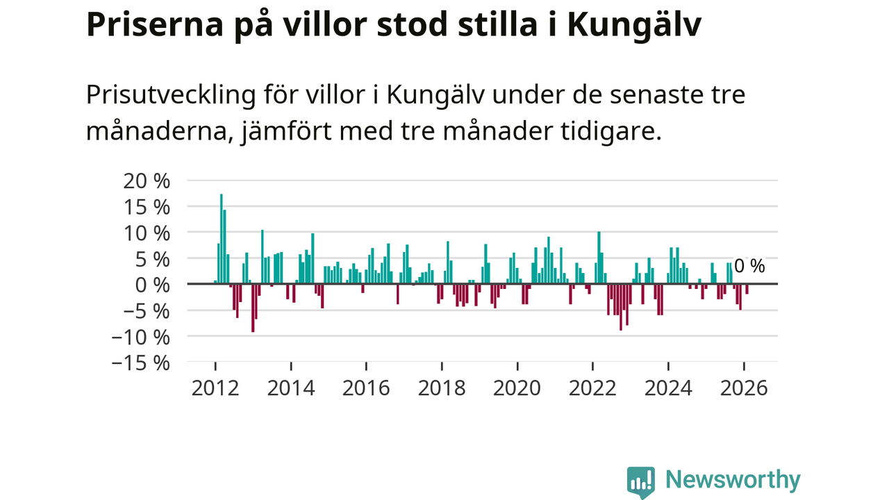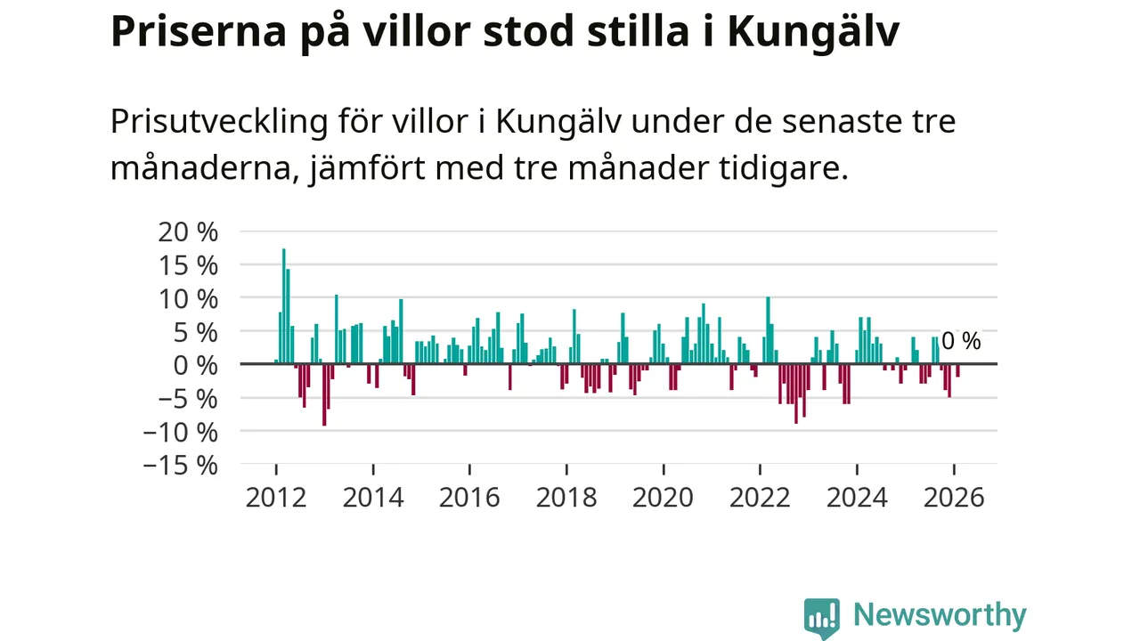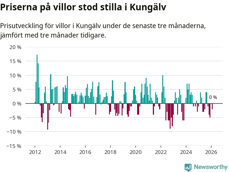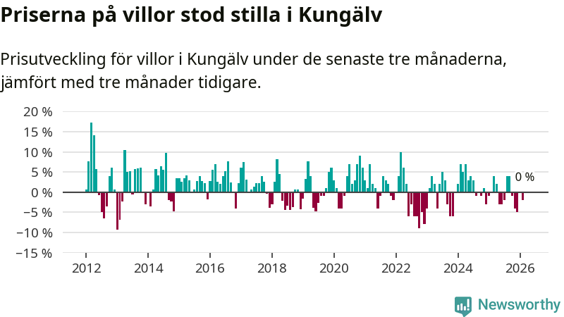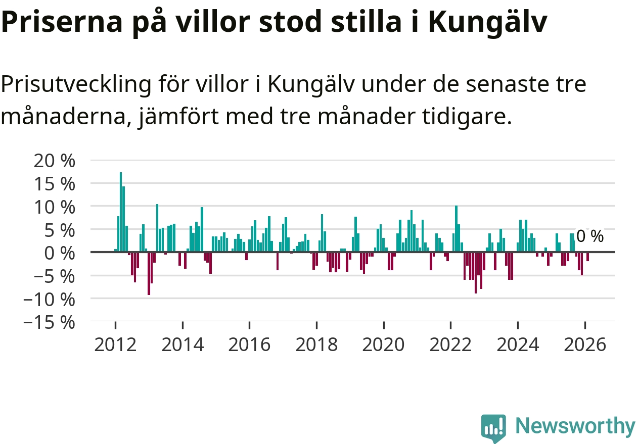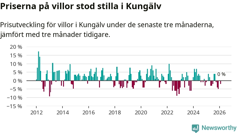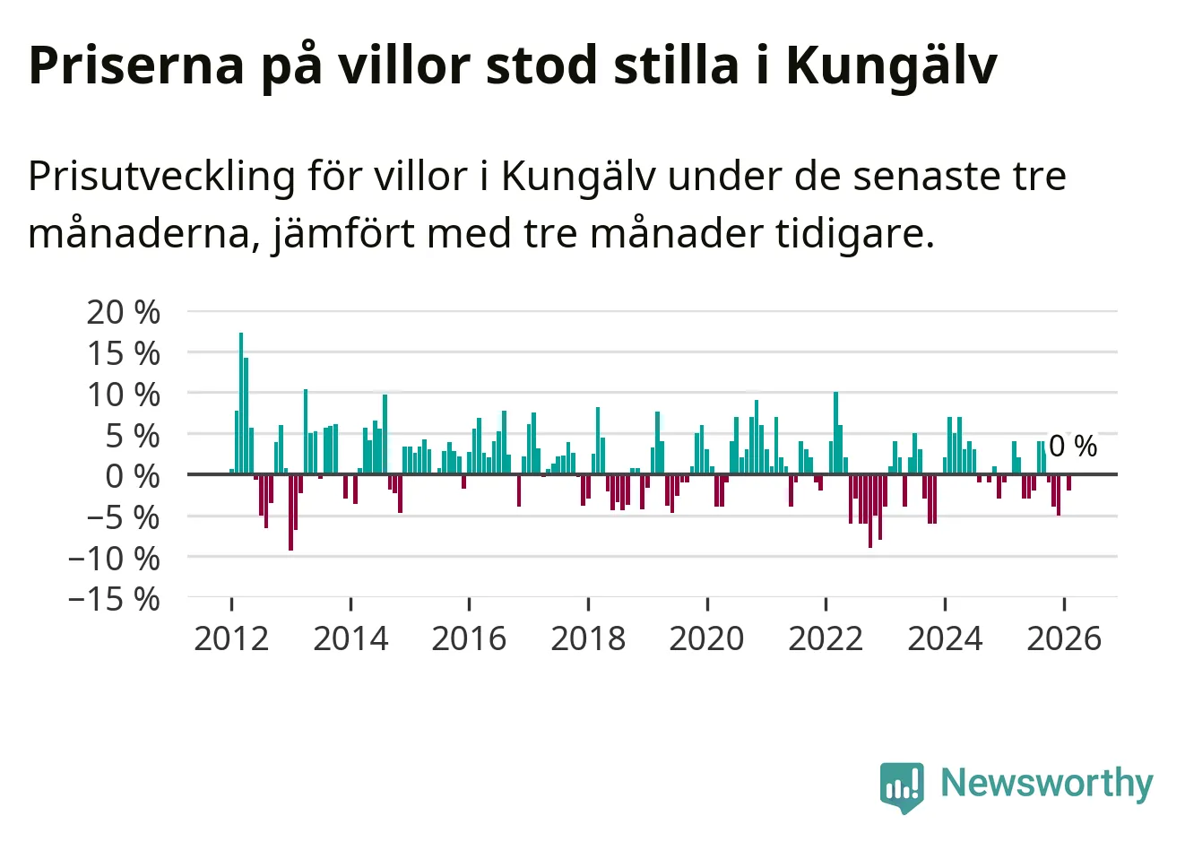Villapriserna står i stort sett stilla i Kungälvs kommun. Medelpriset på de på försäljningarna under de senaste tre månaderna låg på samma nivå som för tre månader sedan.