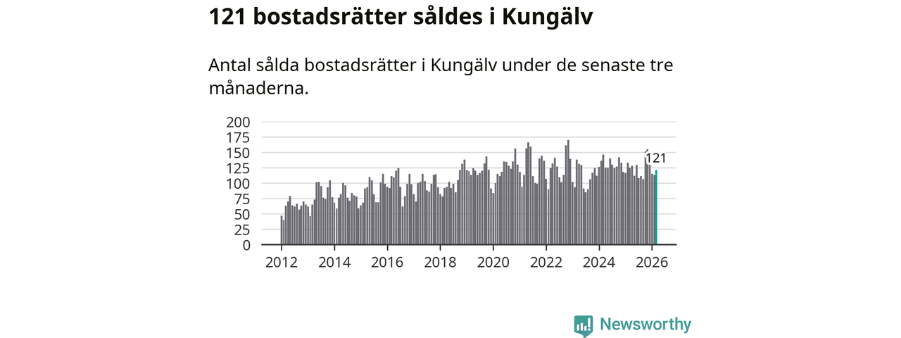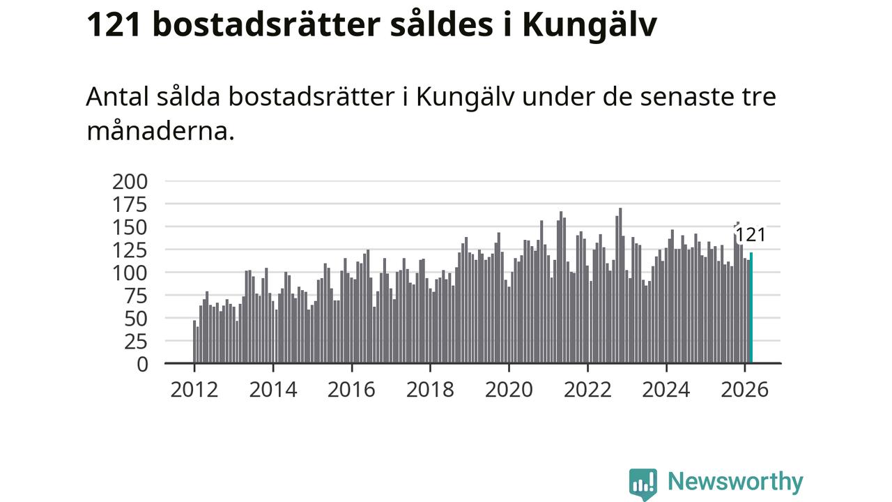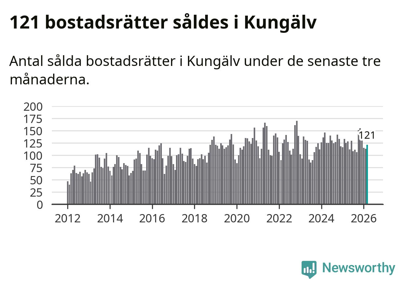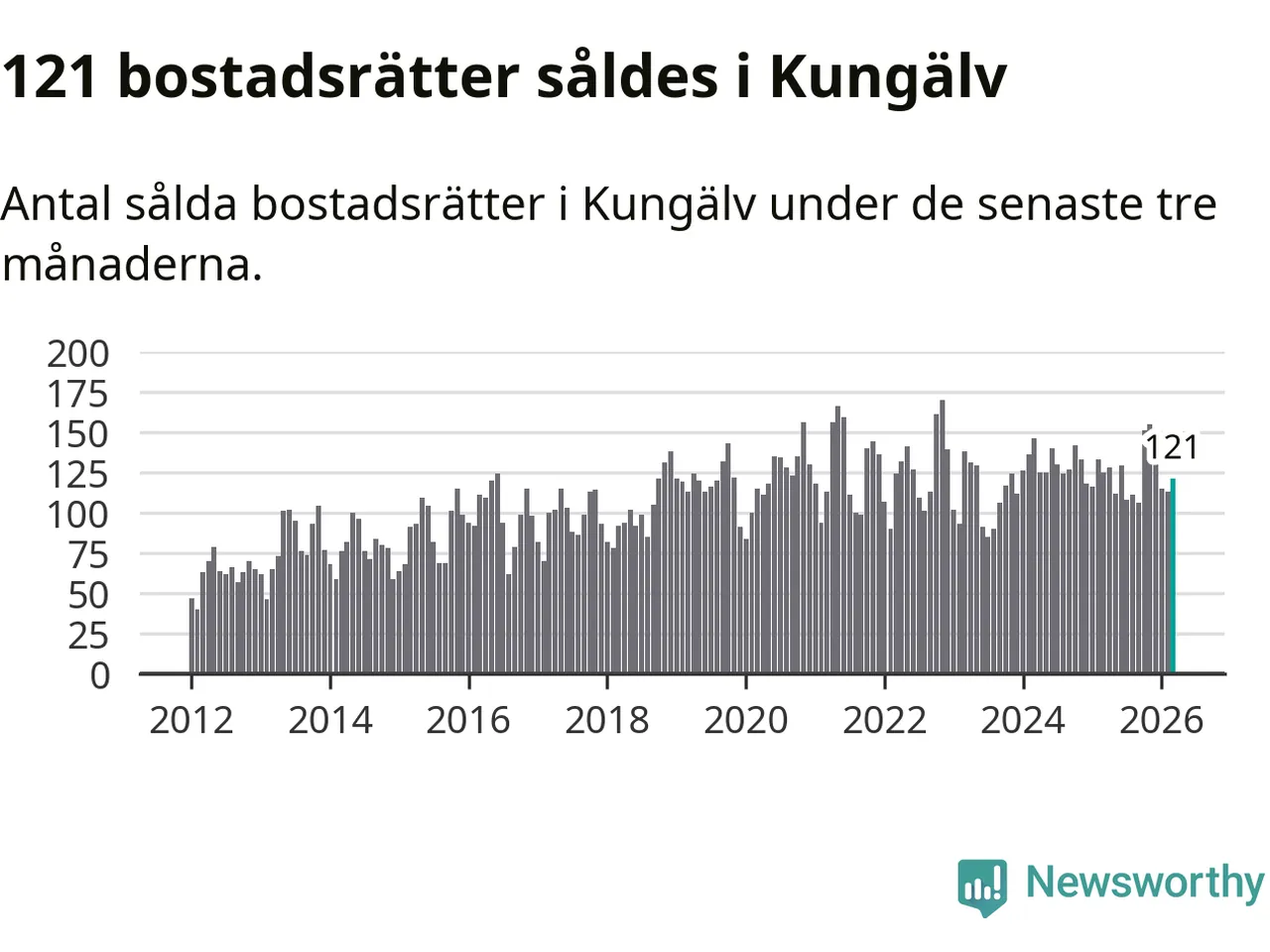 Sammanlagt såldes 121 bostadsrätter i Kungälvs kommun mellan januari och mars till ett genomsnittligt pris på 2,5 miljoner kronor. I fjol gjordes 125 affärer vid den här tiden på året.