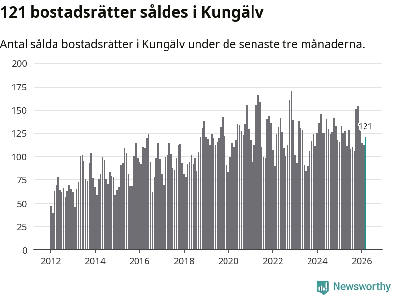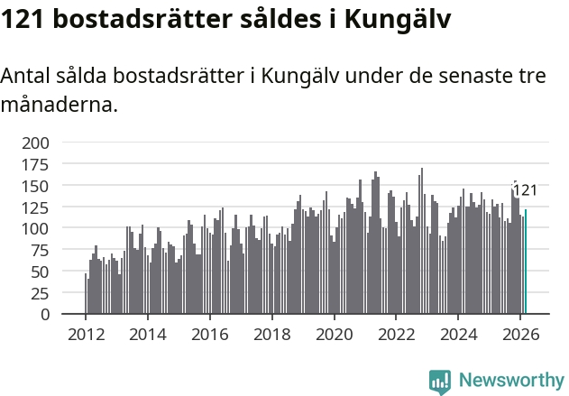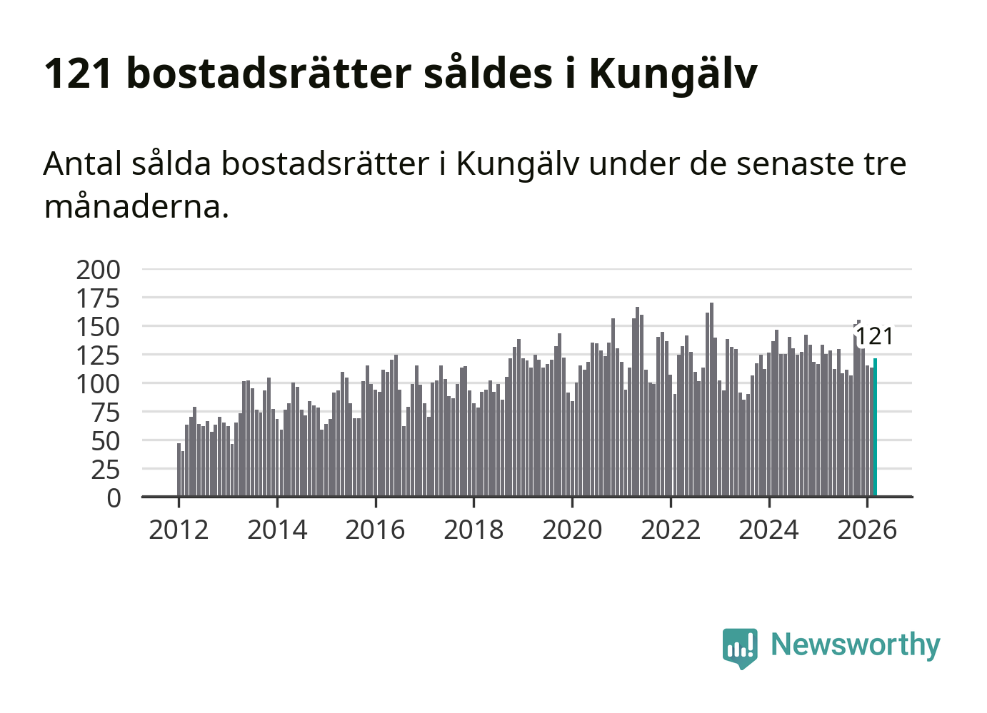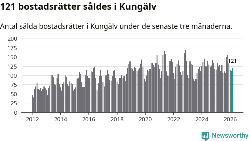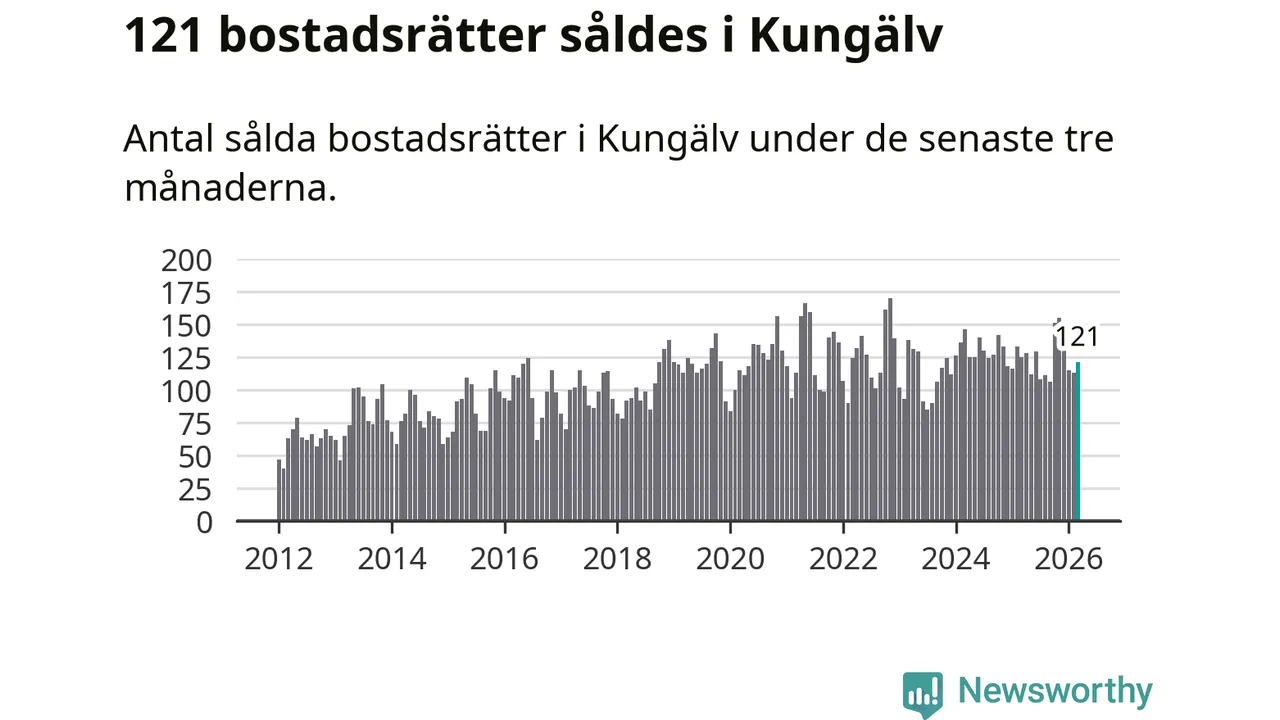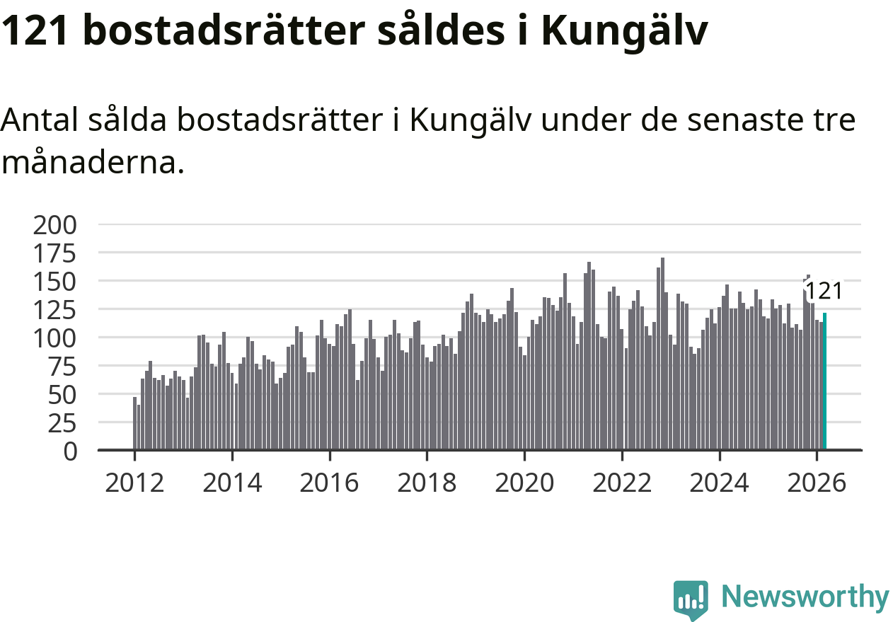 Sammanlagt såldes 121 bostadsrätter i Kungälvs kommun mellan januari och mars till ett genomsnittligt pris på 2,5 miljoner kronor. I fjol gjordes 125 affärer vid den här tiden på året.