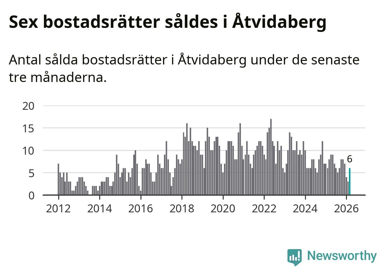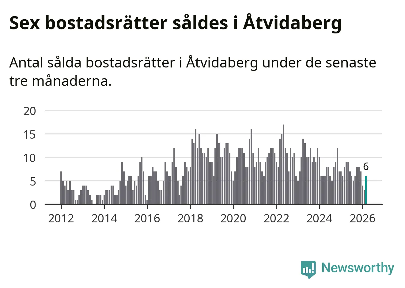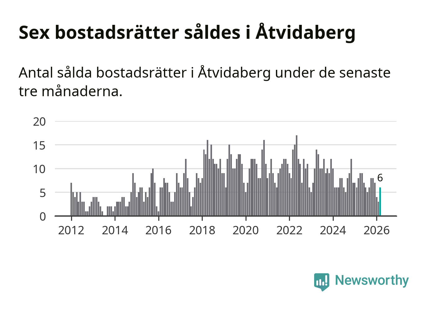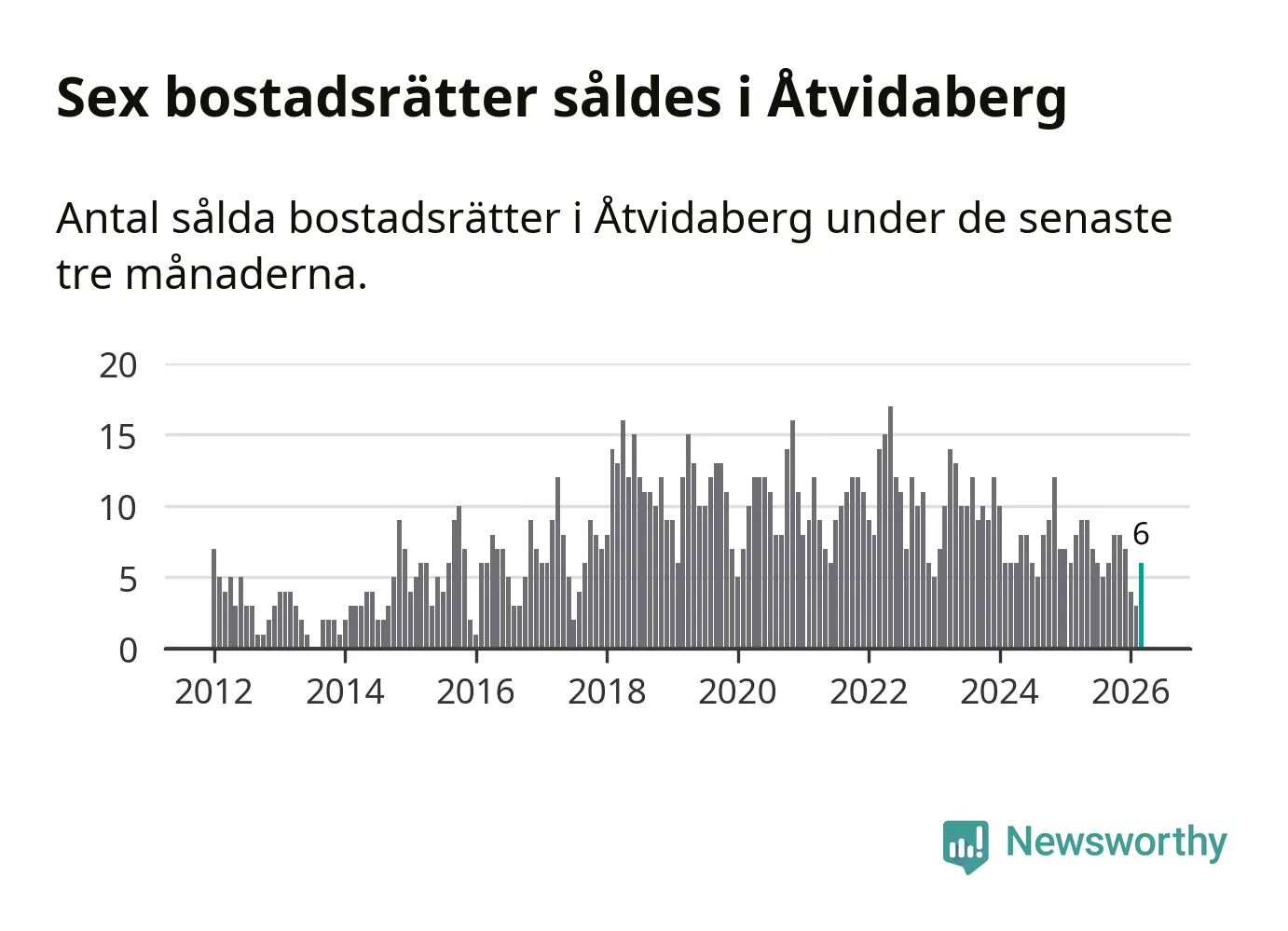 Mellan januari och mars gjordes sammanlagt sex affärer med bostadsrätter i Åtvidabergs kommun. Det kan jämföras med åtta vid motsvarande tid i fjol.