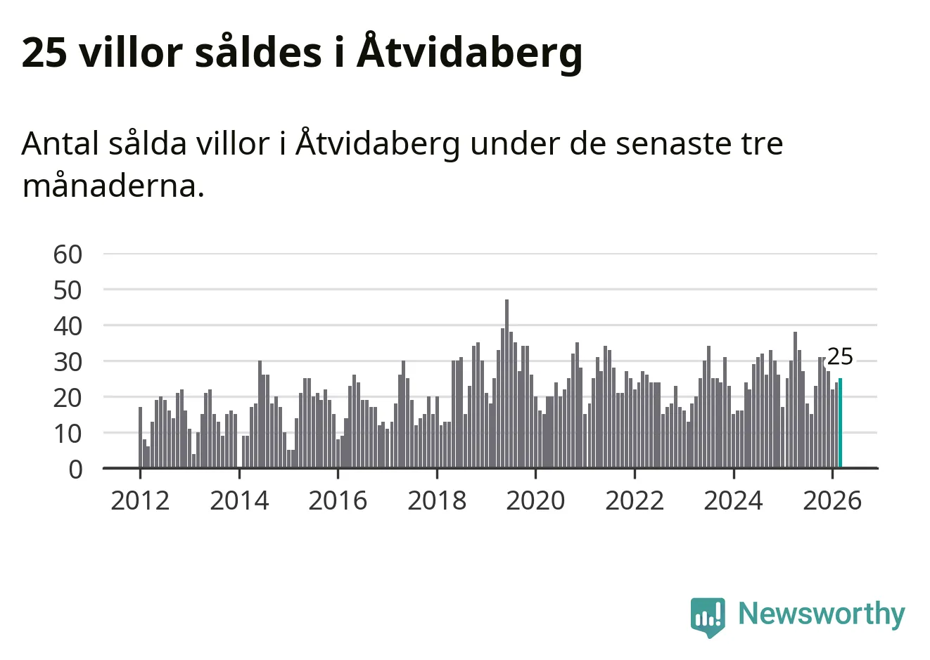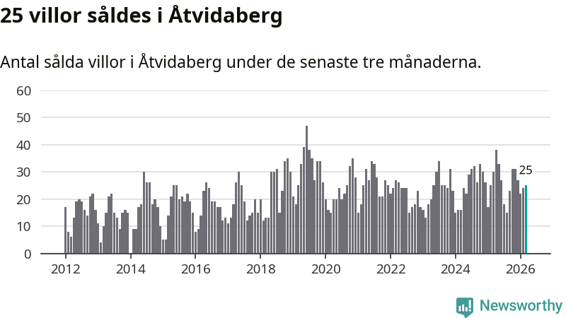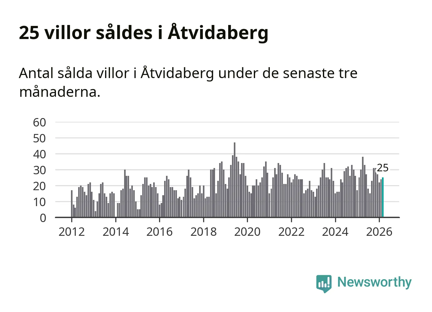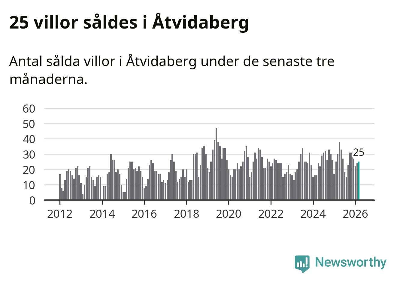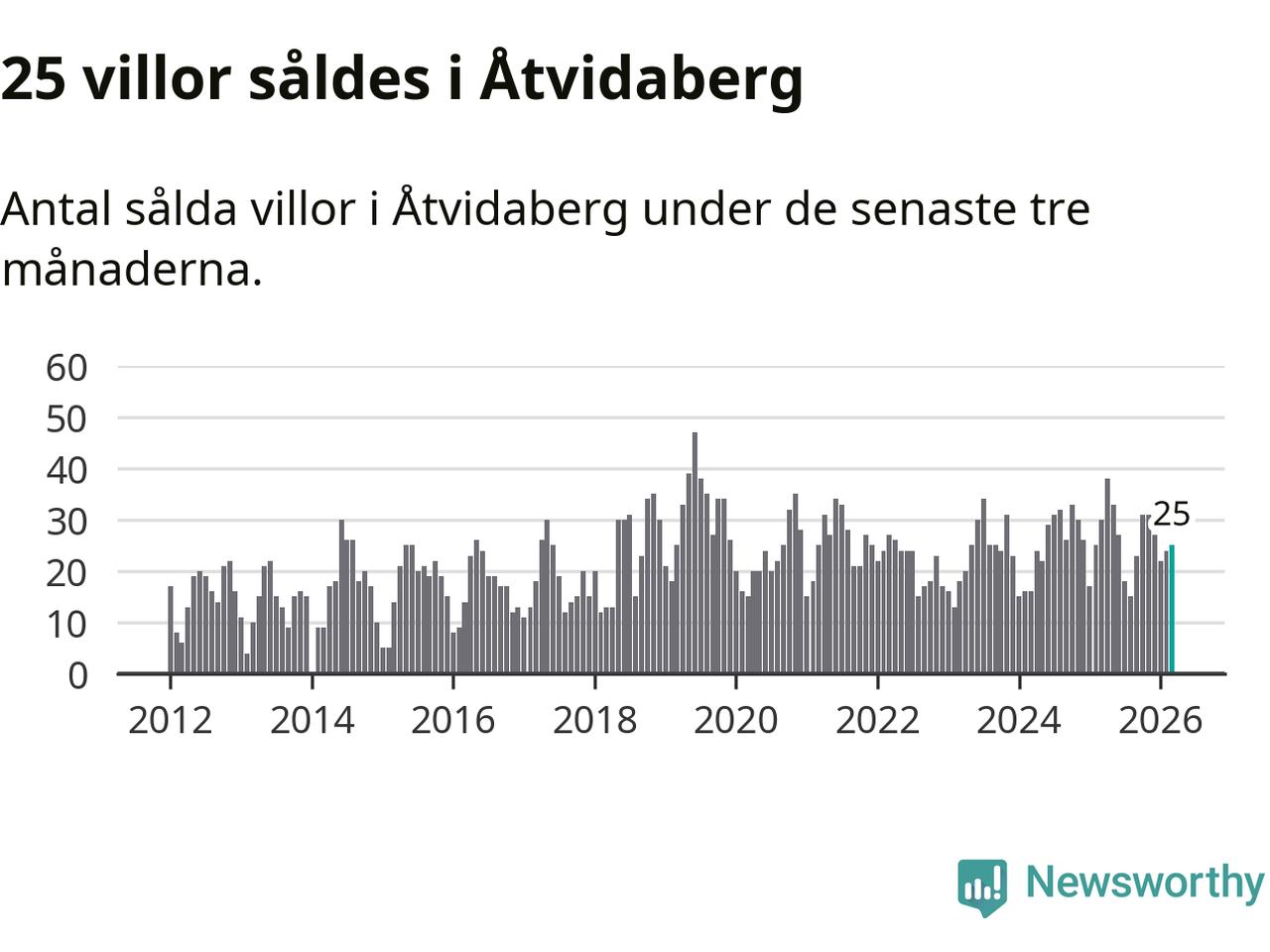 Mellan januari och mars gjordes sammanlagt 25 affärer med villor i Åtvidabergs kommun. Det kan jämföras med 30 vid motsvarande tid i fjol.