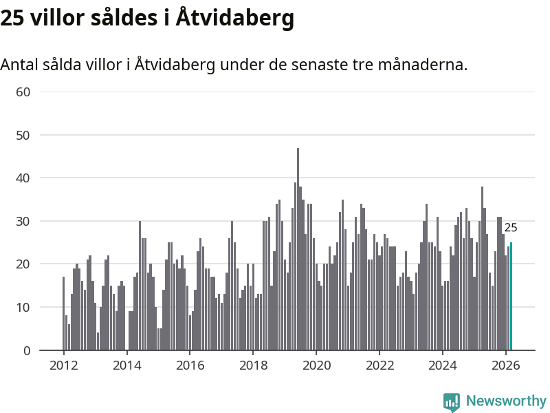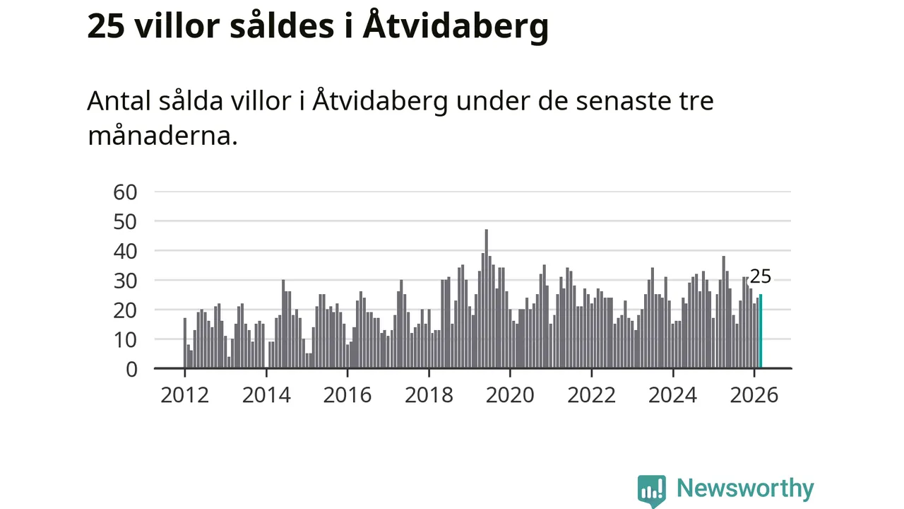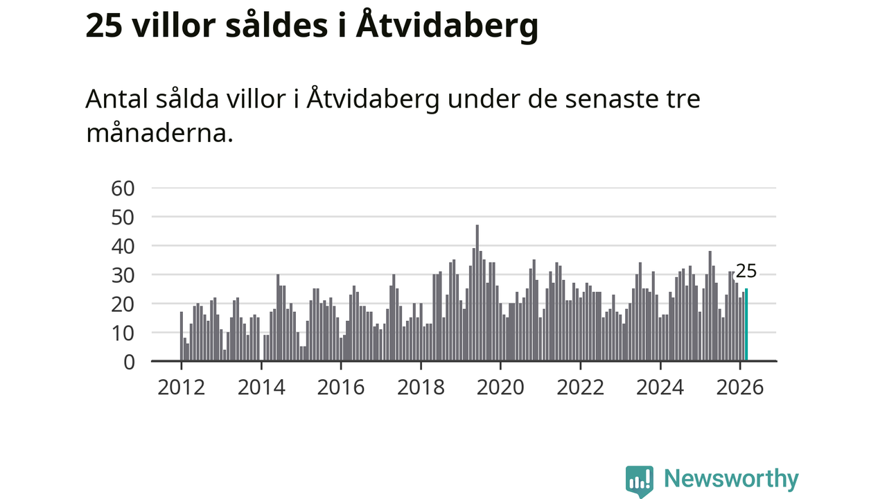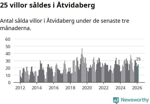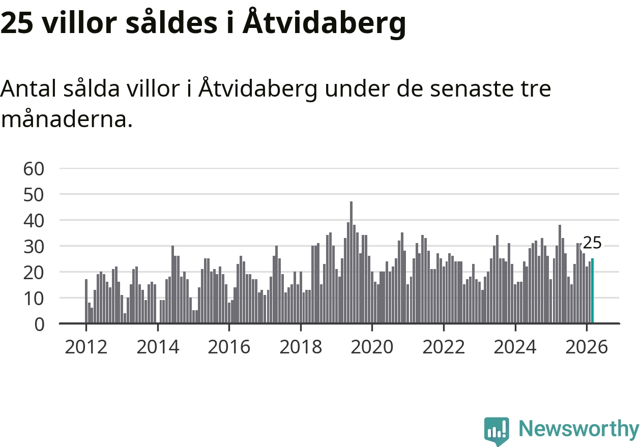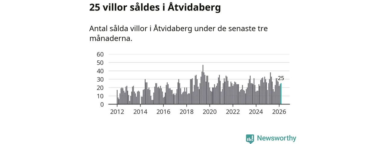 Mellan januari och mars gjordes sammanlagt 25 affärer med villor i Åtvidabergs kommun. Det kan jämföras med 30 vid motsvarande tid i fjol.