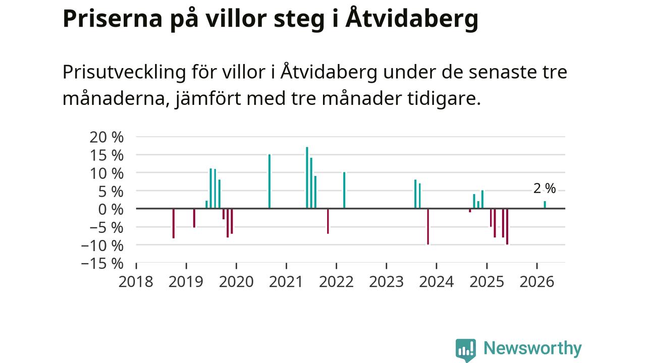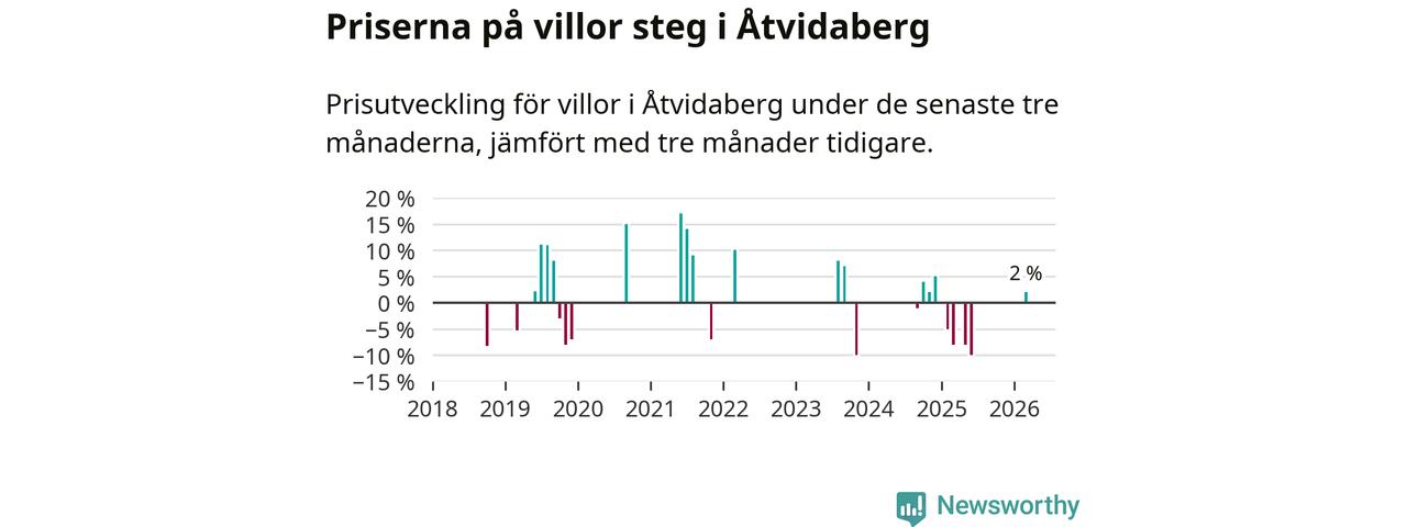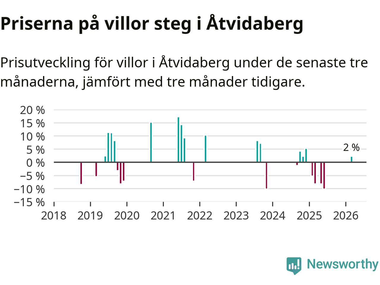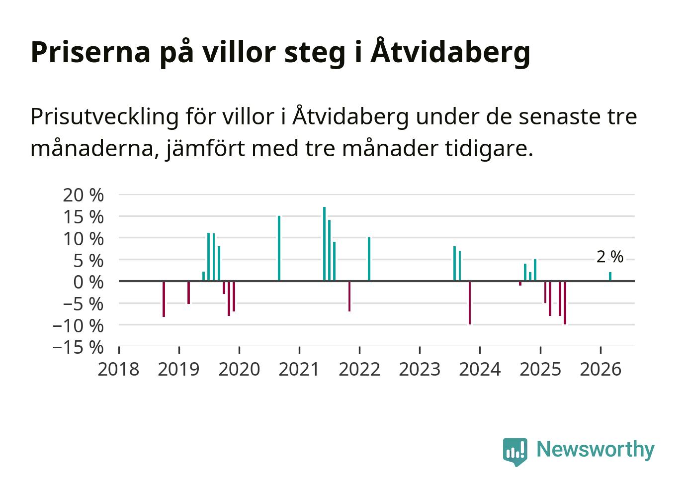 Statistiken visar även på en prisuppgång i Åtvidabergs kommun. Medelpriset på försäljningarna av villor i kommunen var 2 procent högre än för tre månader sedan. I hela Östergötland däremot ligger villapriserna stilla.