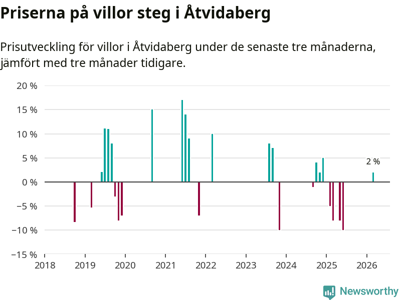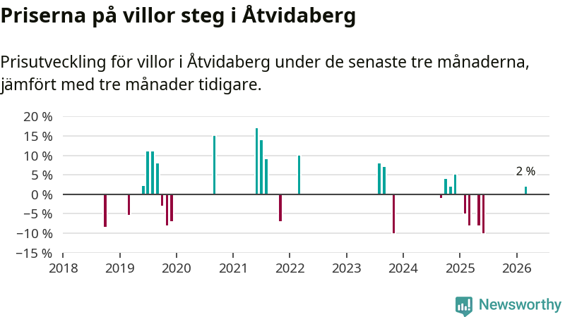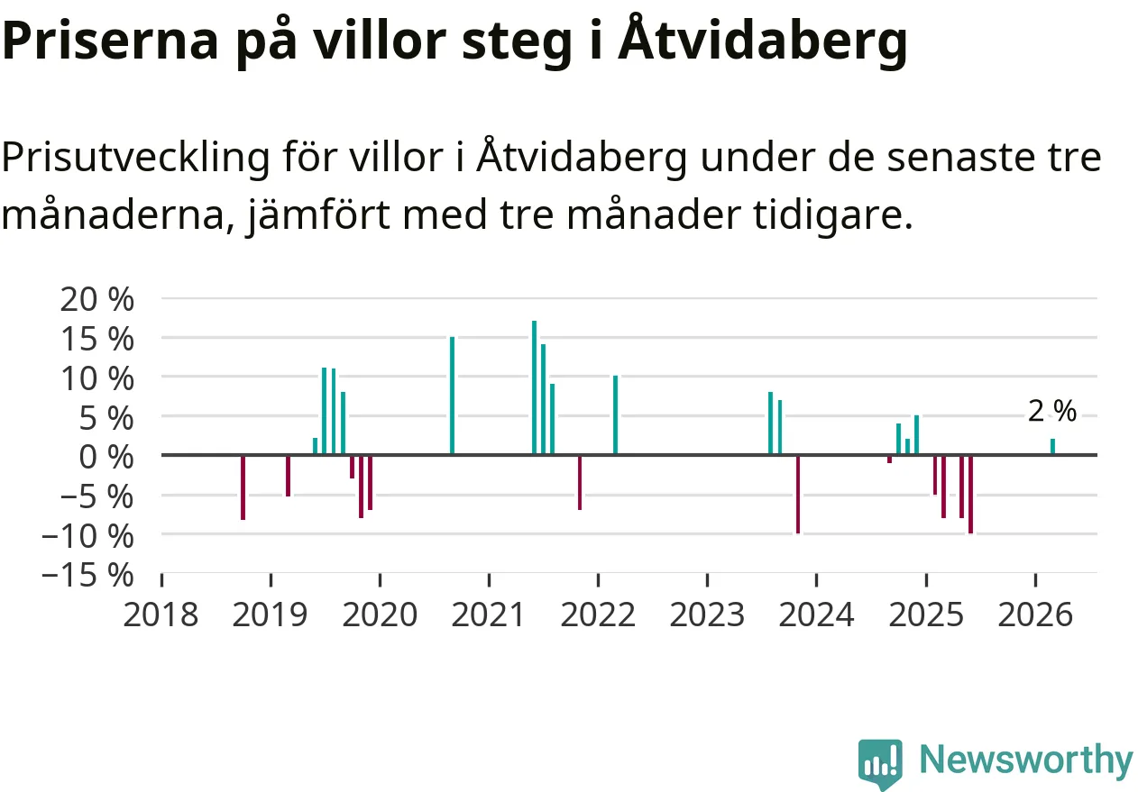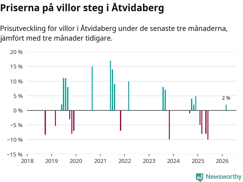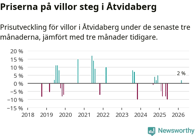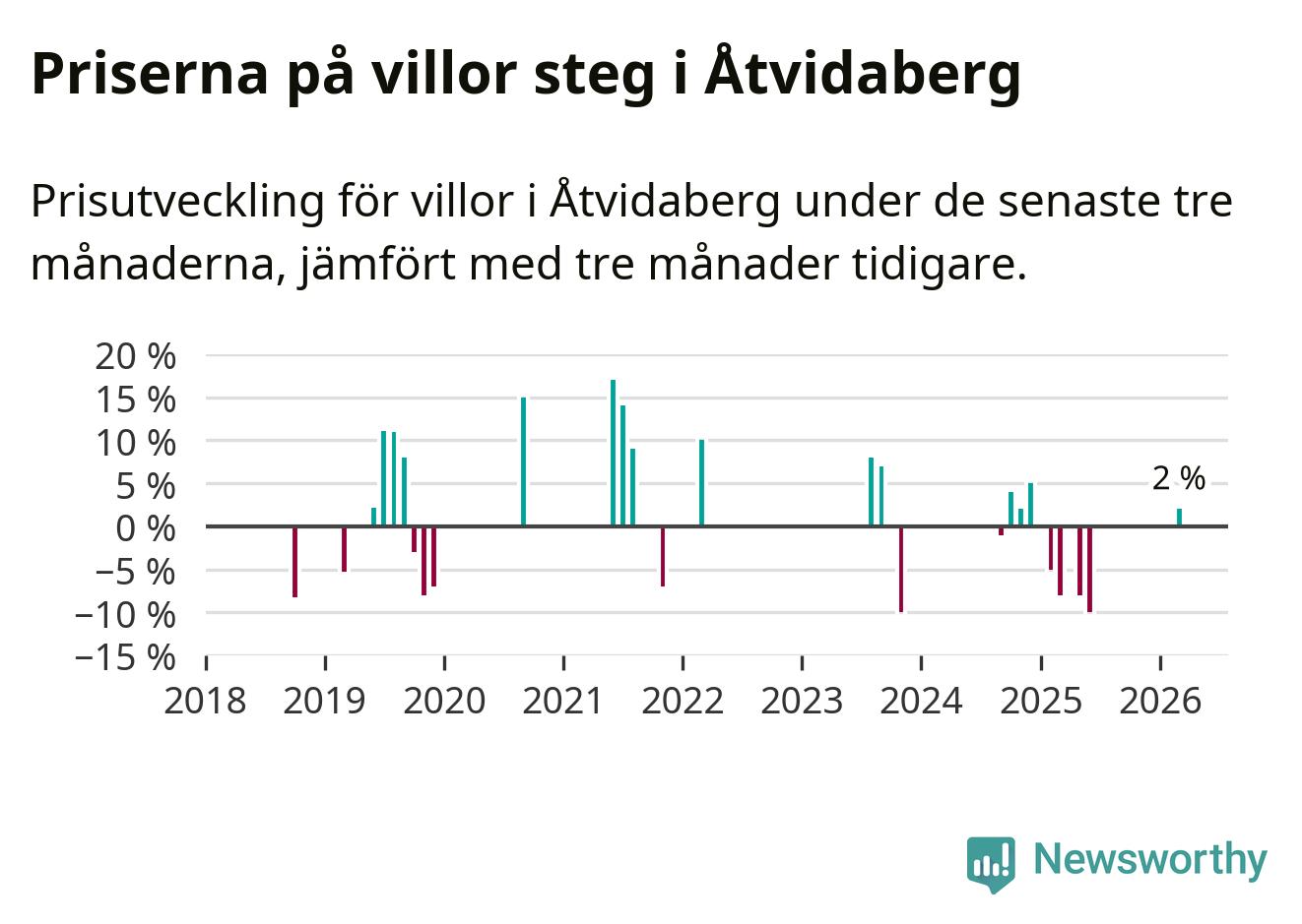 Statistiken visar även på en prisuppgång i Åtvidabergs kommun. Medelpriset på försäljningarna av villor i kommunen var 2 procent högre än för tre månader sedan. I hela Östergötland däremot ligger villapriserna stilla.