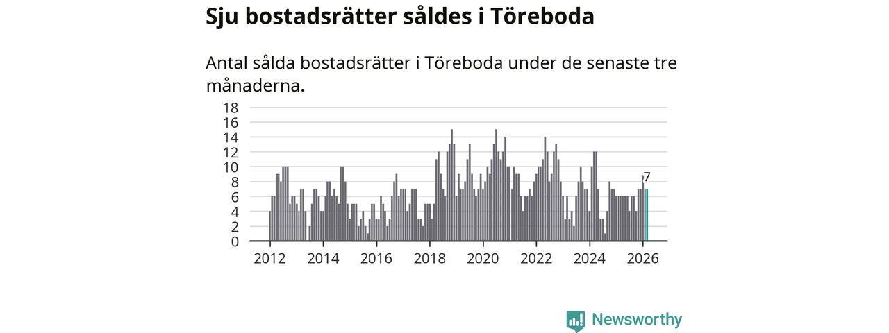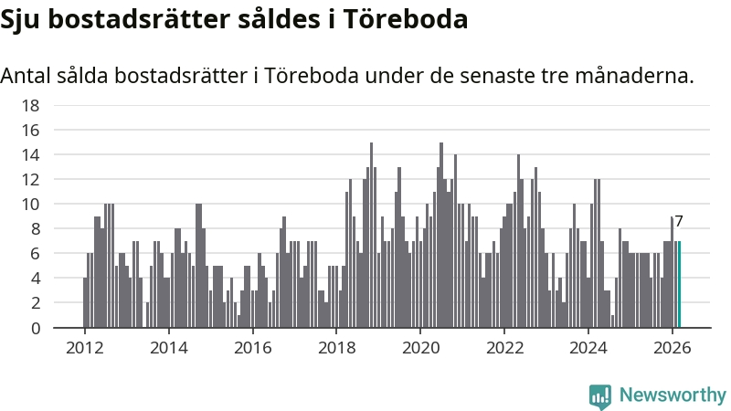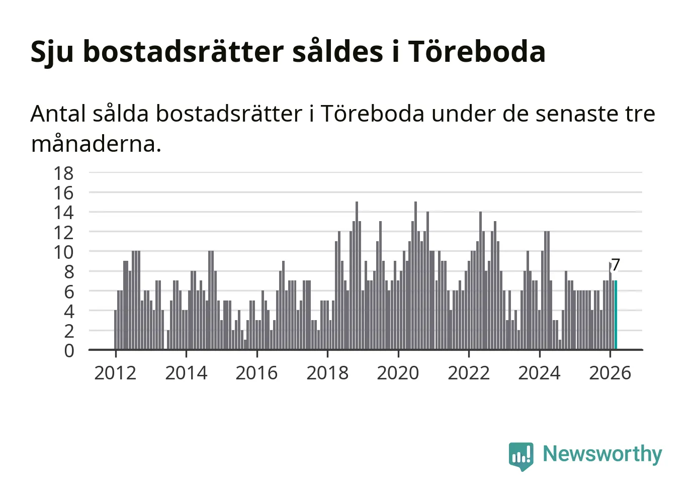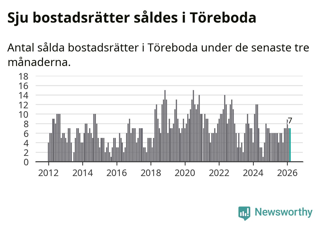 Mellan januari och mars gjordes sammanlagt sju affärer med bostadsrätter i Töreboda kommun. Det kan jämföras med sex vid motsvarande tid i fjol.