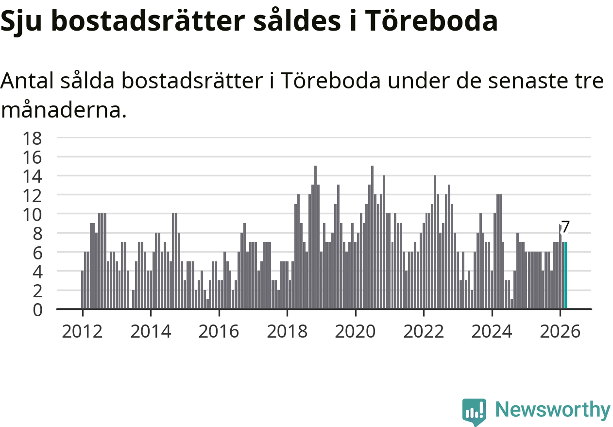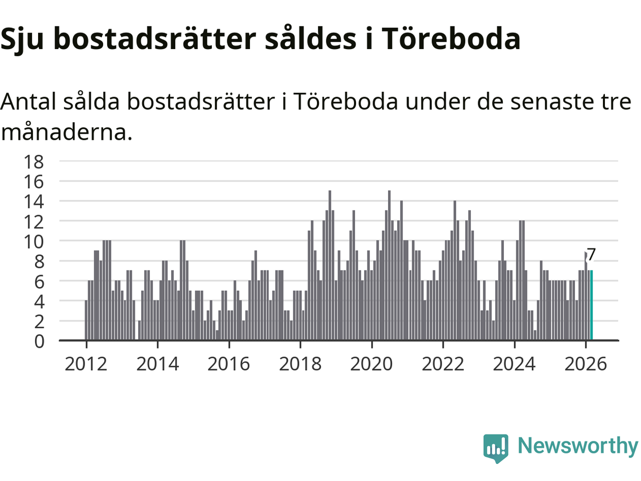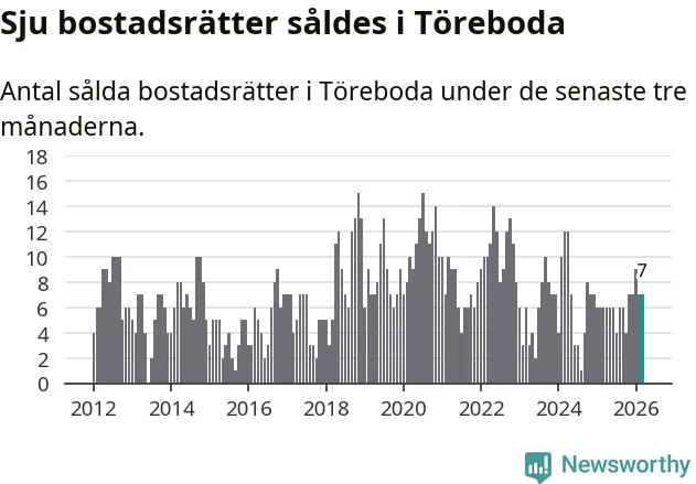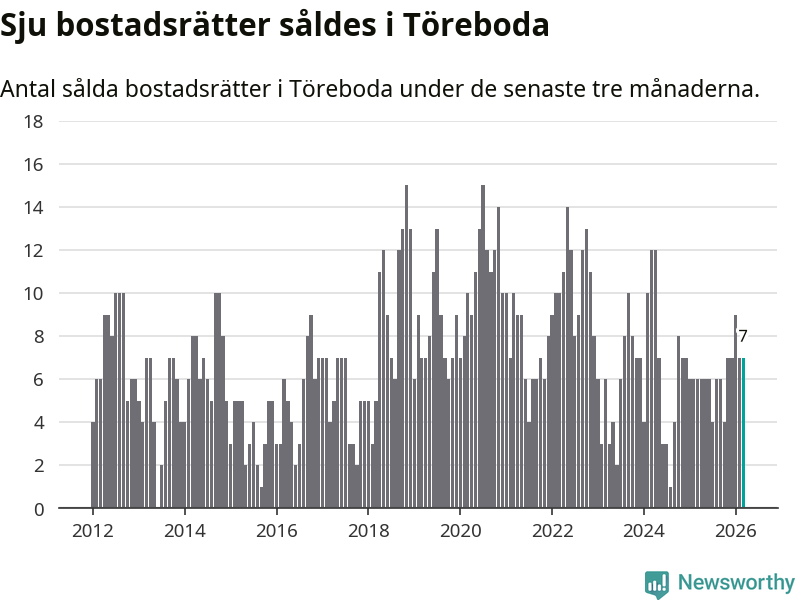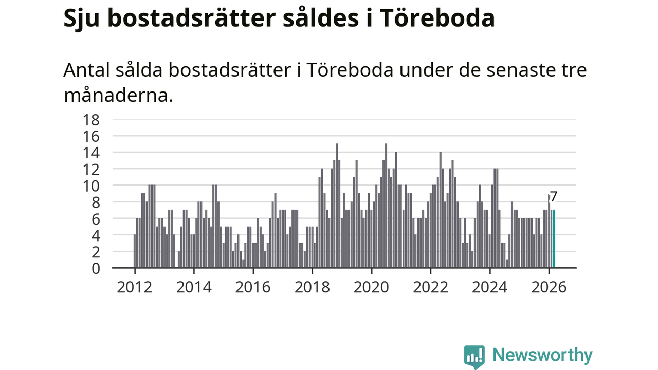 Mellan januari och mars gjordes sammanlagt sju affärer med bostadsrätter i Töreboda kommun. Det kan jämföras med sex vid motsvarande tid i fjol.