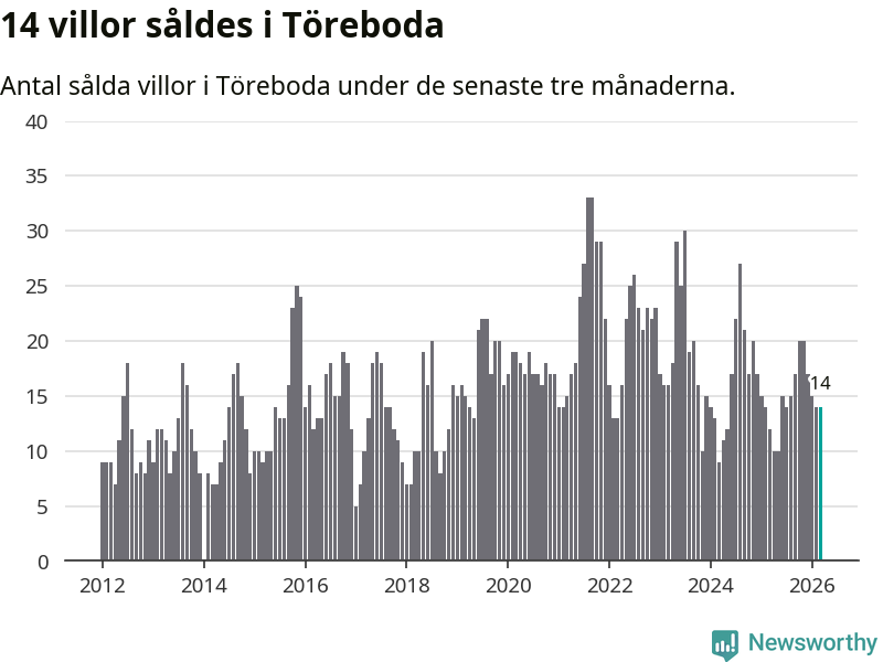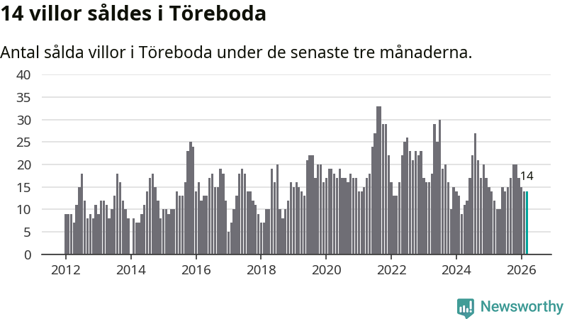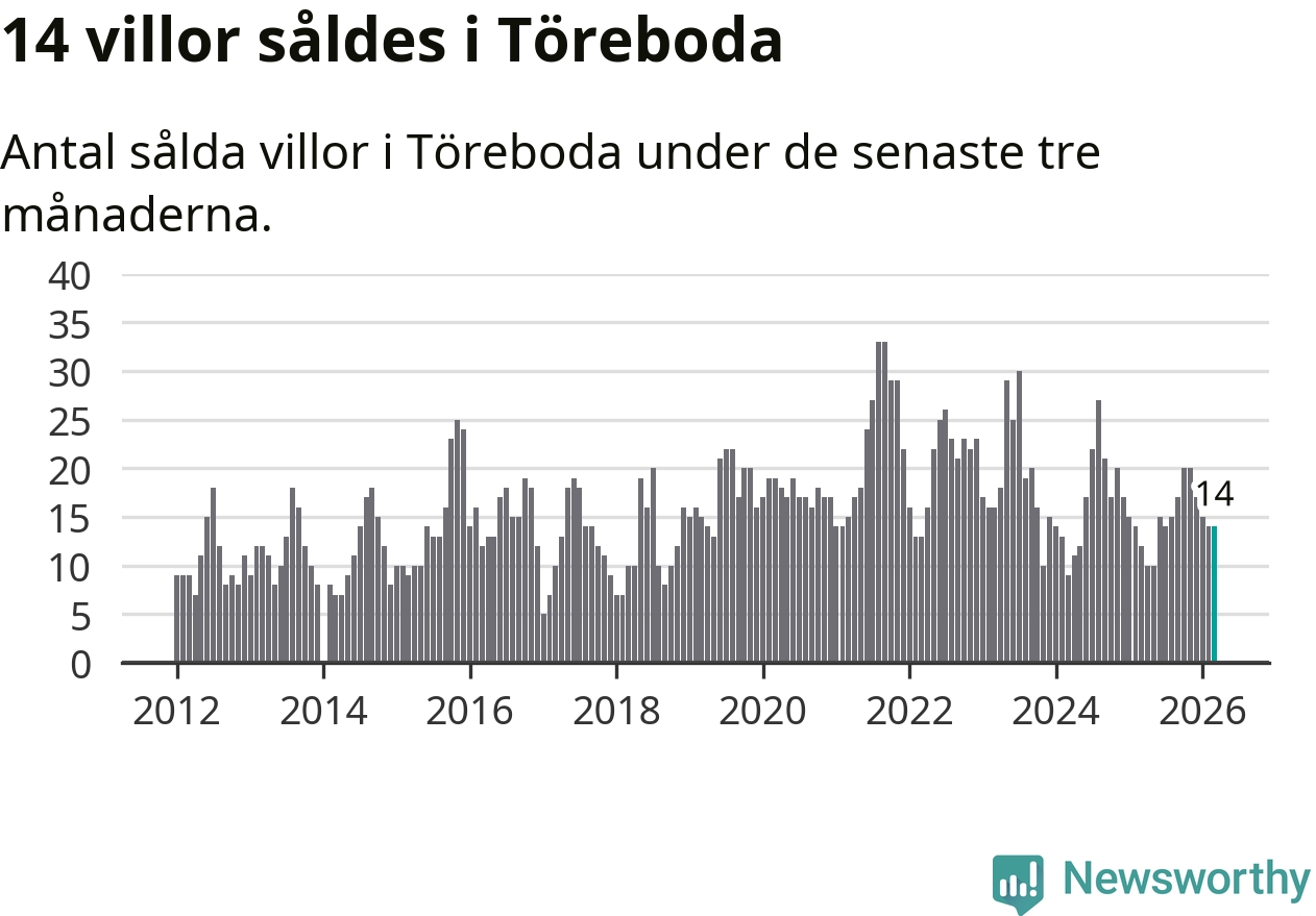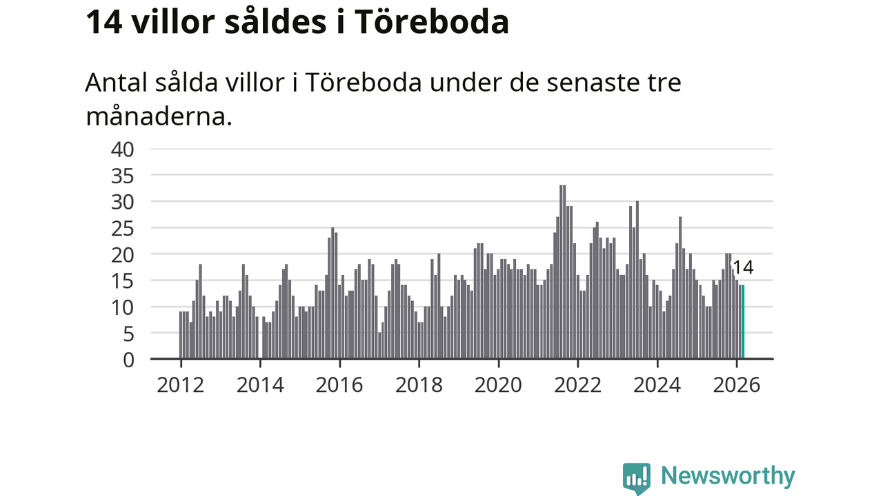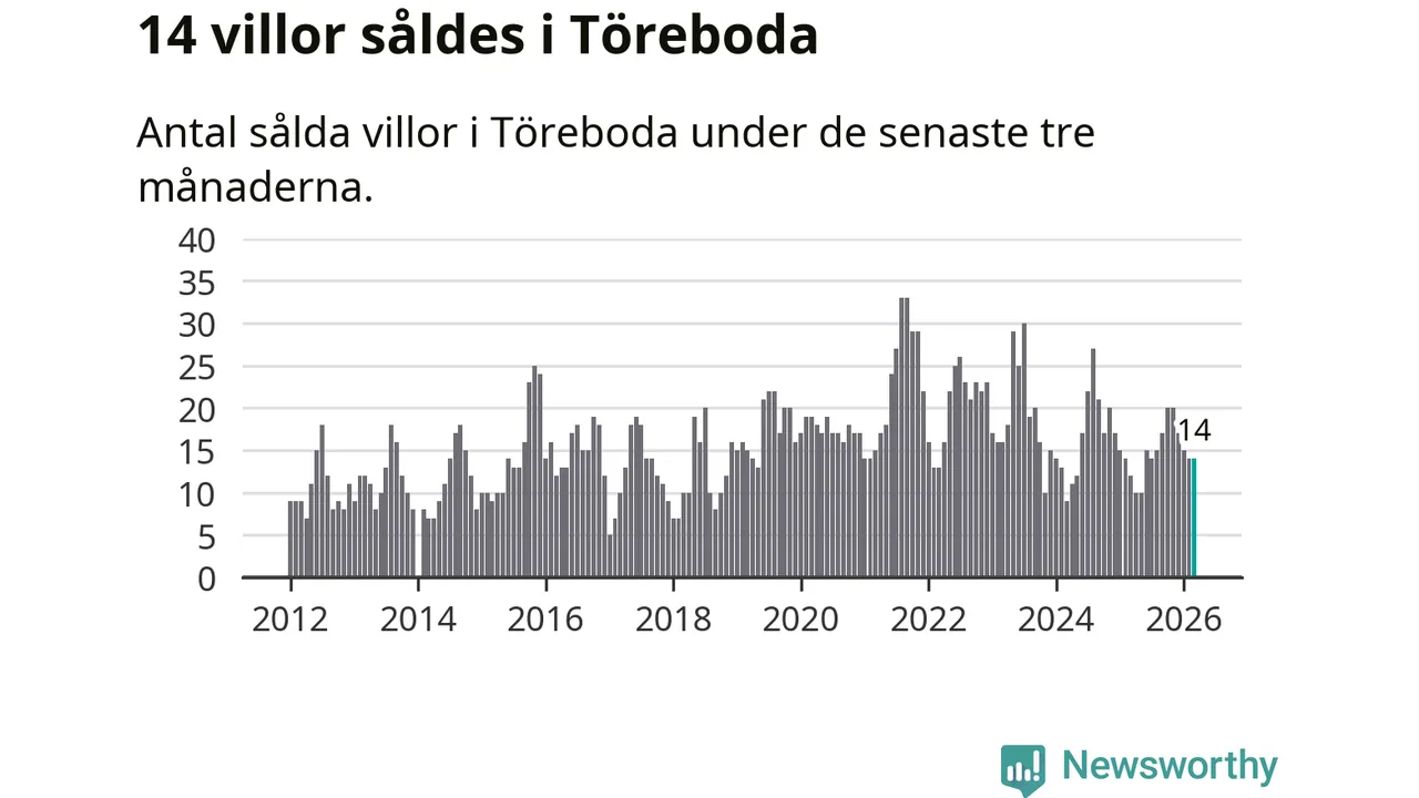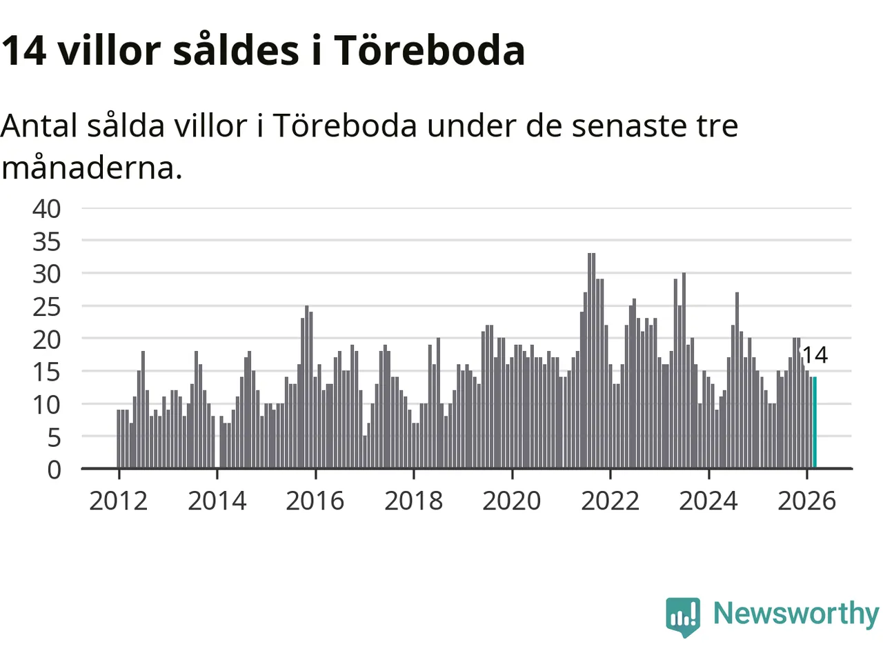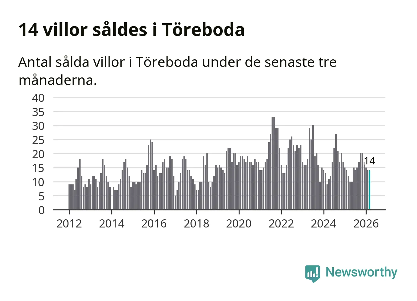 Mellan januari och mars gjordes sammanlagt 14 affärer med villor i Töreboda kommun. Det kan jämföras med tolv vid motsvarande tid i fjol.