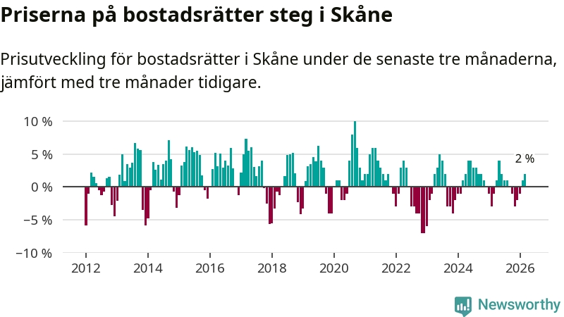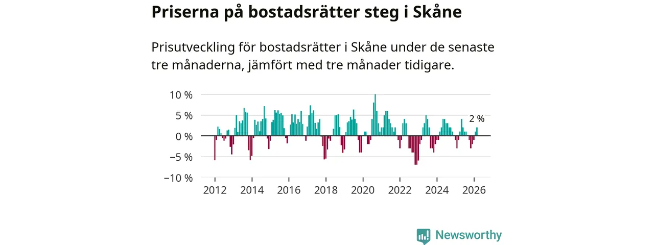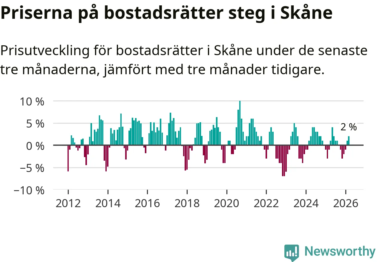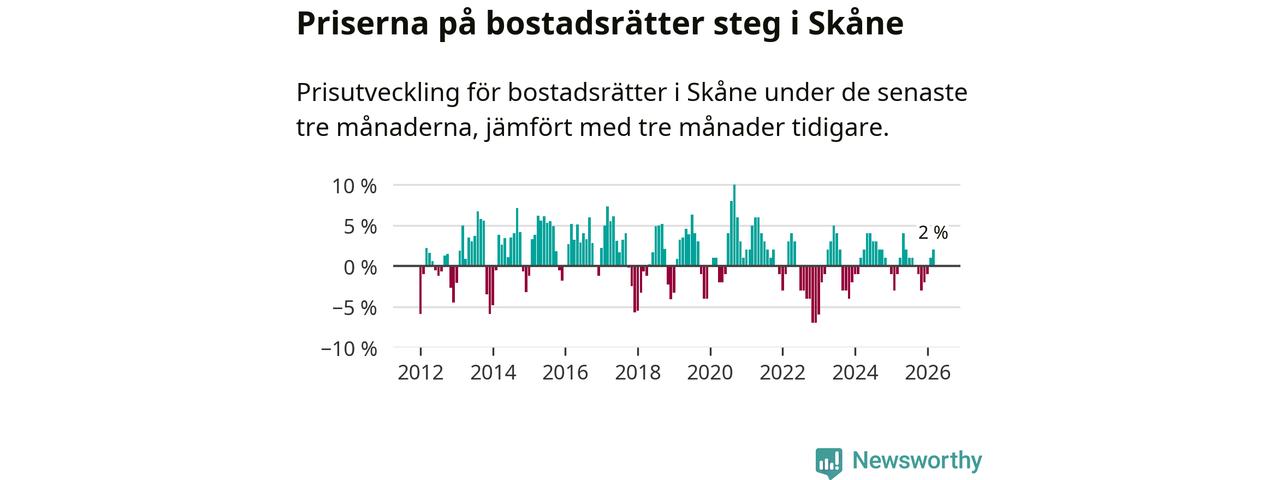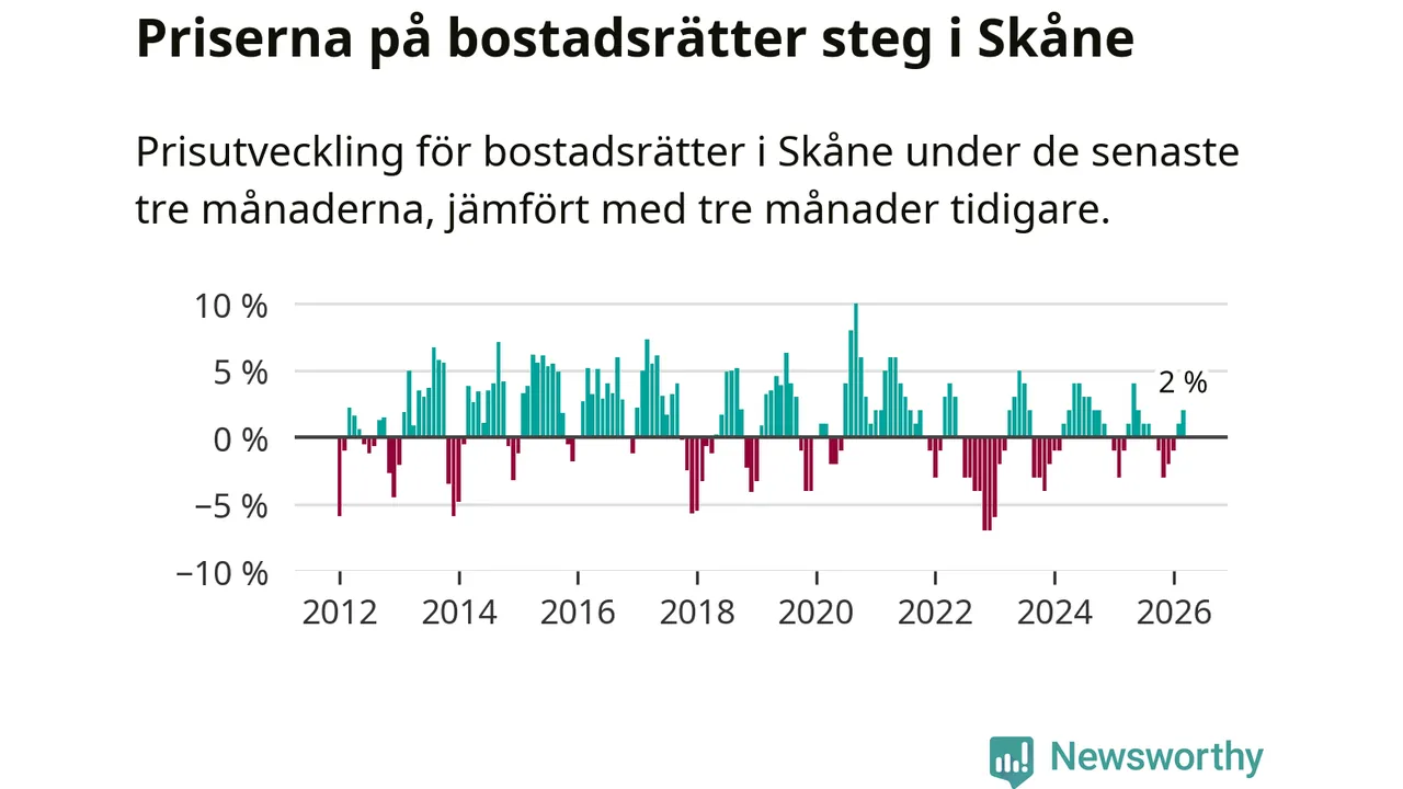 Priserna på bostadsrätter har gått upp i Skåne län. Medelpriset på försäljningarna under de senaste tre månaderna visar på en uppgång med 2 procent.
