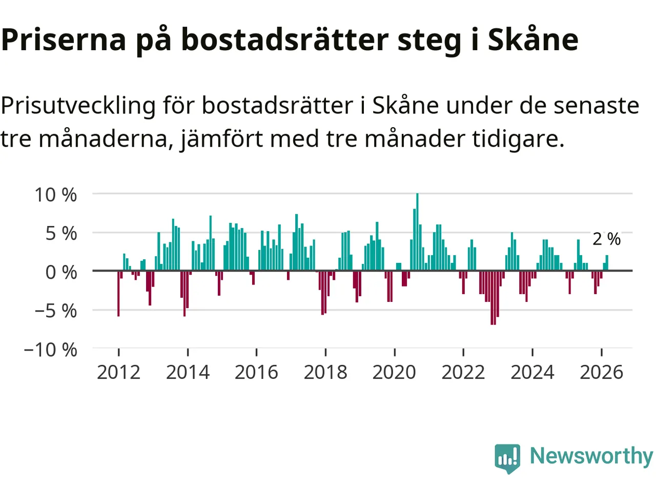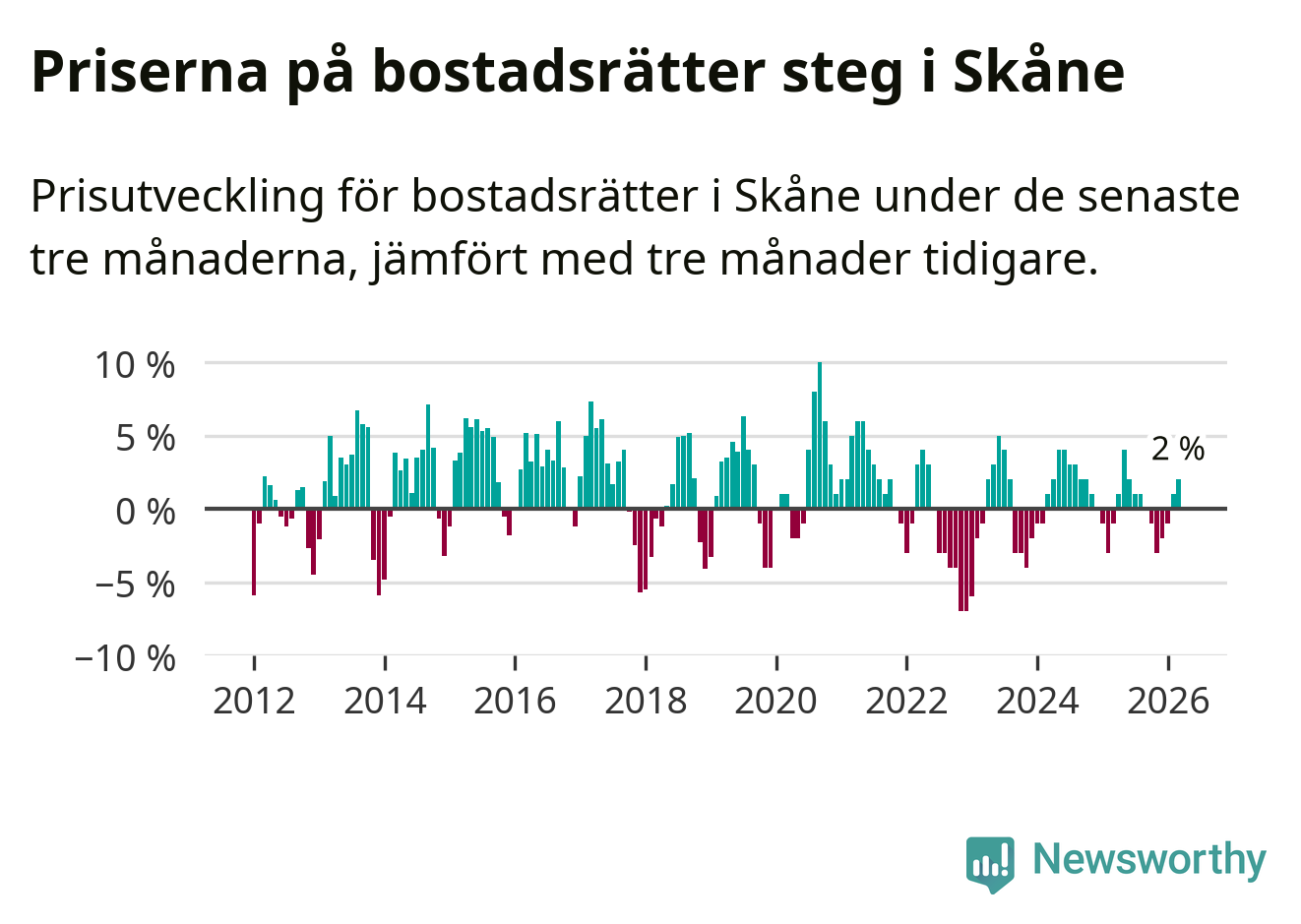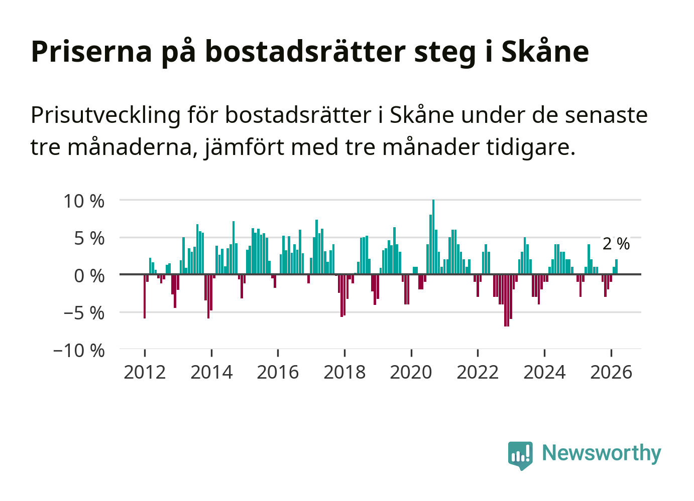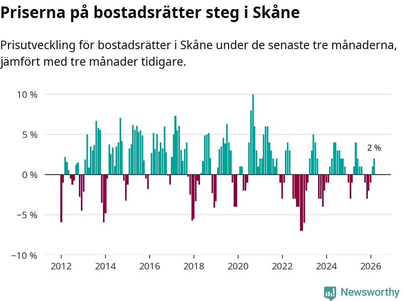 Priserna på bostadsrätter har gått upp i Skåne län. Medelpriset på försäljningarna under de senaste tre månaderna visar på en uppgång med 2 procent.