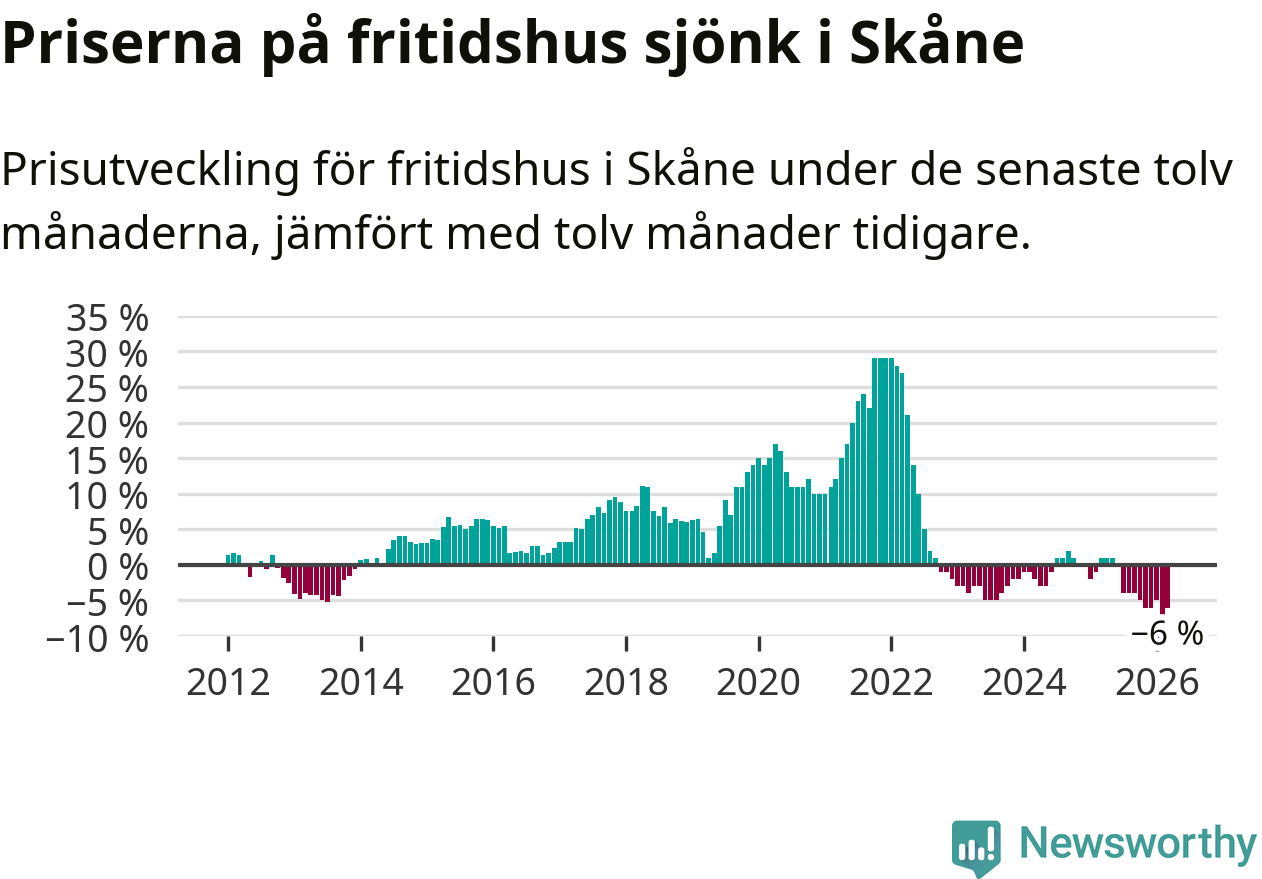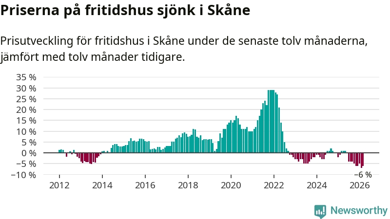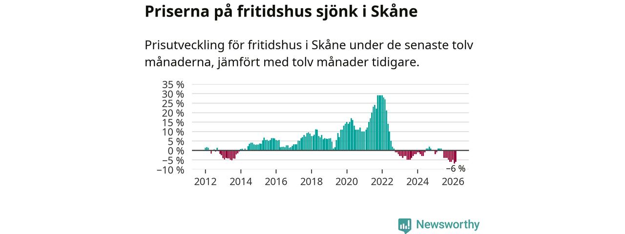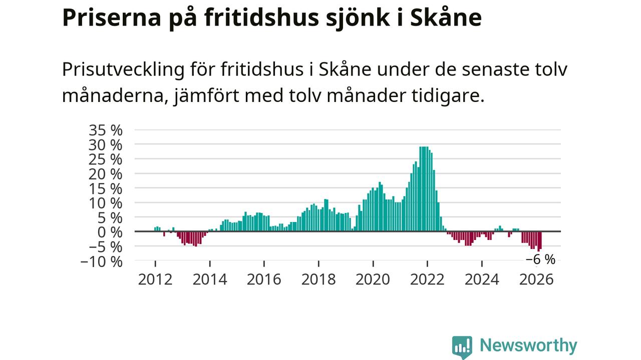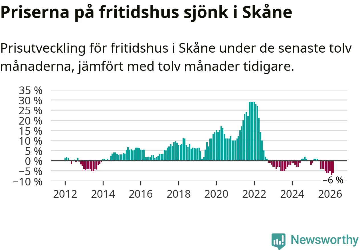 Priserna på fritidshus har gått ner i Skåne län. Medelpriset på försäljningarna under de senaste tolv månaderna visar på en nedgång med 6 procent.