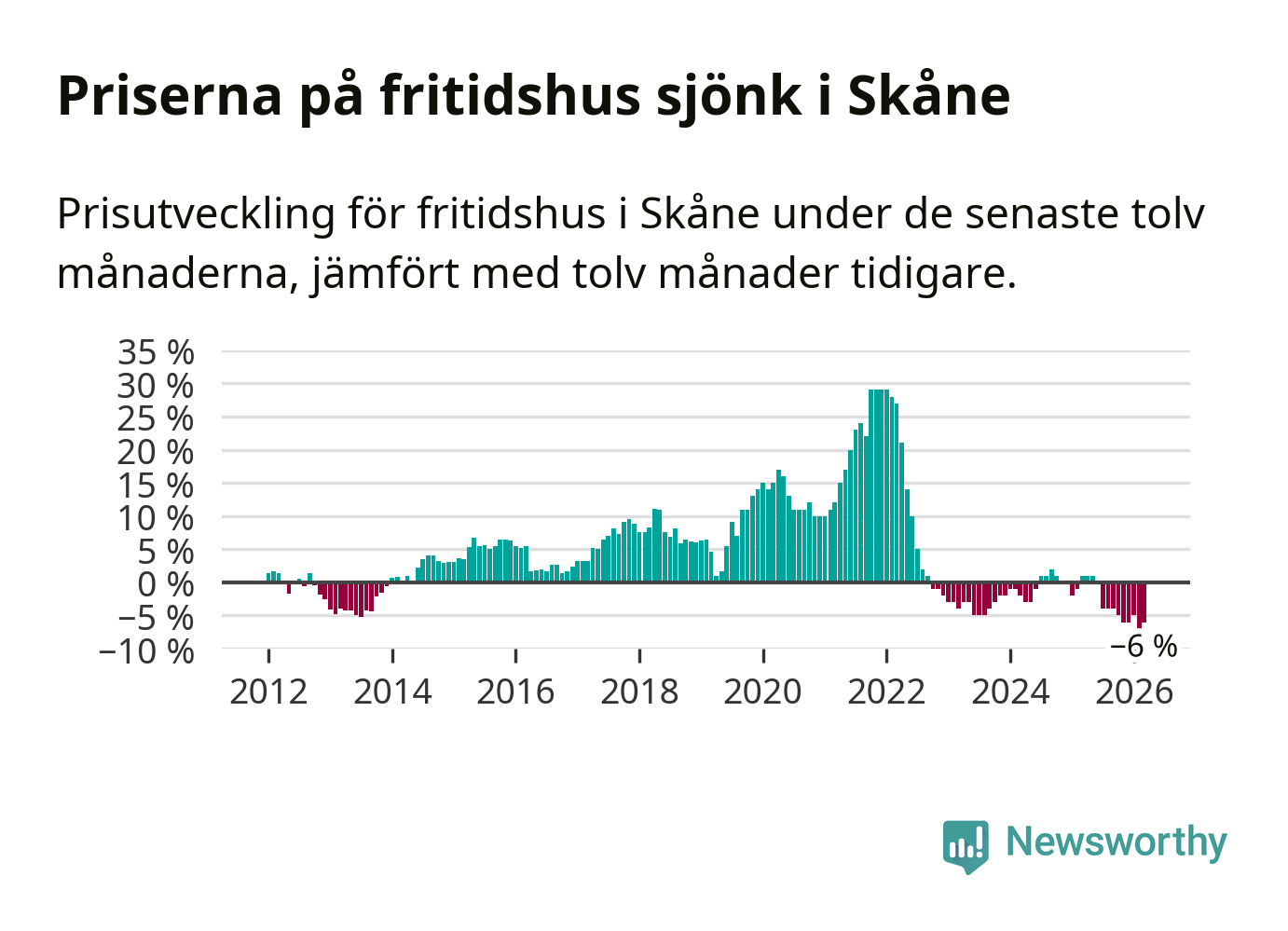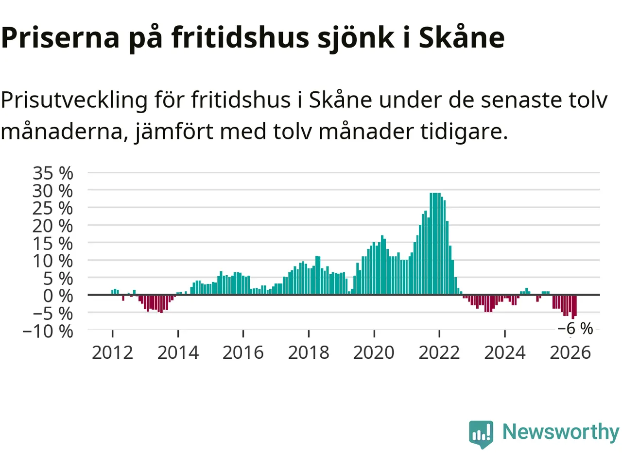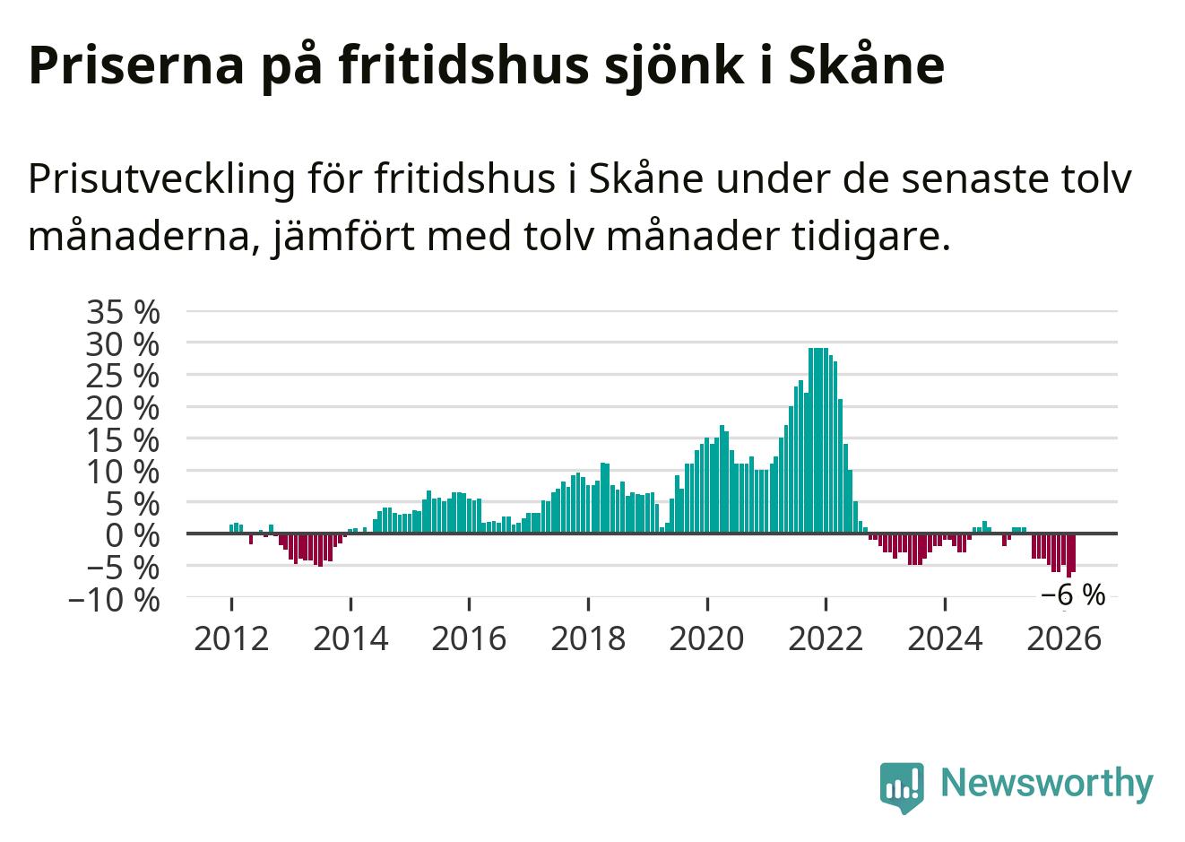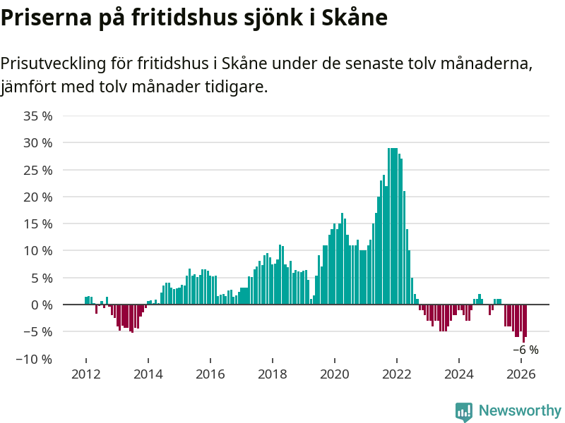 Priserna på fritidshus har gått ner i Skåne län. Medelpriset på försäljningarna under de senaste tolv månaderna visar på en nedgång med 6 procent.