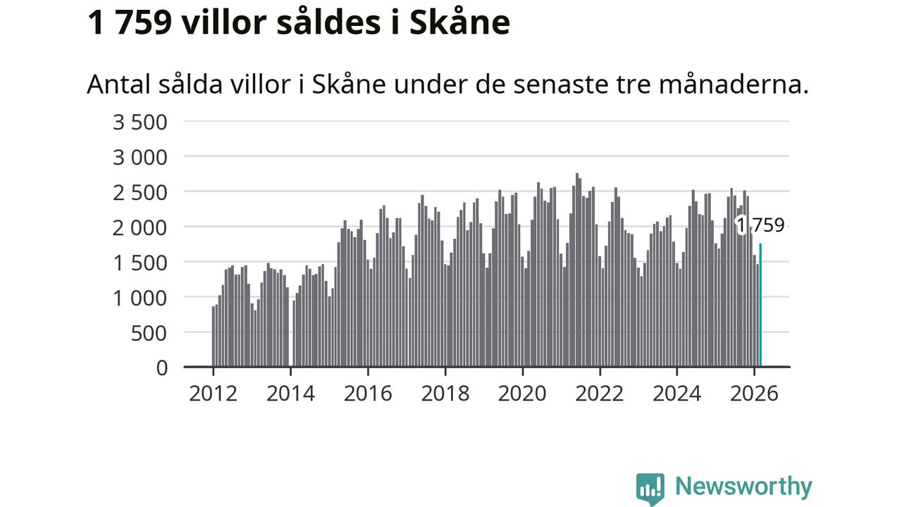 Sammanlagt såldes 1 759 villor i Skåne län mellan januari och mars till ett genomsnittligt pris på 4,1 miljoner kronor. I fjol gjordes 1 892 affärer vid den här tiden på året.