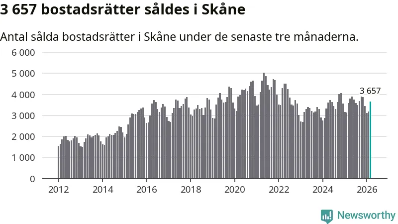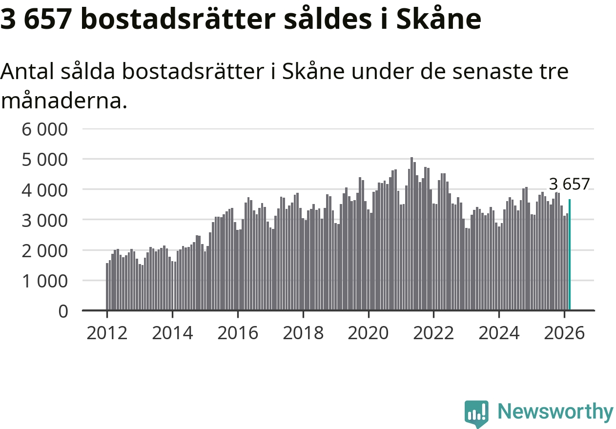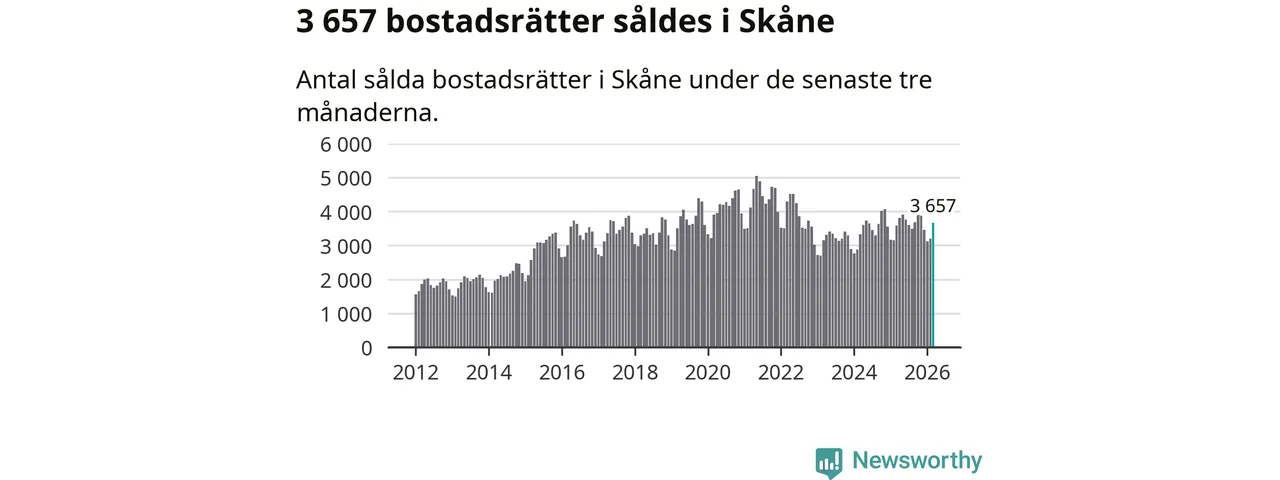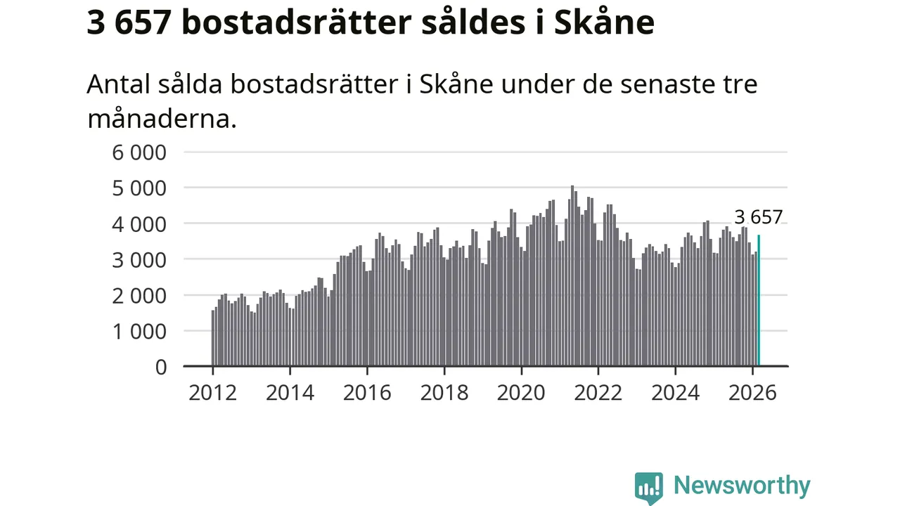 Sammanlagt såldes 3 657 bostadsrätter i Skåne län mellan januari och mars till ett genomsnittligt pris på 2,4 miljoner kronor. I fjol gjordes 3 588 affärer vid den här tiden på året.