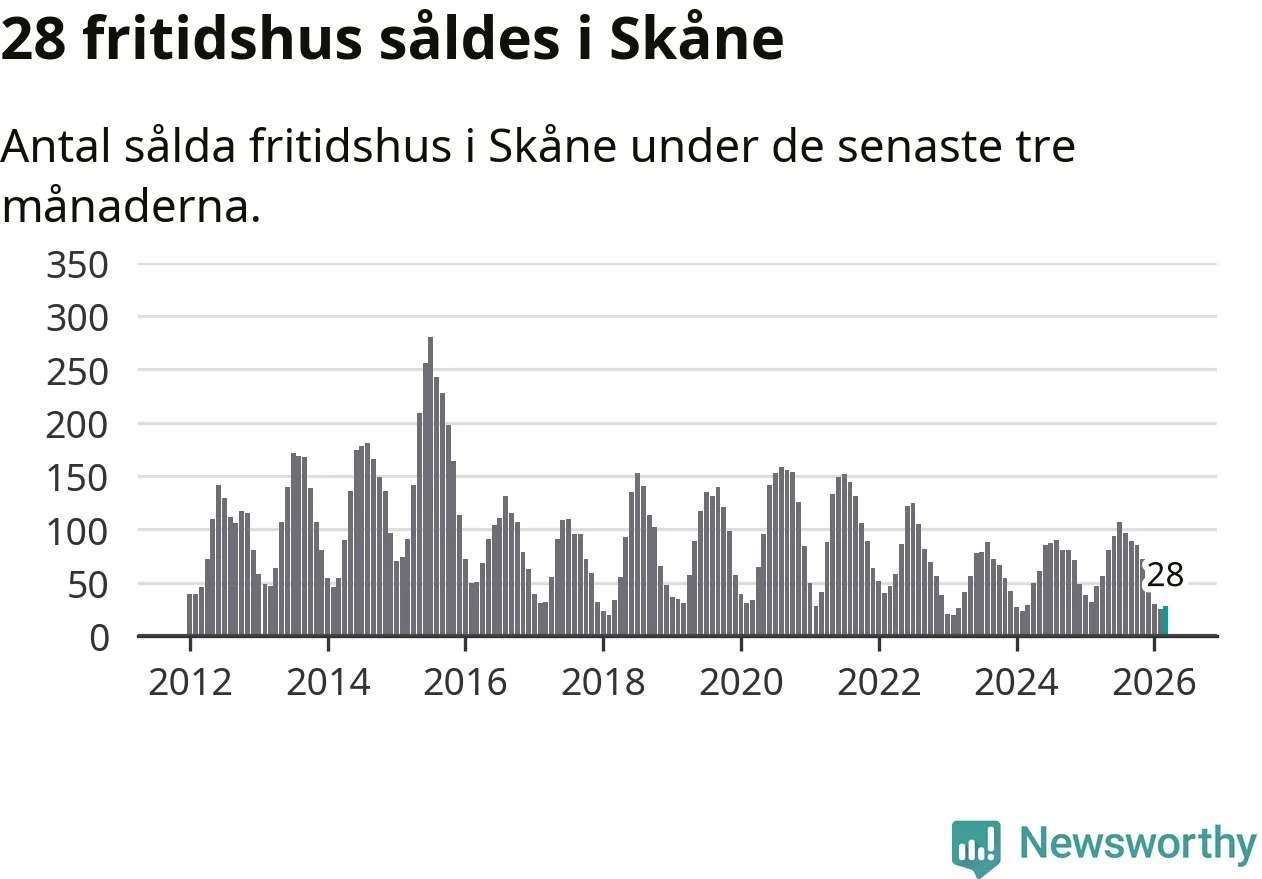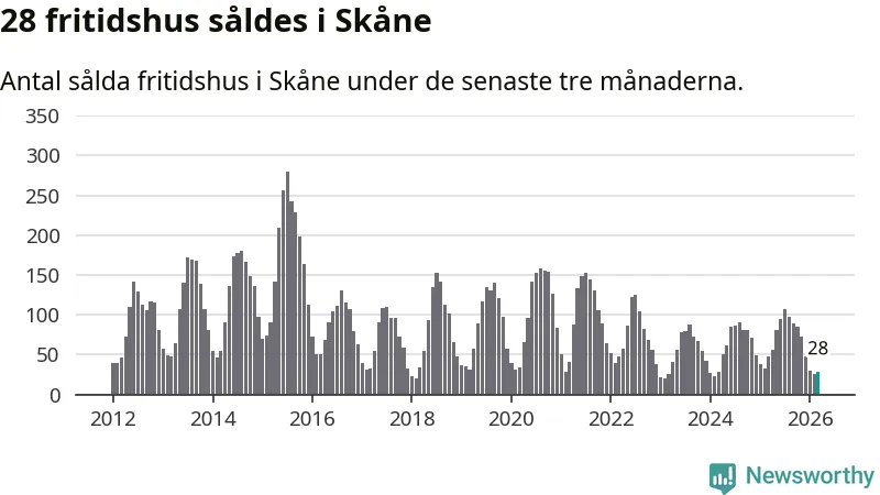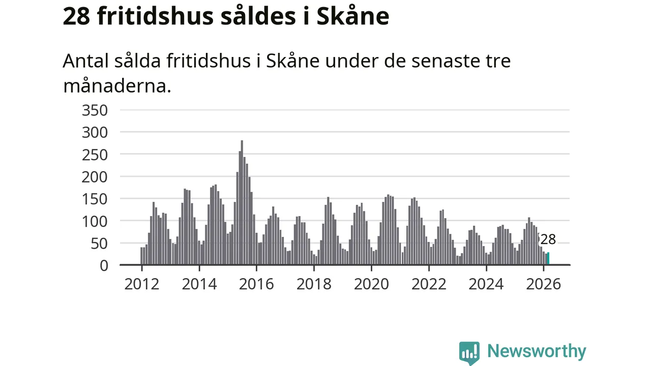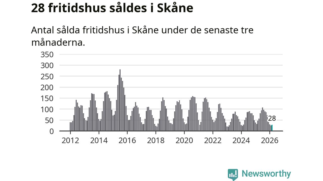 Sammanlagt såldes 28 fritidshus i Skåne län mellan januari och mars till ett genomsnittligt pris på 2,5 miljoner kronor. I fjol gjordes 47 affärer vid den här tiden på året.