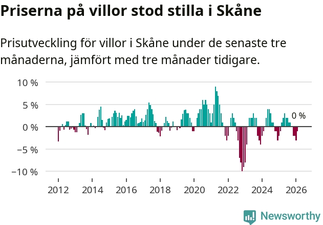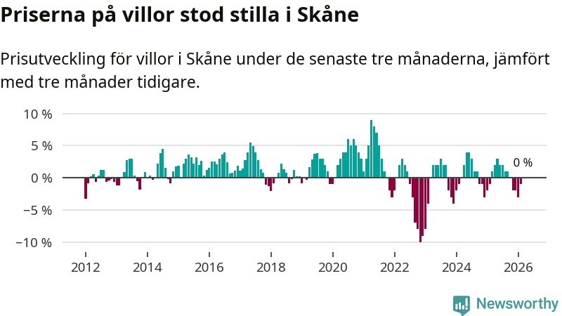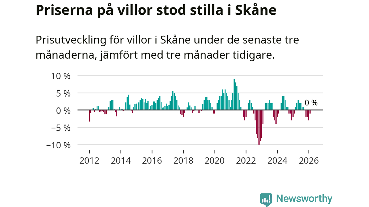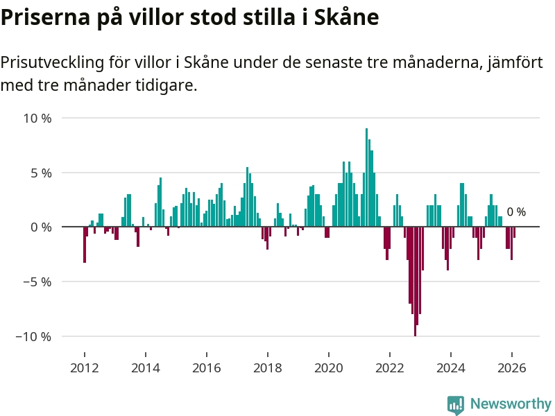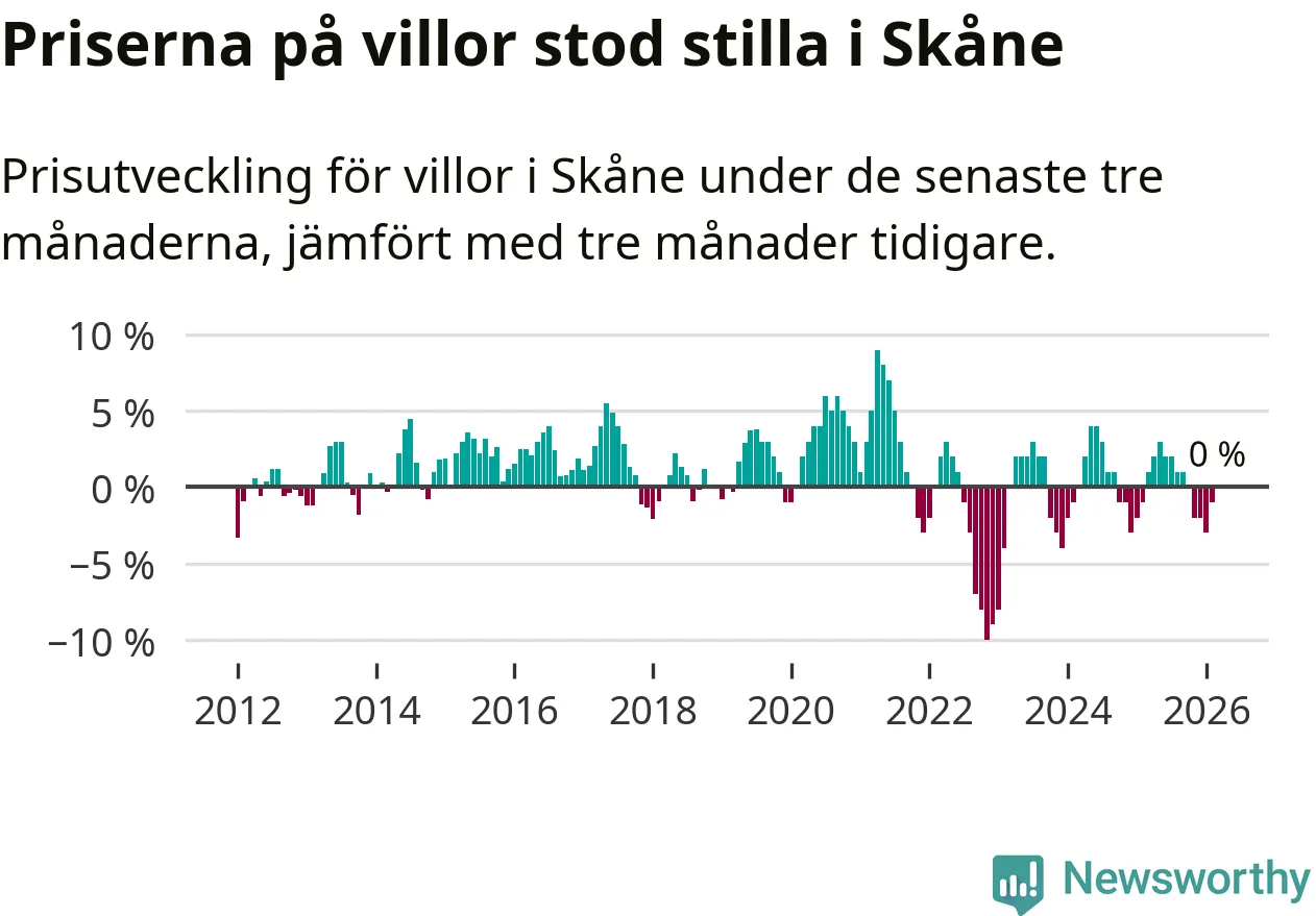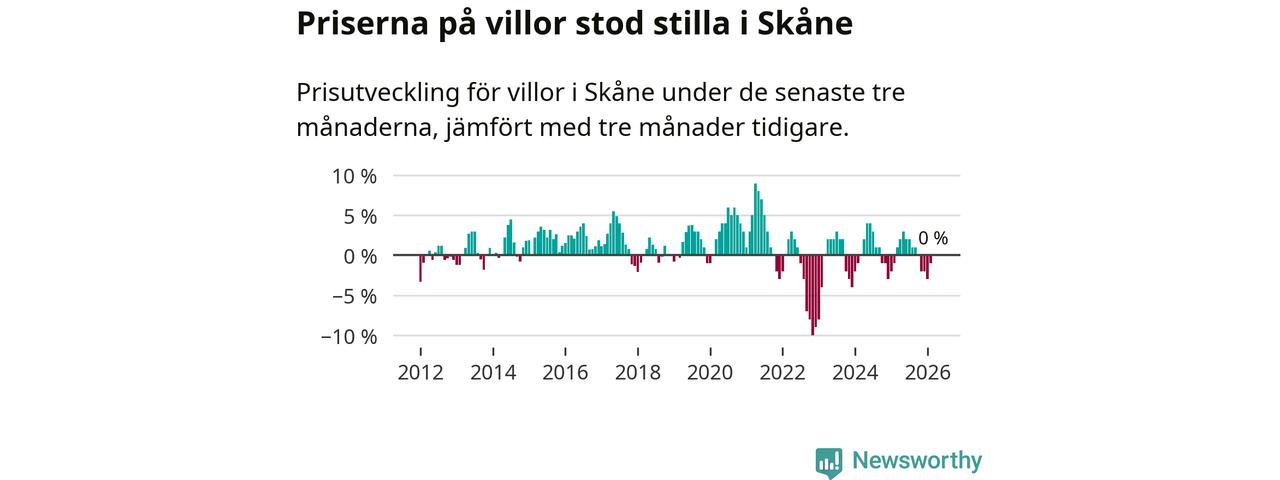 Villapriserna står i stort sett stilla i Skåne län. Medelpriset på de på försäljningarna under de senaste tre månaderna låg på samma nivå som för tre månader sedan.