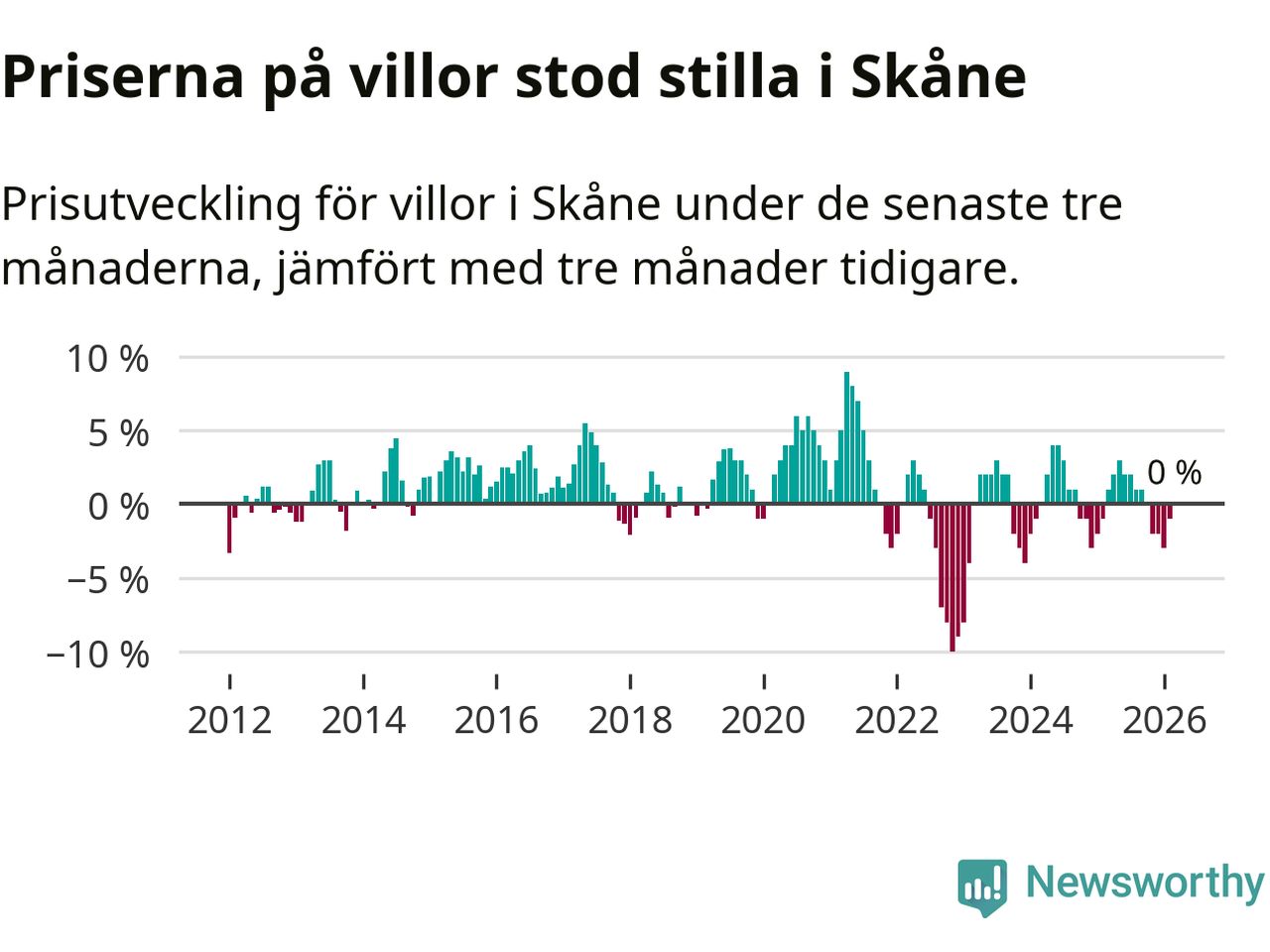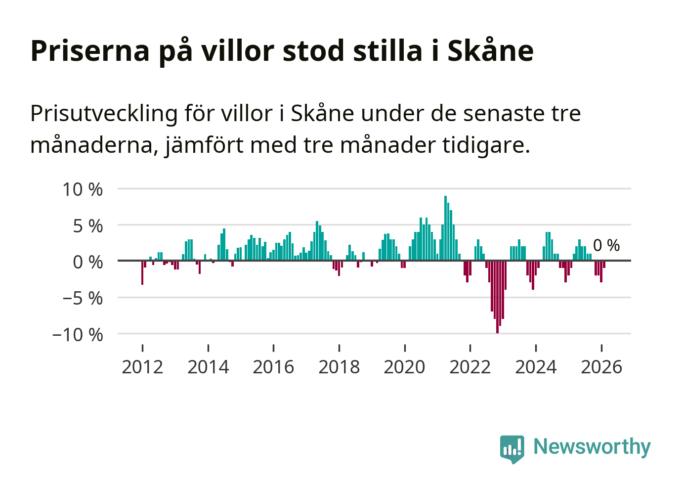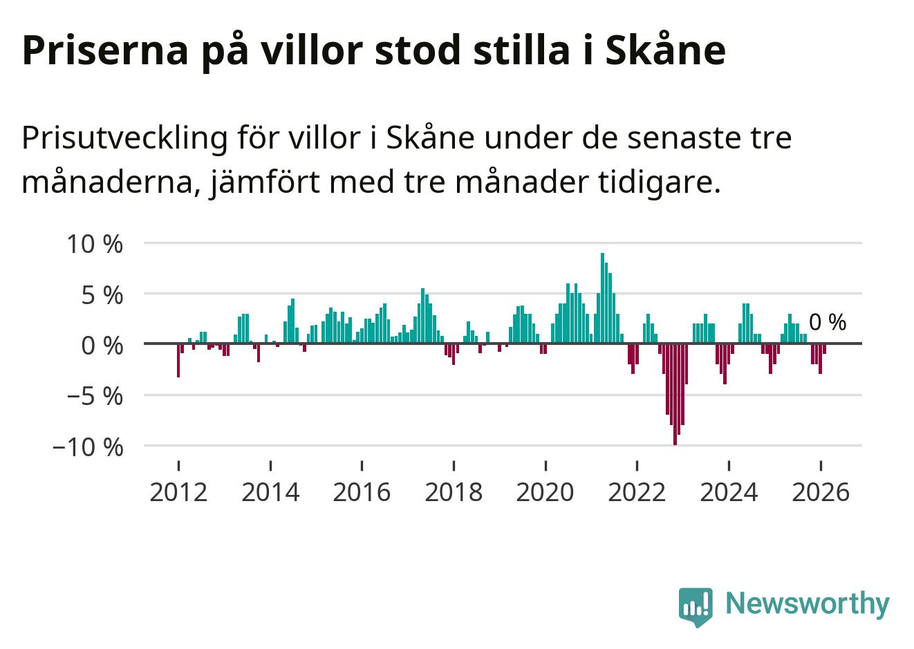 Villapriserna står i stort sett stilla i Skåne län. Medelpriset på de på försäljningarna under de senaste tre månaderna låg på samma nivå som för tre månader sedan.