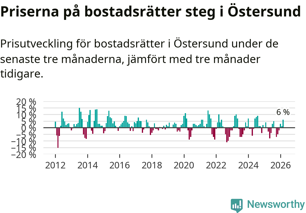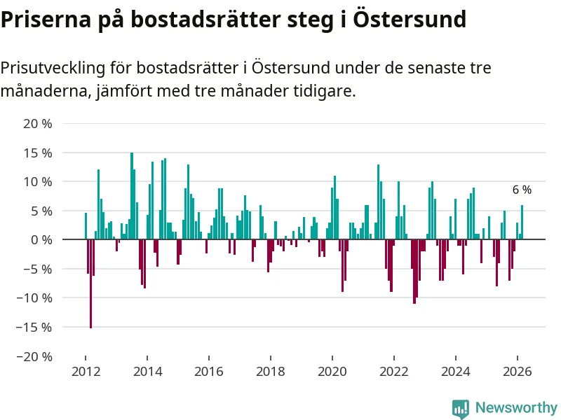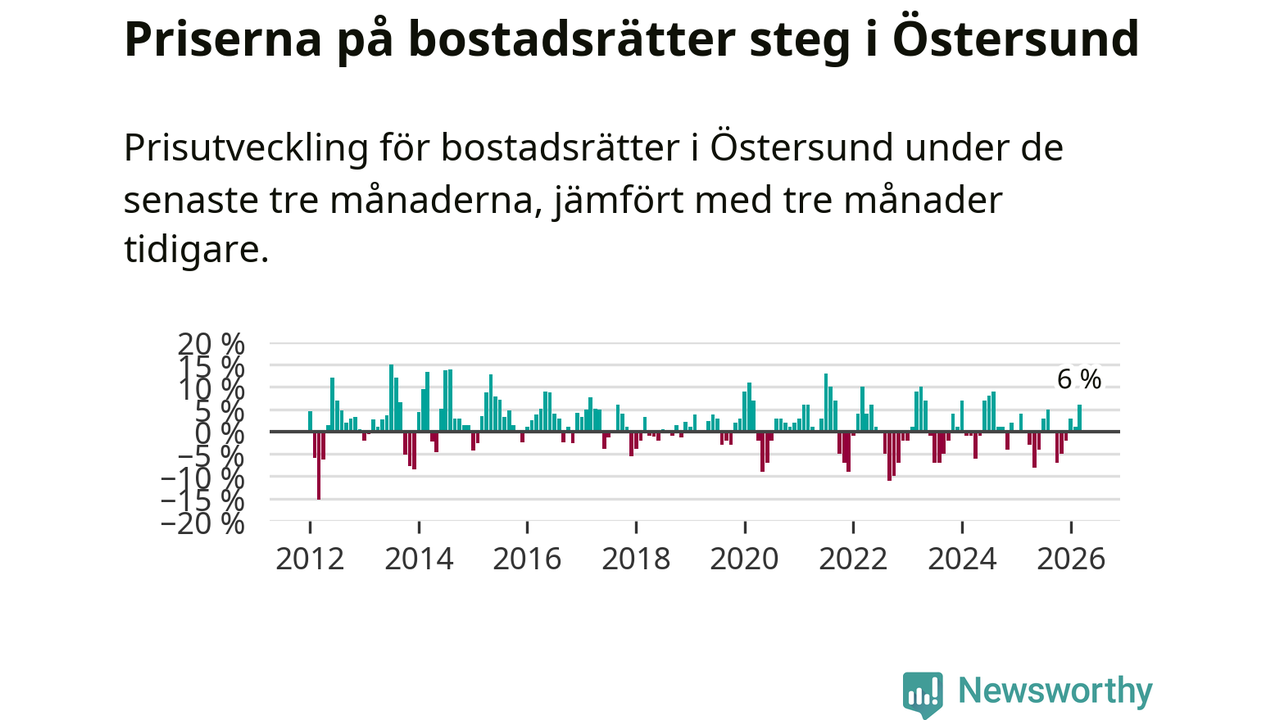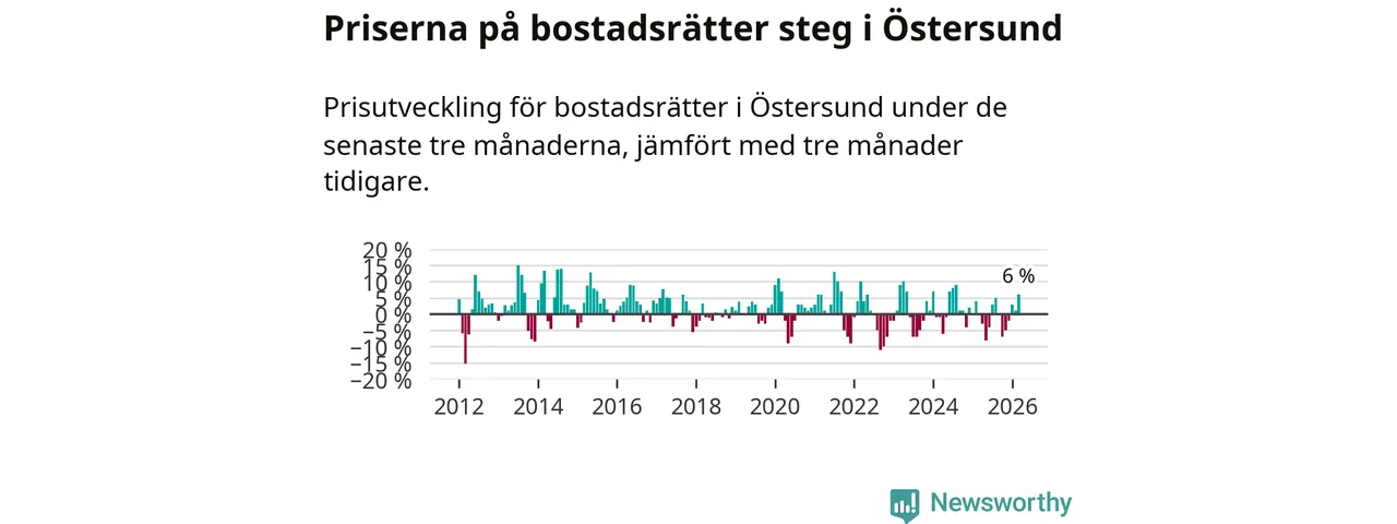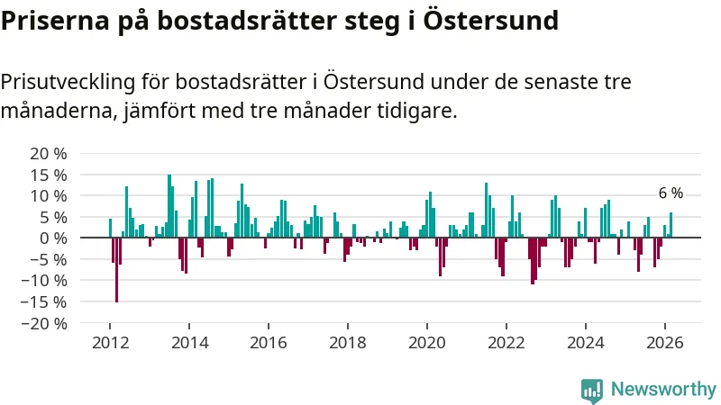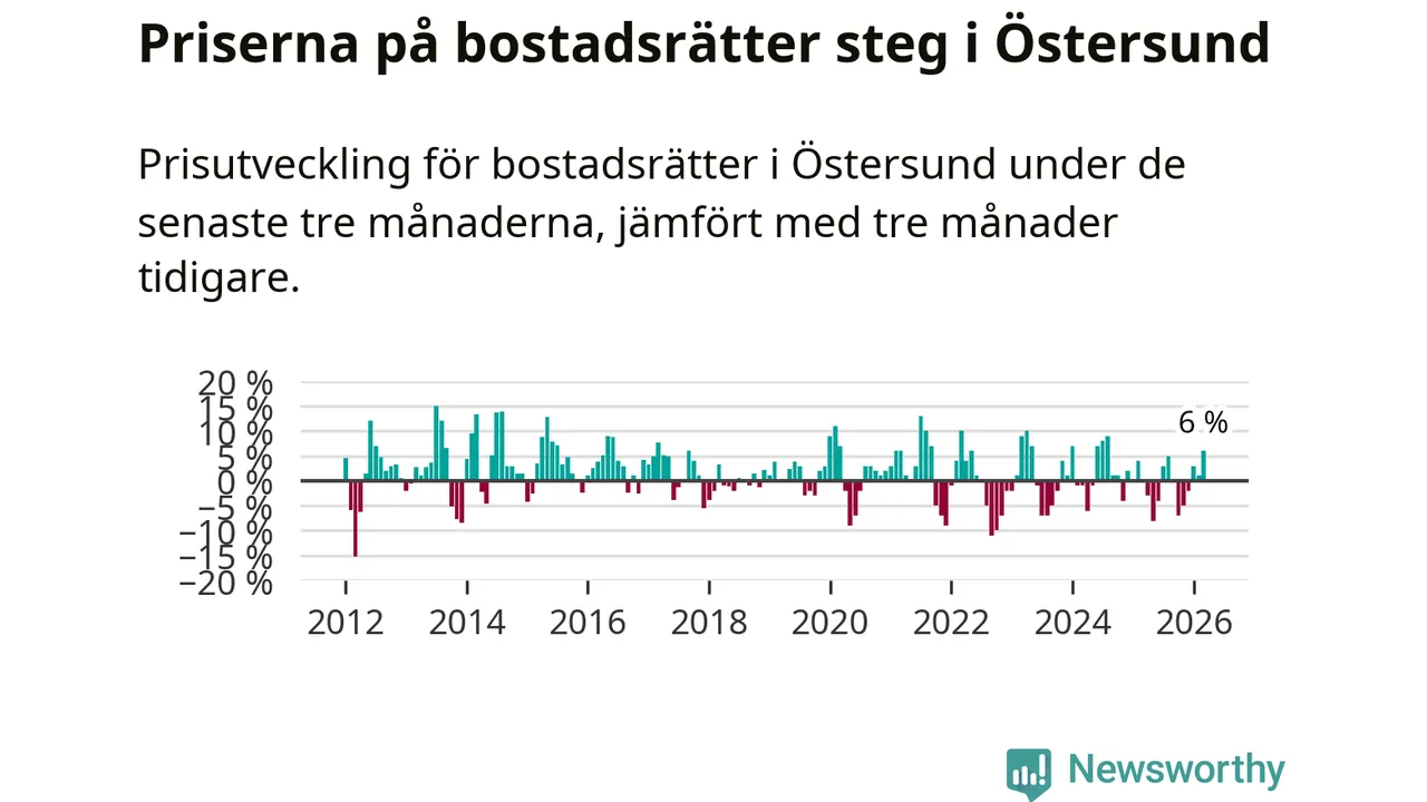 Priserna på bostadsrätter har gått upp i Östersunds kommun. Medelpriset på försäljningarna under de senaste tre månaderna visar på en uppgång med 6 procent.