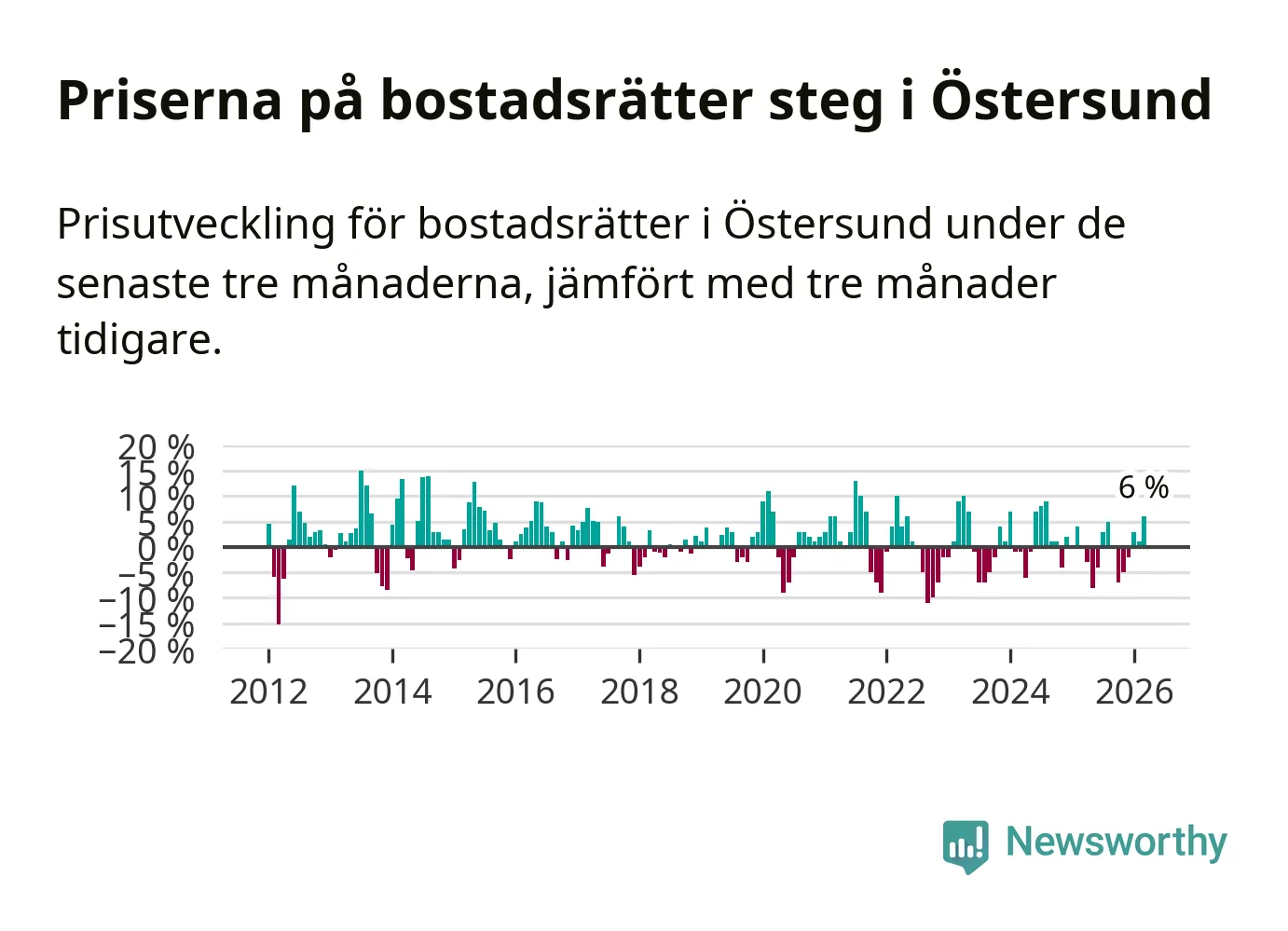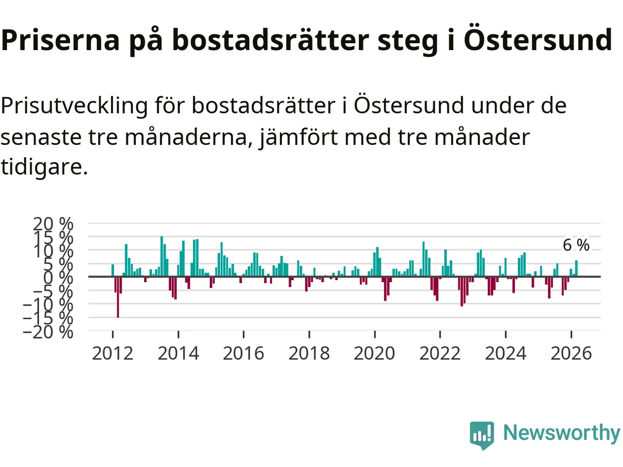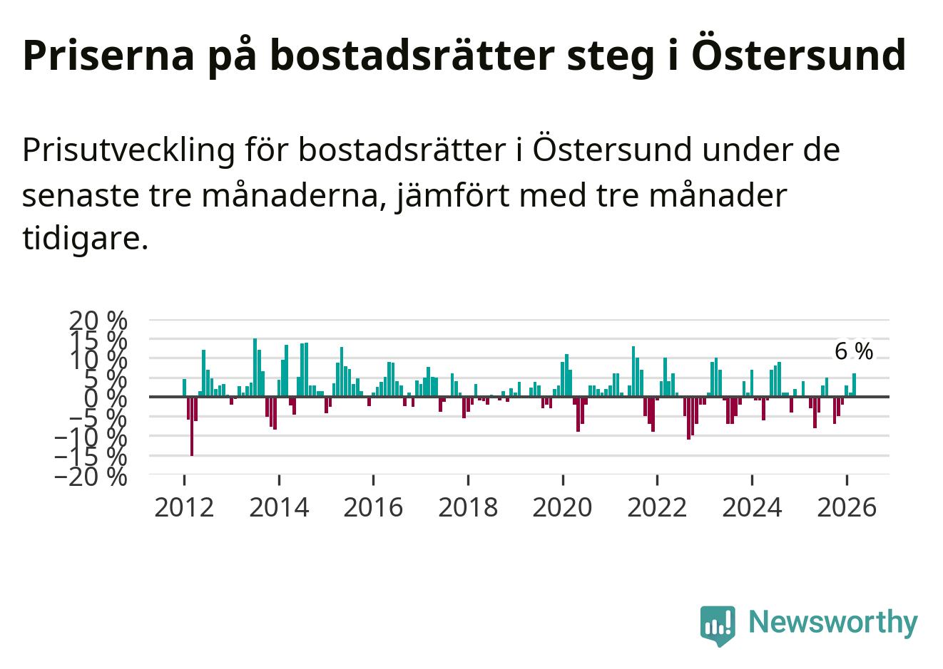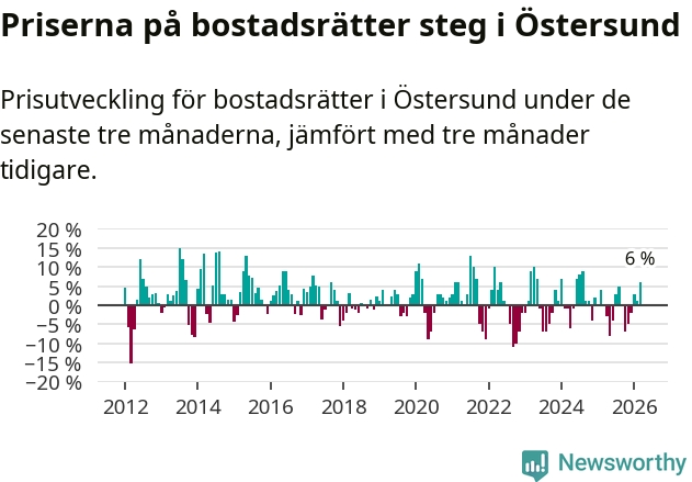 Priserna på bostadsrätter har gått upp i Östersunds kommun. Medelpriset på försäljningarna under de senaste tre månaderna visar på en uppgång med 6 procent.