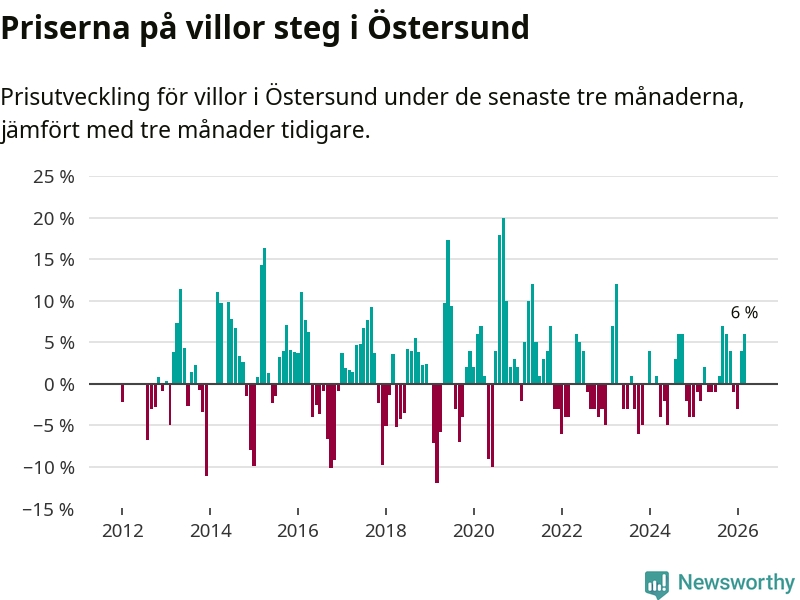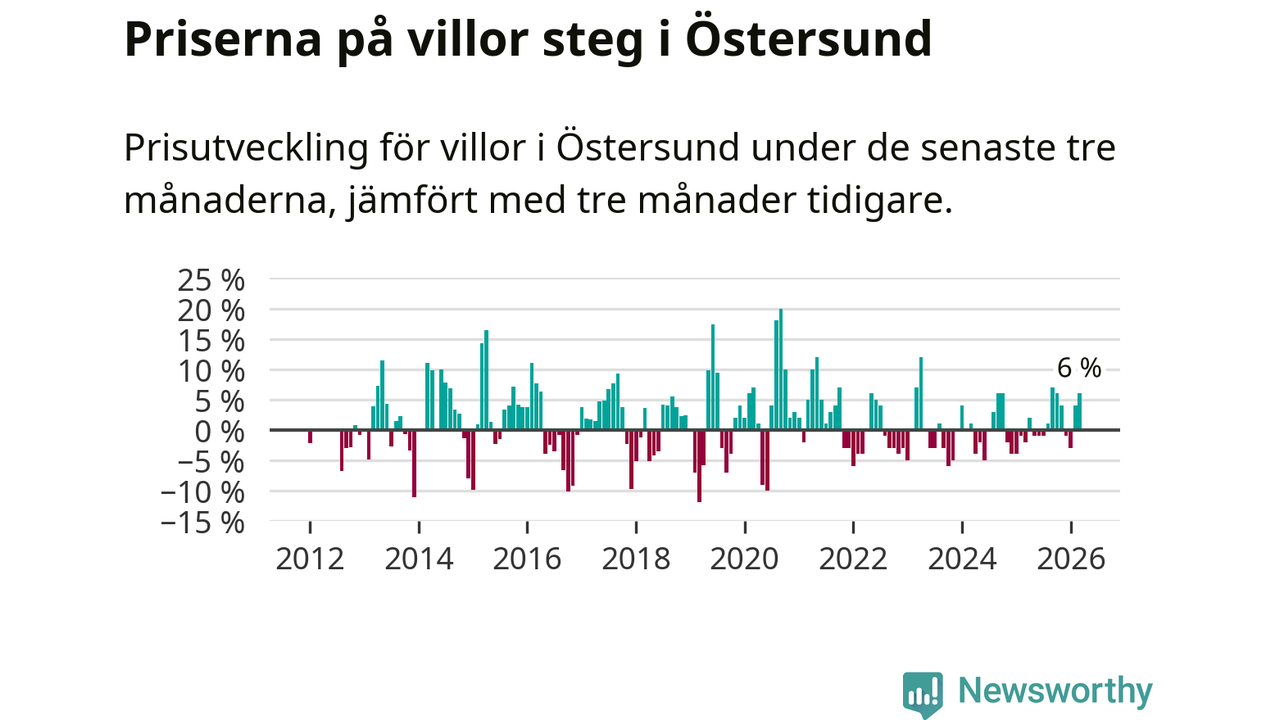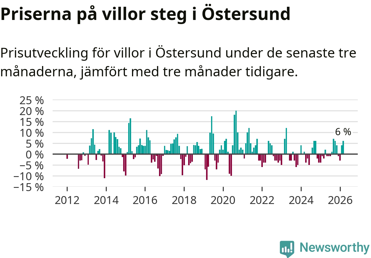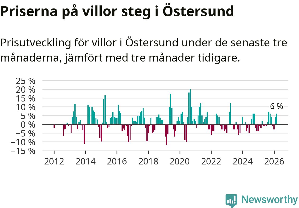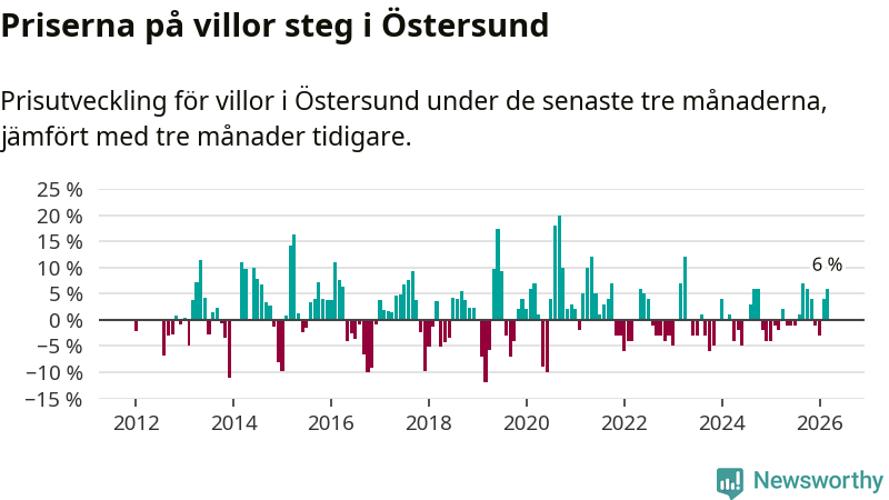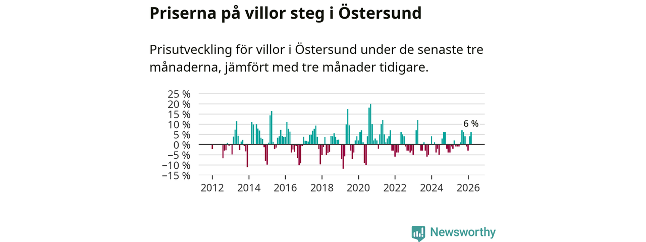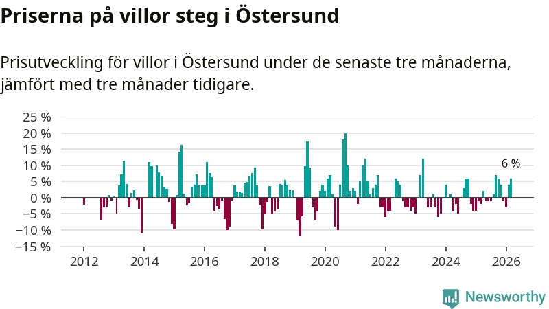 Villapriserna har gått upp i Östersunds kommun. Medelpriset på försäljningarna under de senaste tre månaderna visar på en uppgång med 6 procent.
