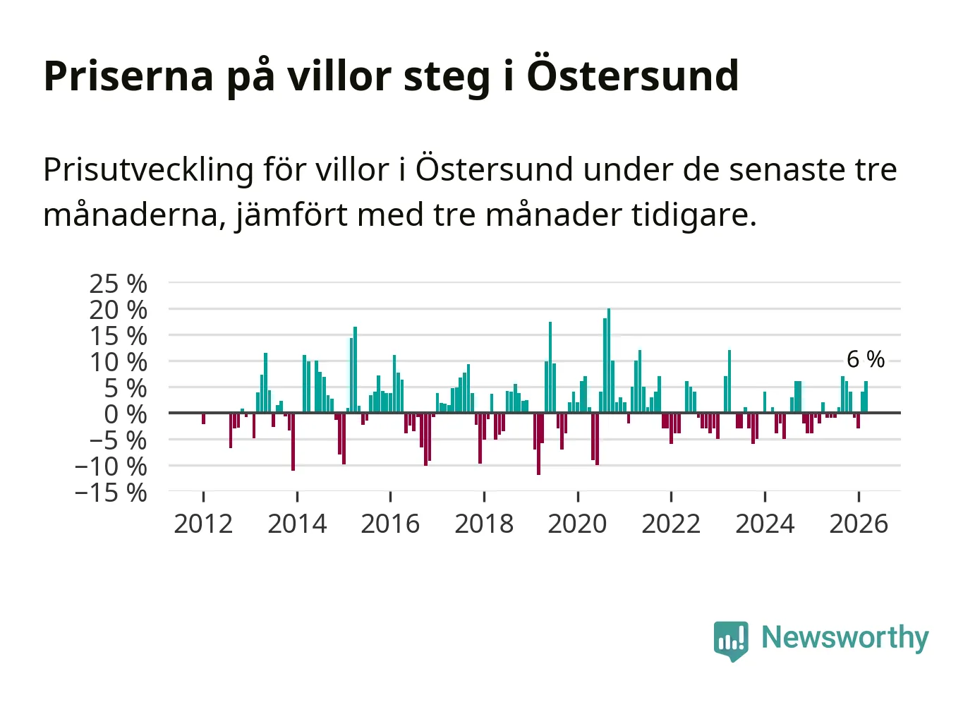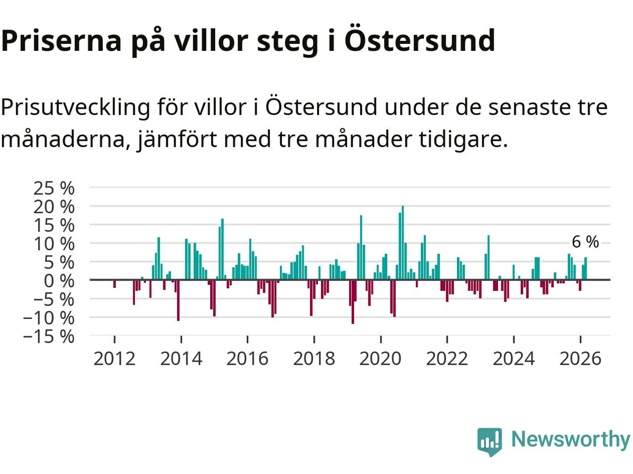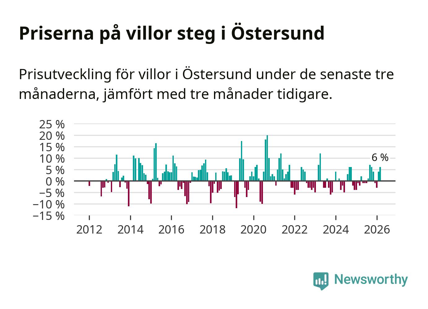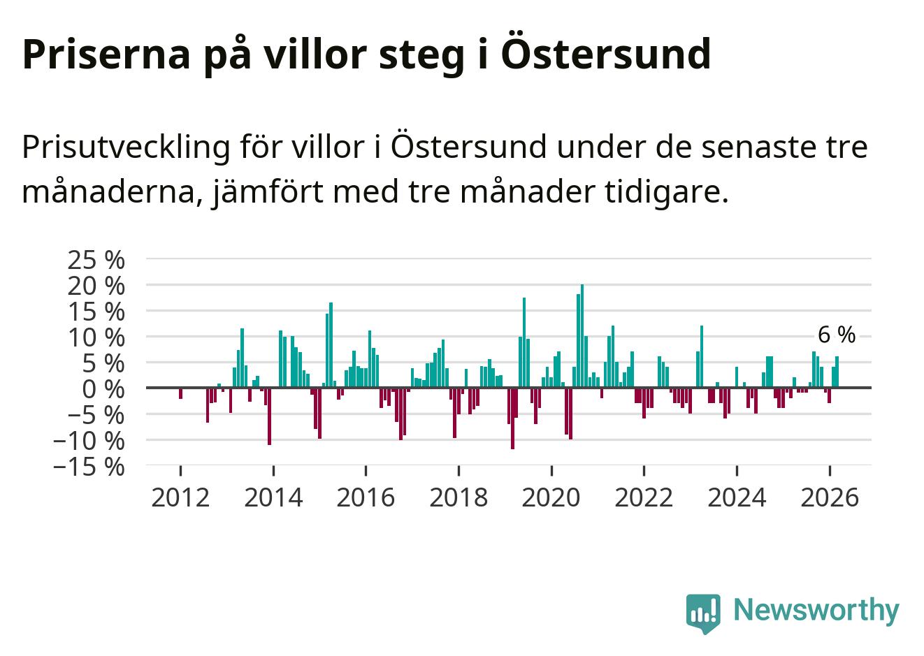 Villapriserna har gått upp i Östersunds kommun. Medelpriset på försäljningarna under de senaste tre månaderna visar på en uppgång med 6 procent.