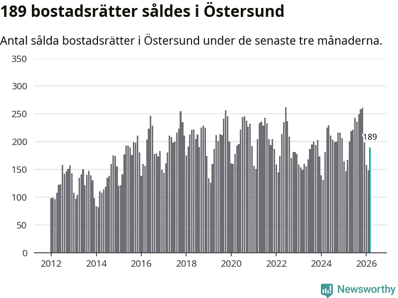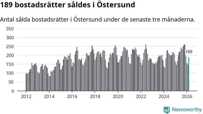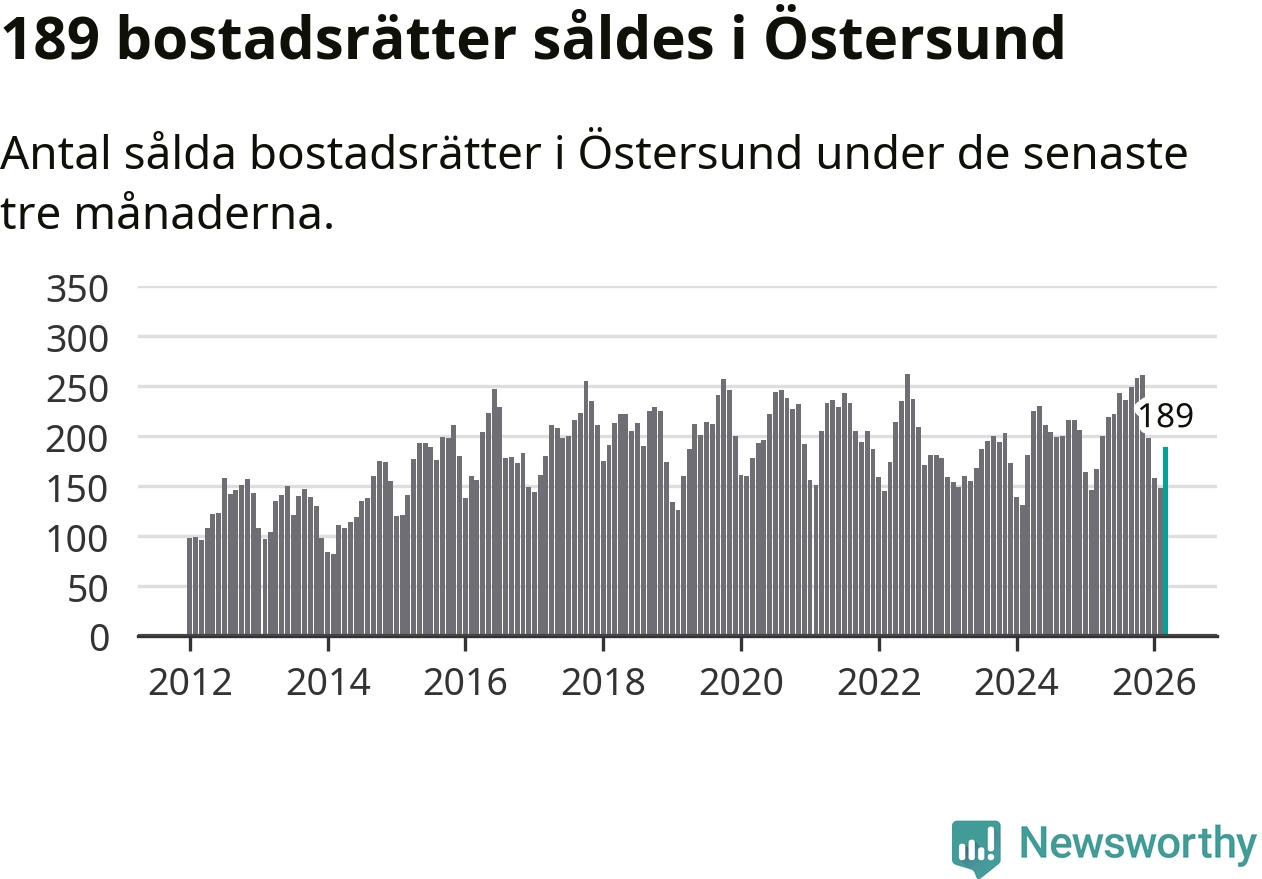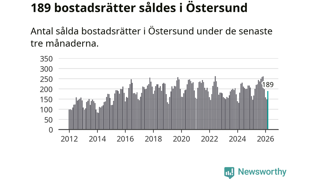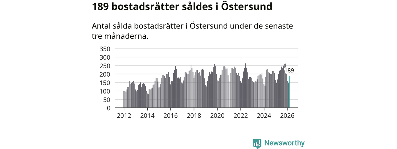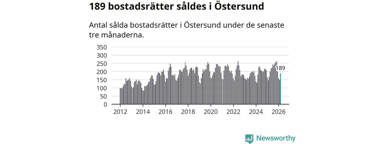Sammanlagt såldes 189 bostadsrätter i Östersunds kommun mellan januari och mars till ett genomsnittligt pris på 1,6 miljoner kronor. I fjol gjordes 167 affärer vid den här tiden på året.