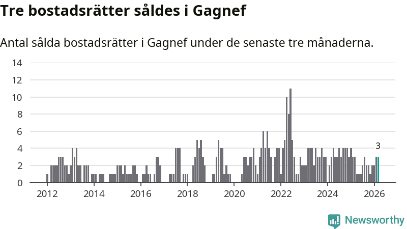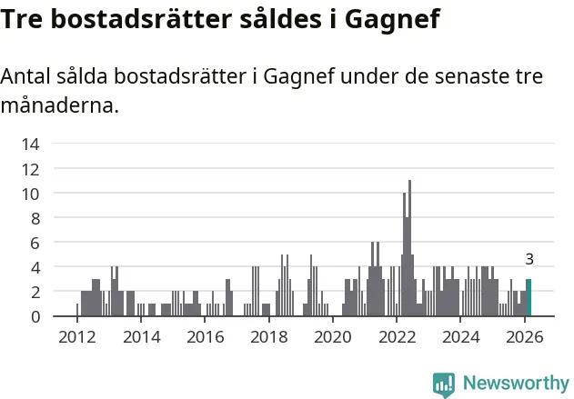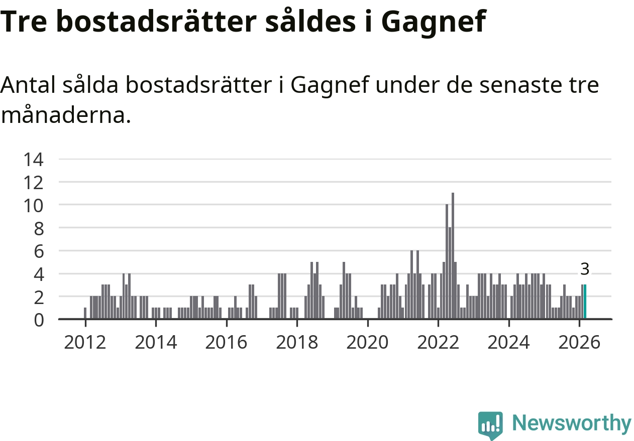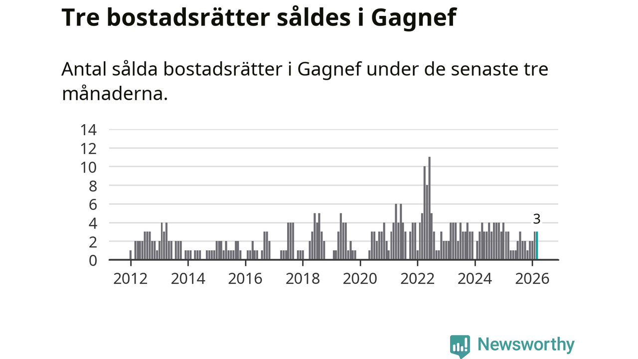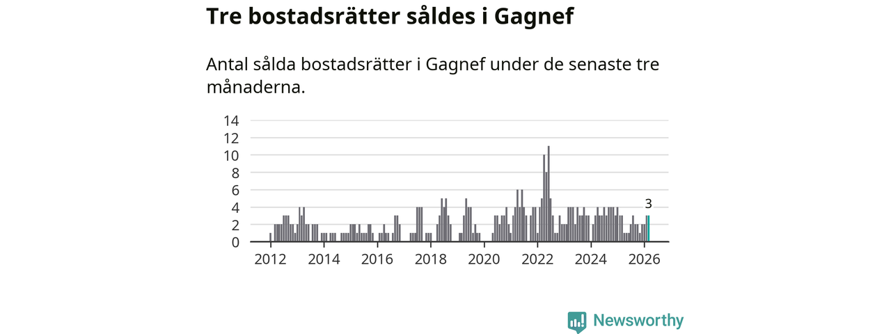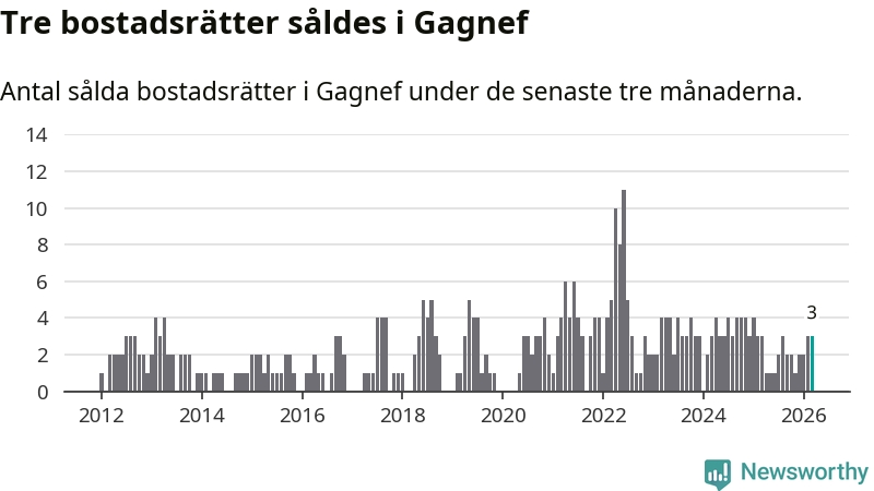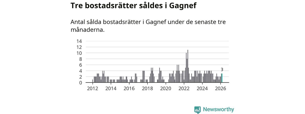 Mellan januari och mars gjordes sammanlagt tre affärer med bostadsrätter i Gagnefs kommun. Det är lika många affärer som vid motsvarande tid i fjol.