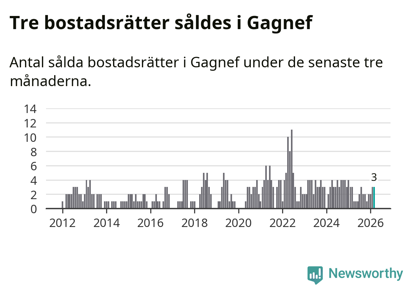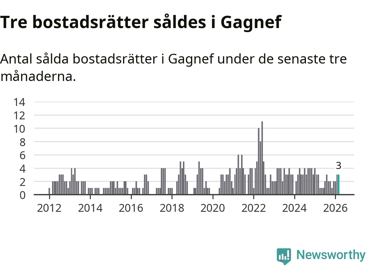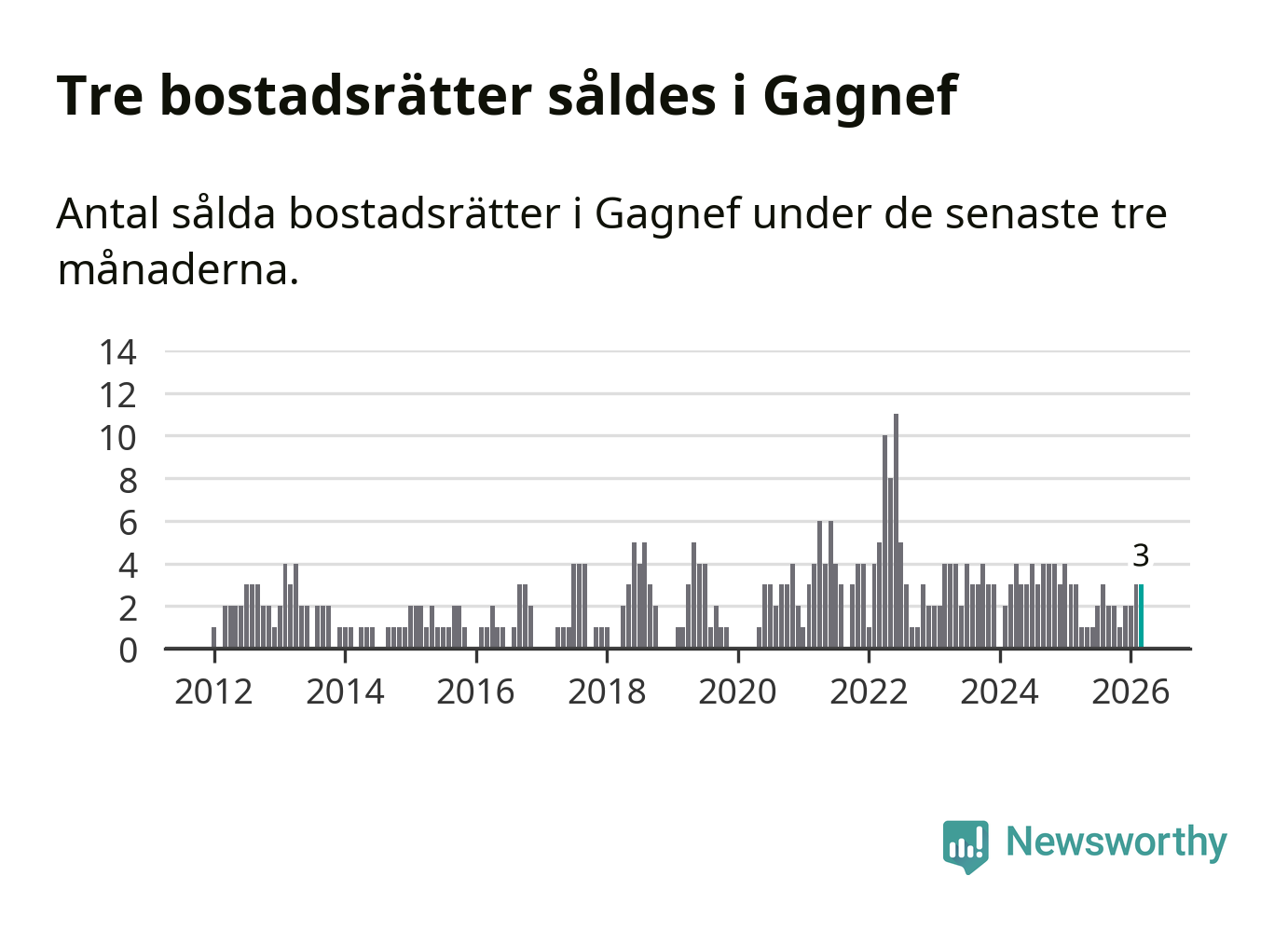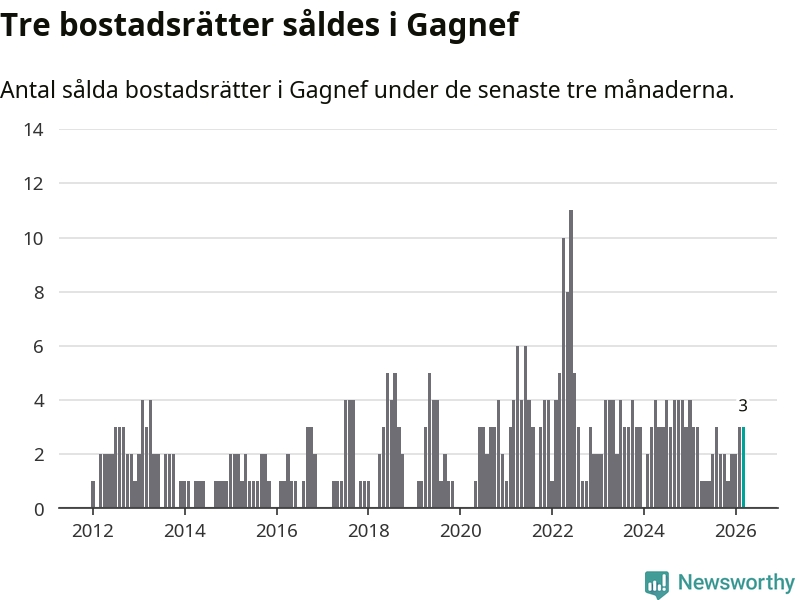 Mellan januari och mars gjordes sammanlagt tre affärer med bostadsrätter i Gagnefs kommun. Det är lika många affärer som vid motsvarande tid i fjol.
