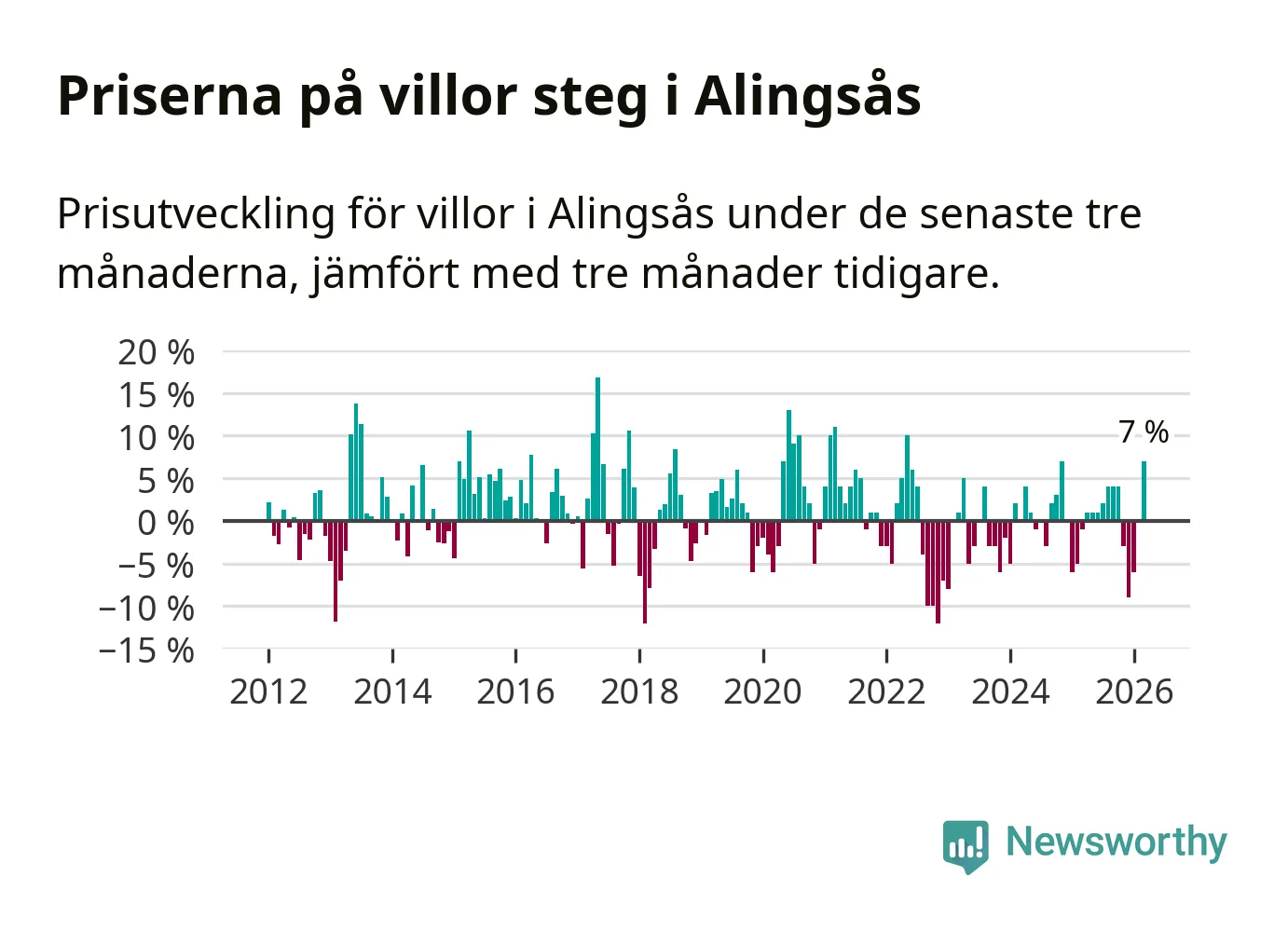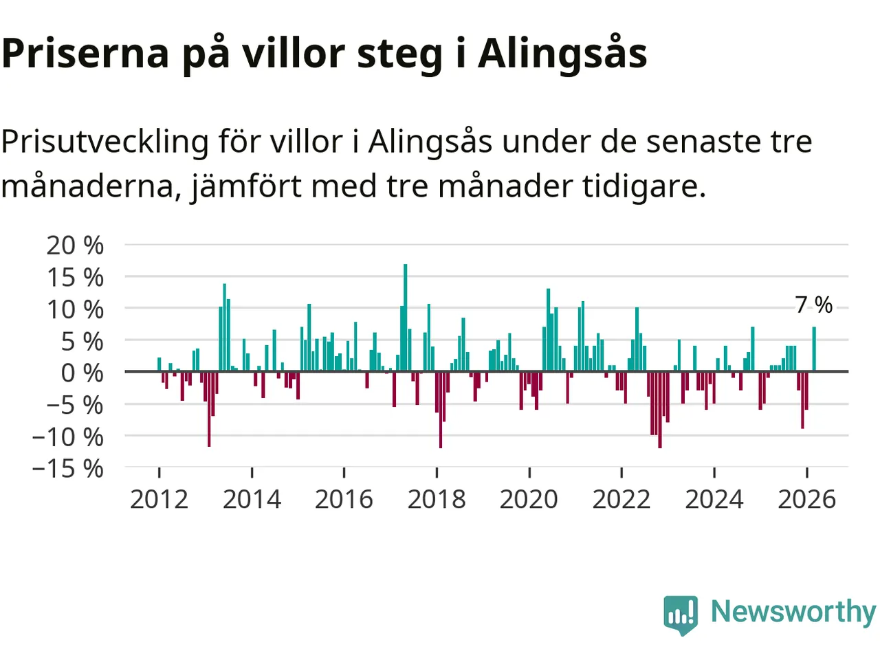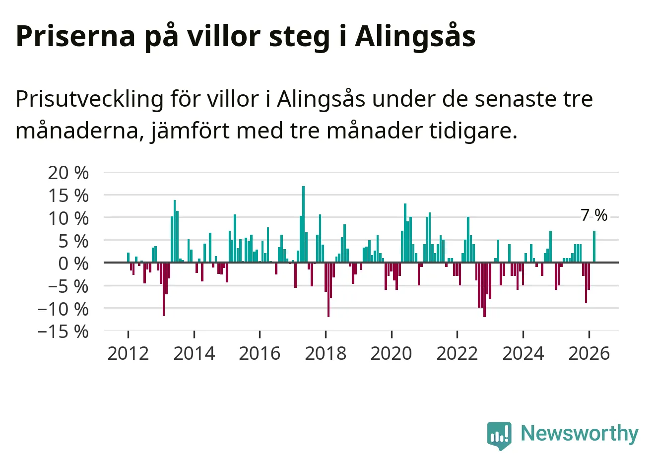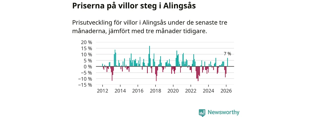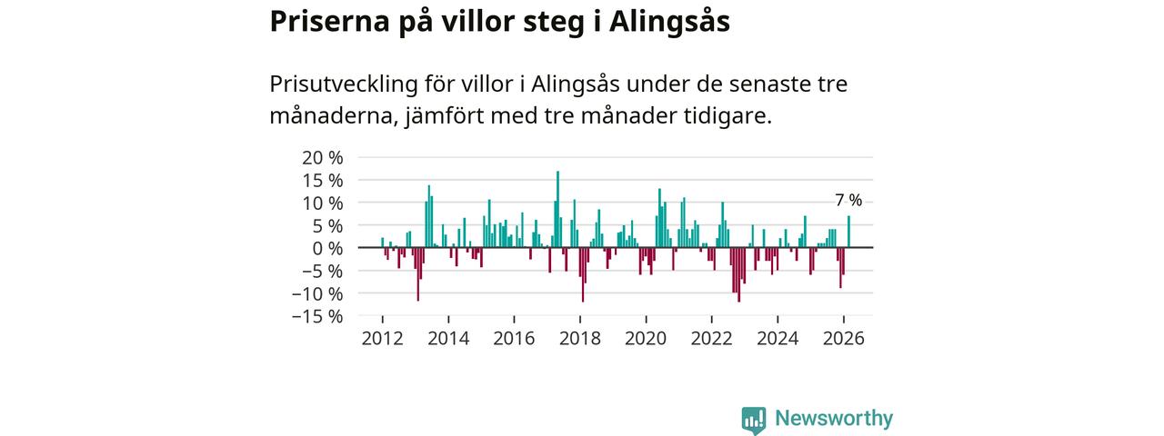 Villapriserna har gått upp i Alingsås kommun. Medelpriset på försäljningarna under de senaste tre månaderna visar på en uppgång med 7 procent.