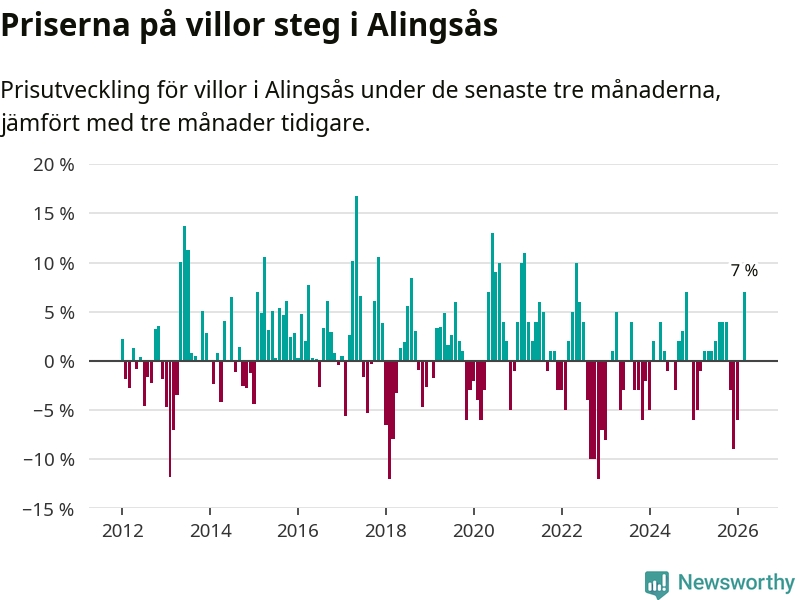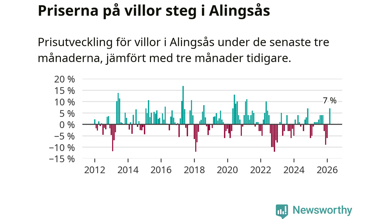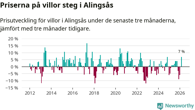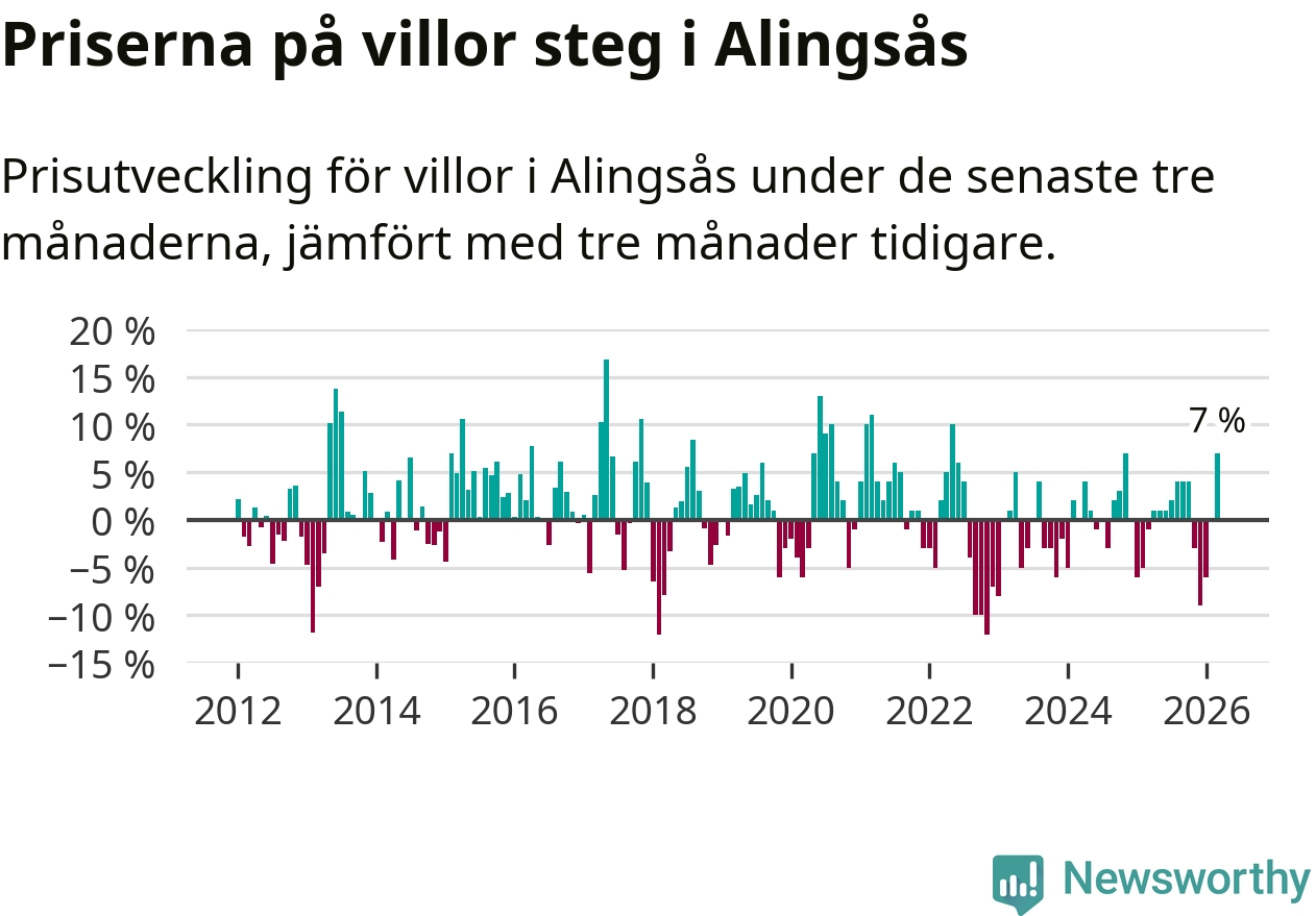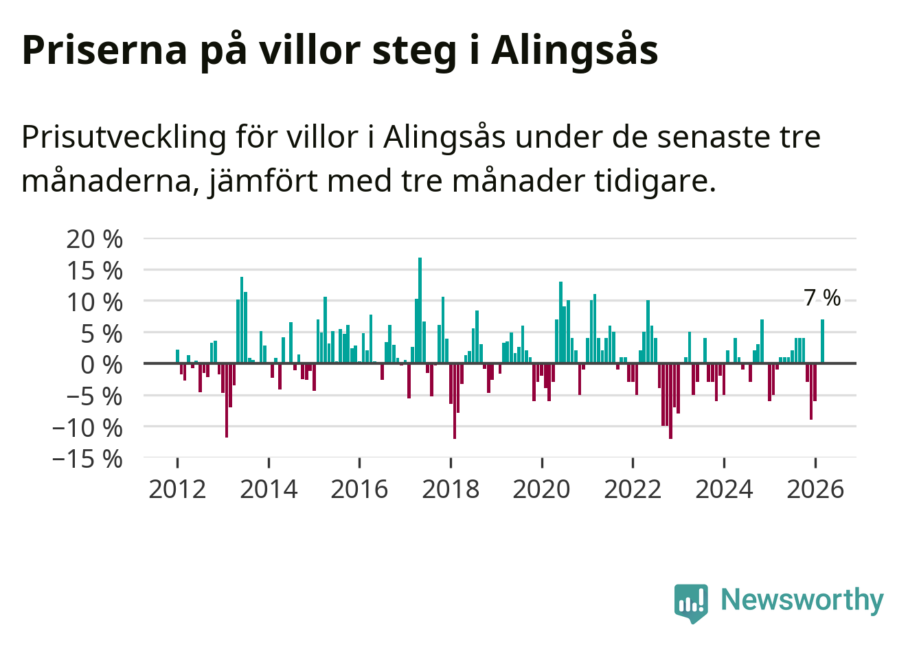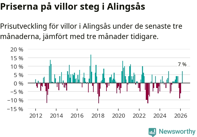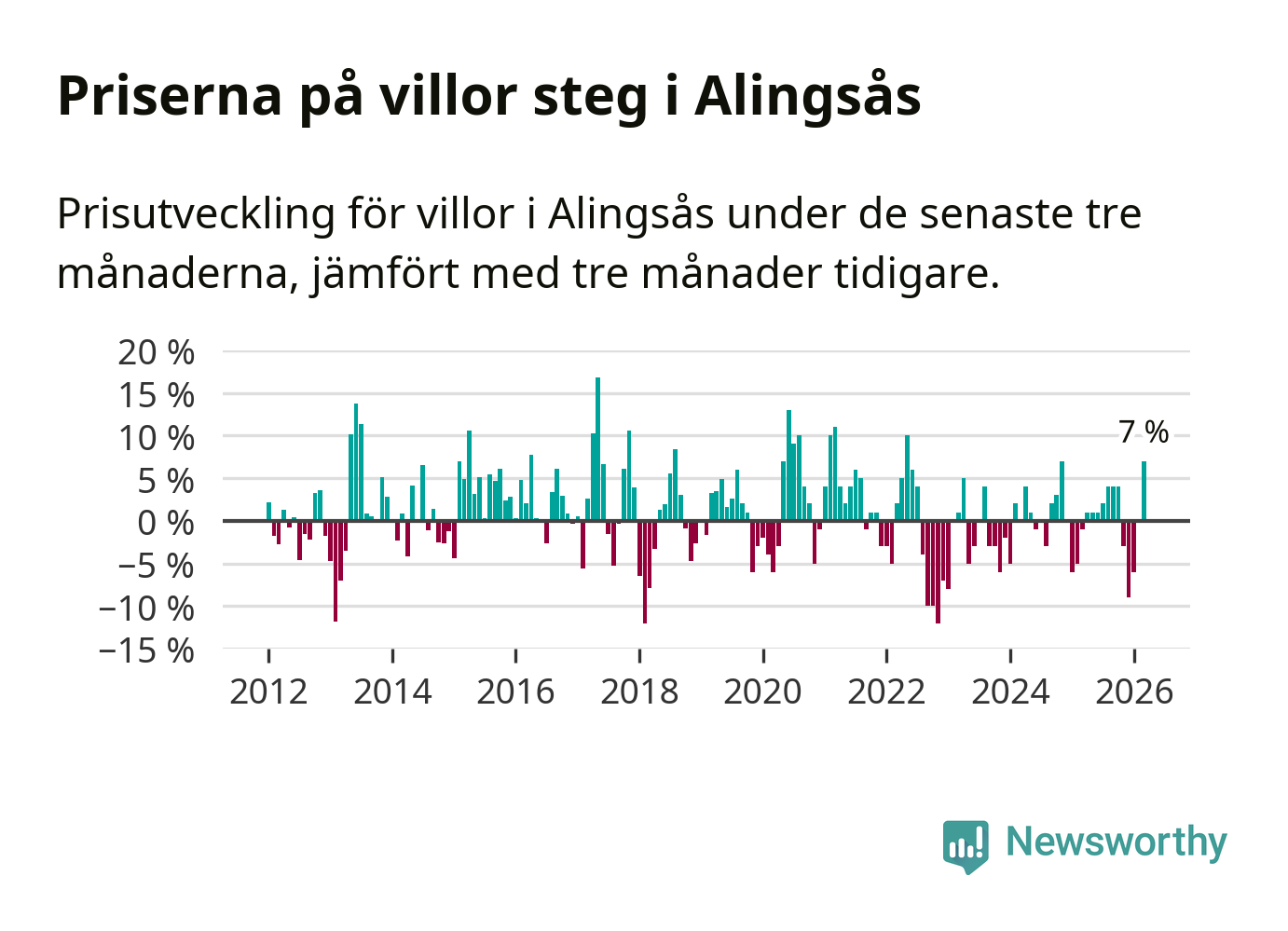 Villapriserna har gått upp i Alingsås kommun. Medelpriset på försäljningarna under de senaste tre månaderna visar på en uppgång med 7 procent.