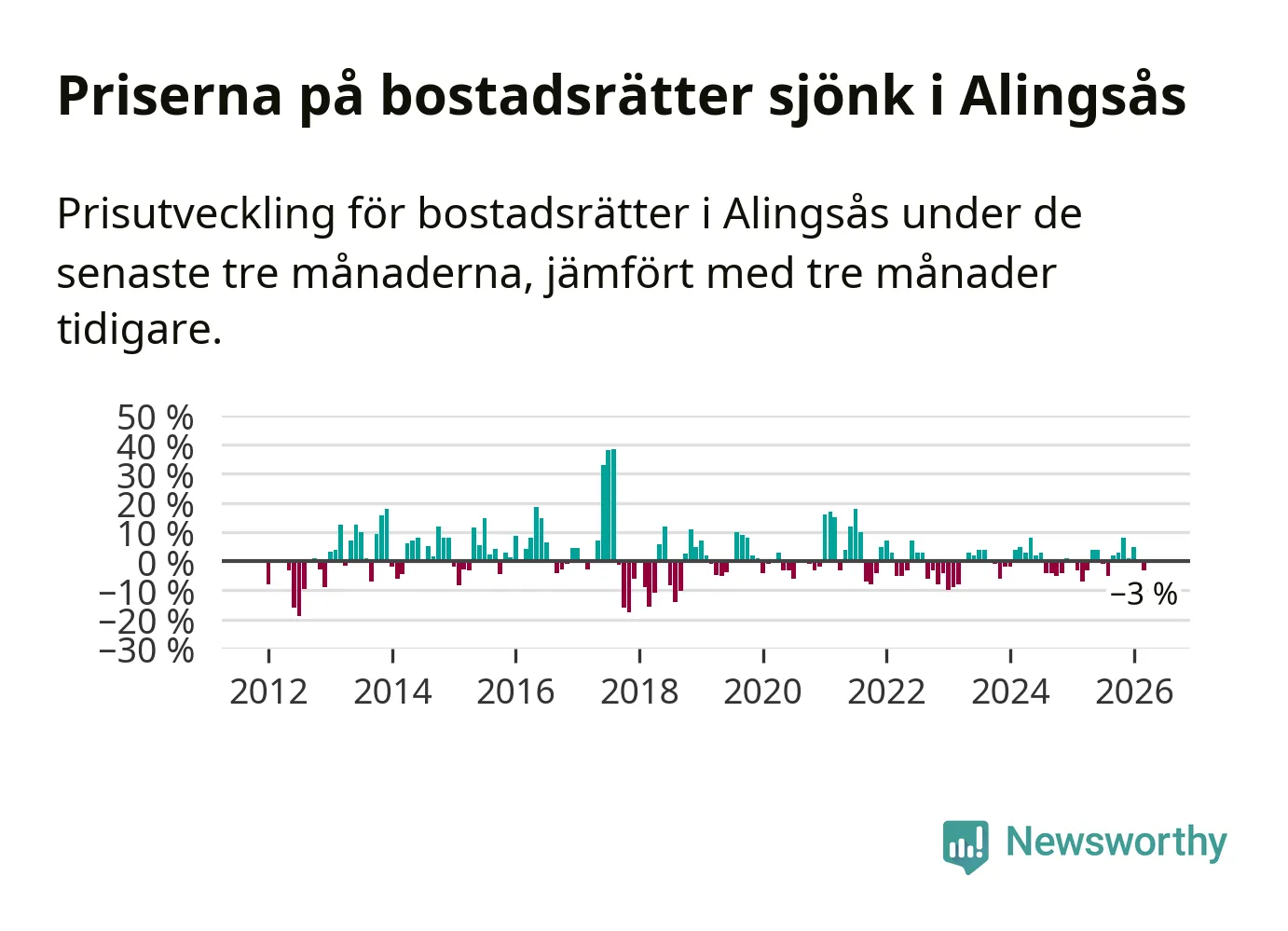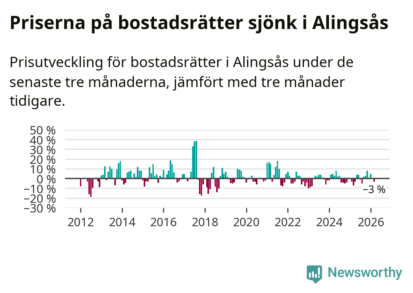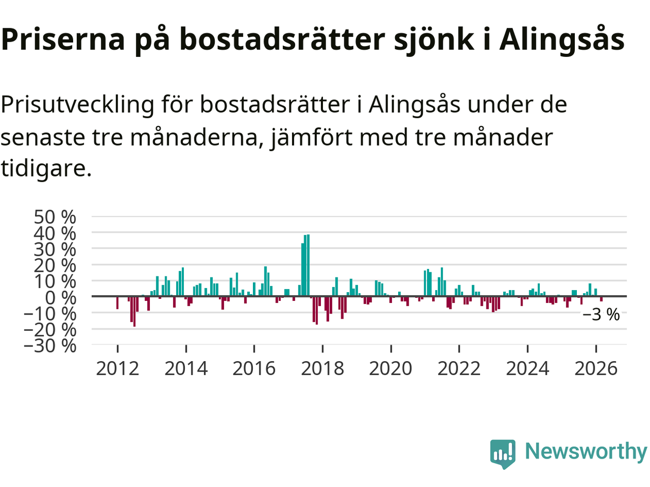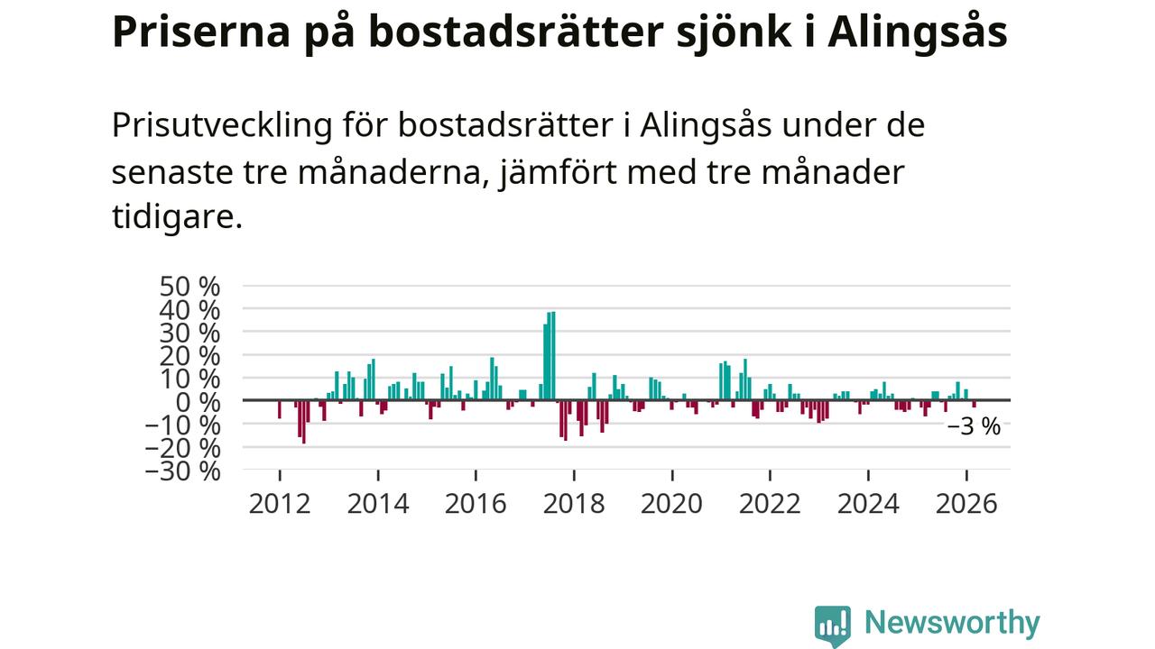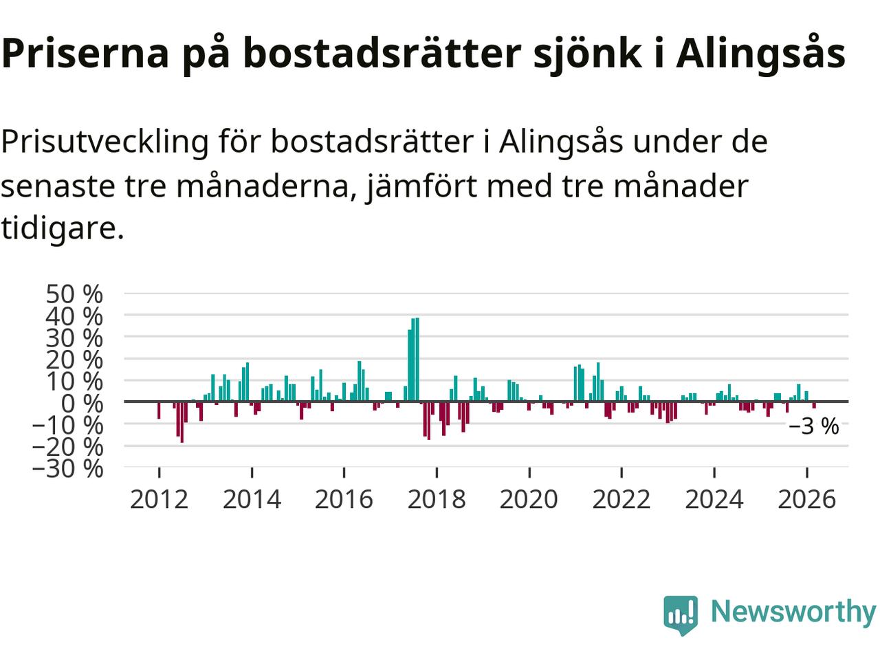 Priserna på bostadsrätter har gått ner i Alingsås kommun. Medelpriset på försäljningarna under de senaste tre månaderna visar på en nedgång med 3 procent.