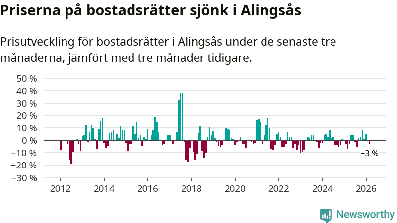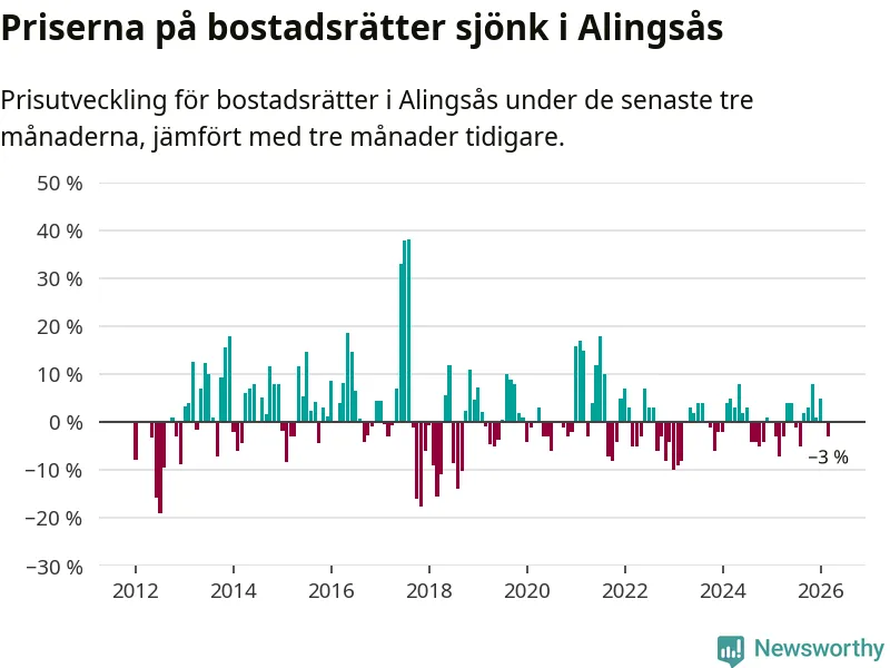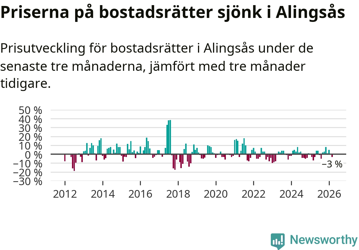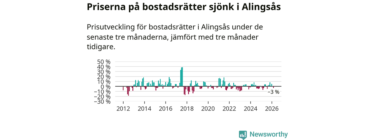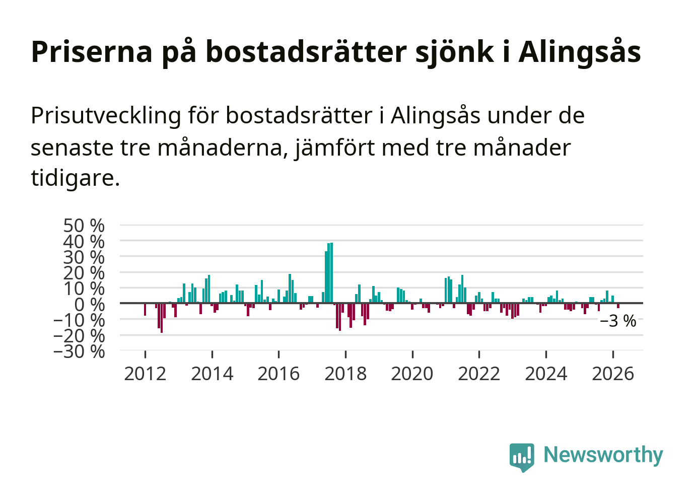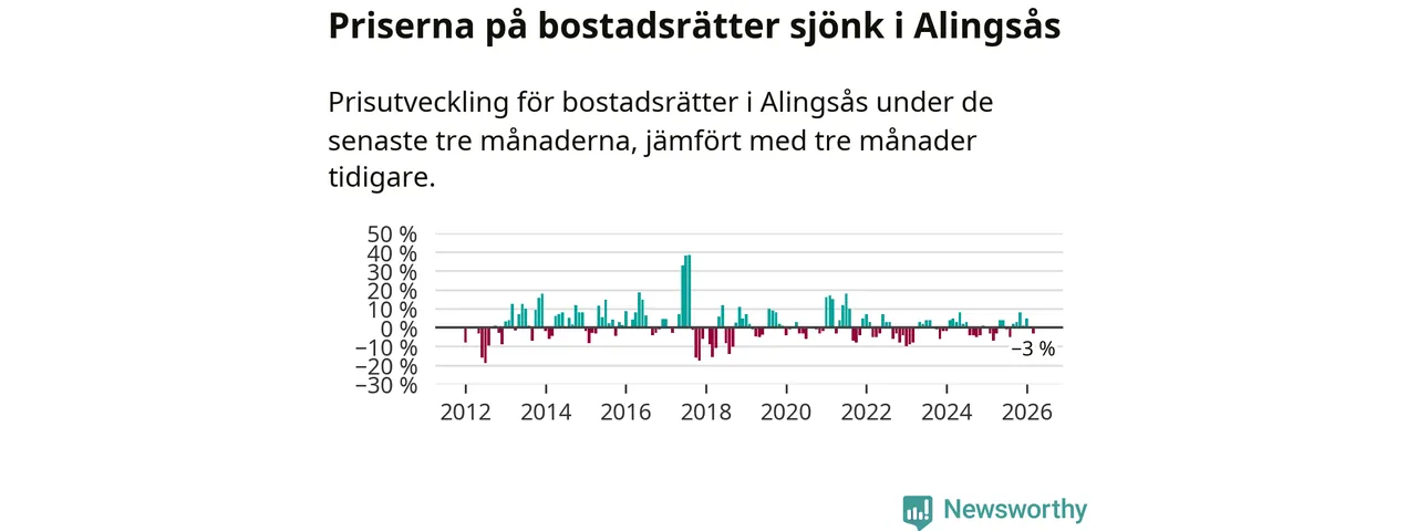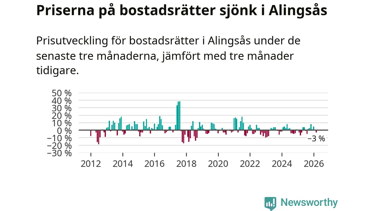Priserna på bostadsrätter har gått ner i Alingsås kommun. Medelpriset på försäljningarna under de senaste tre månaderna visar på en nedgång med 3 procent.