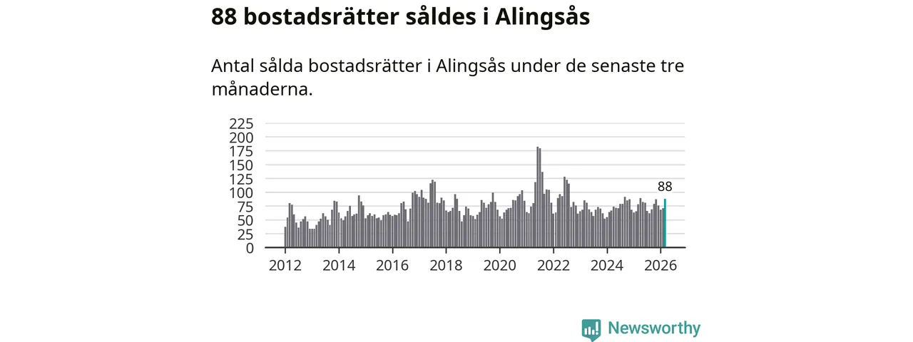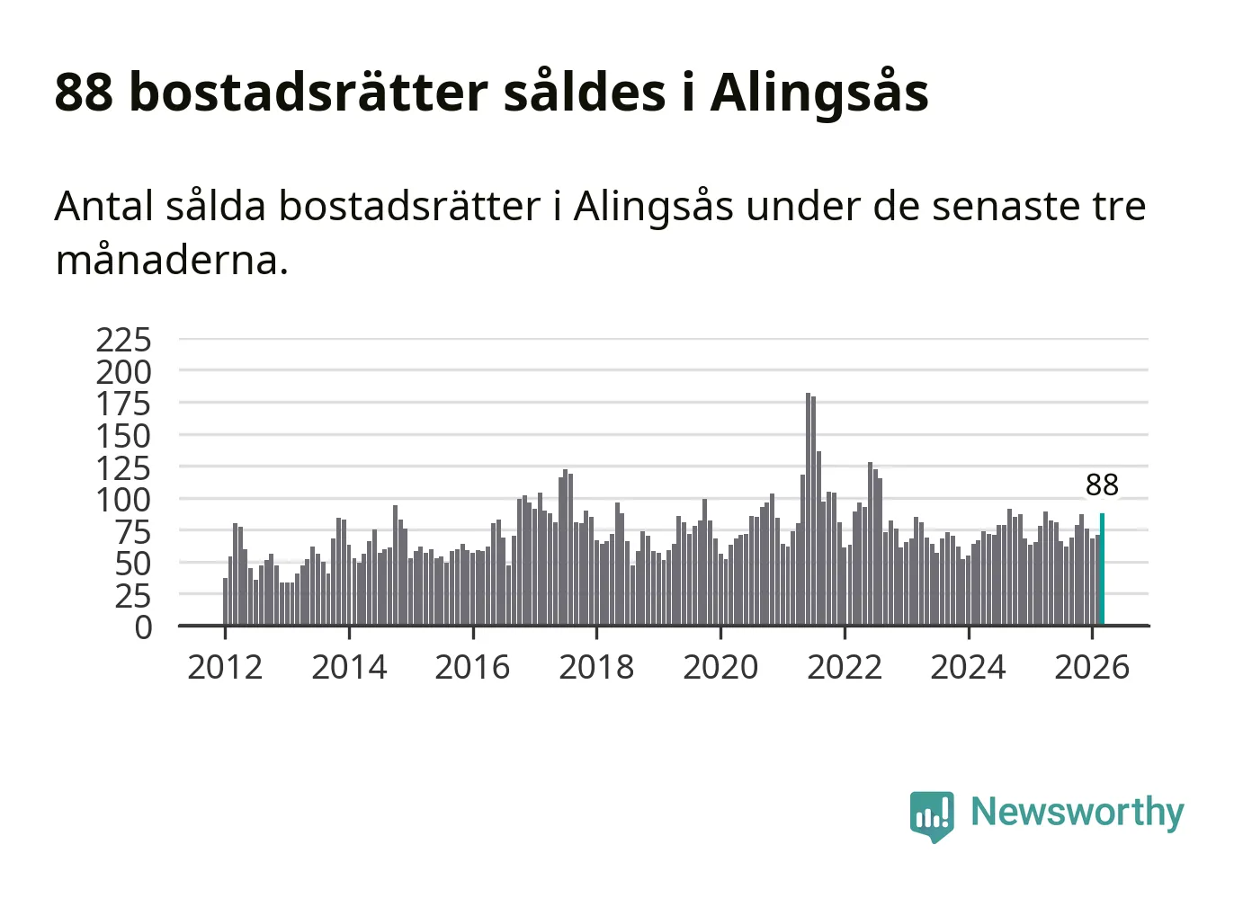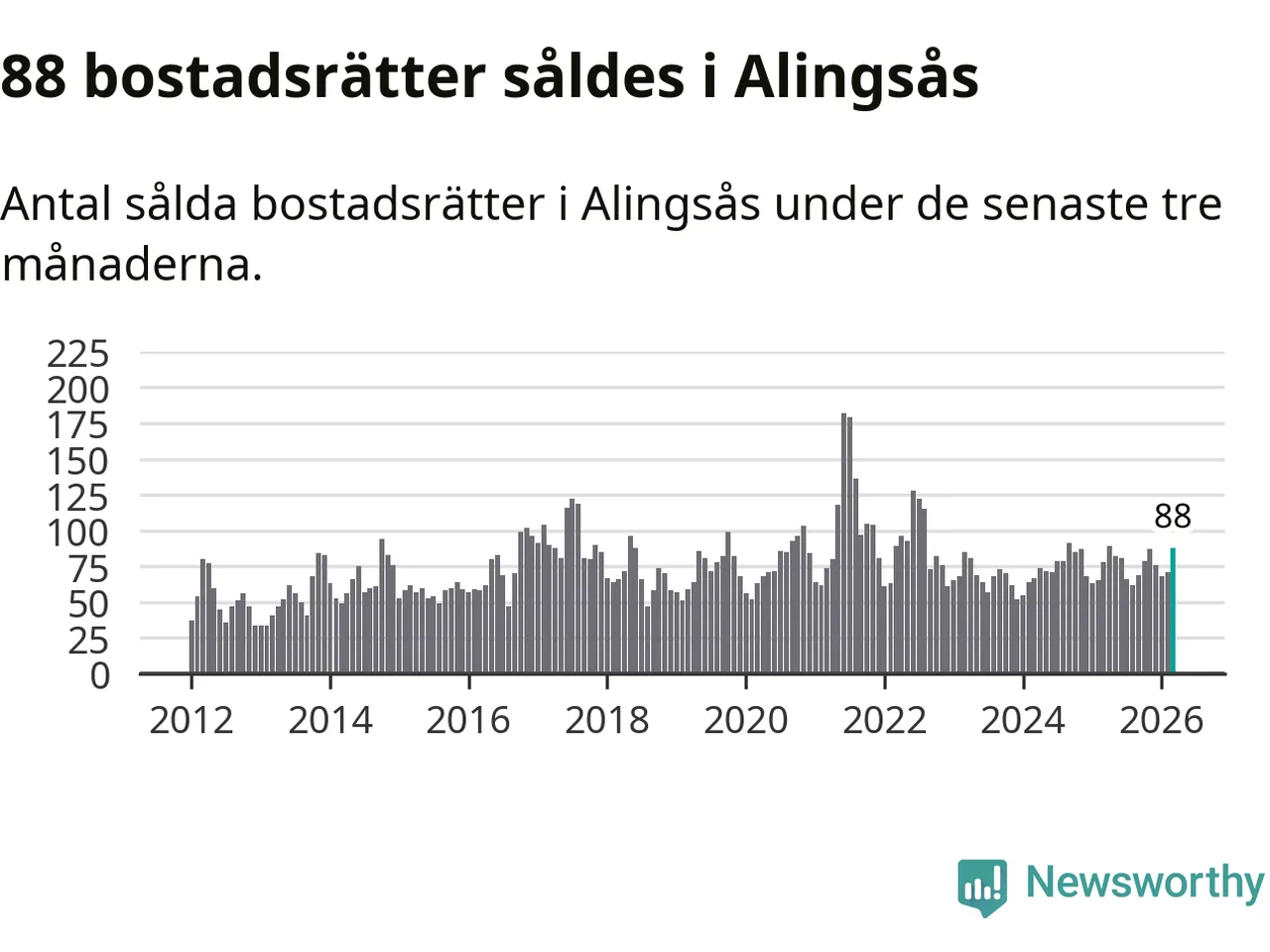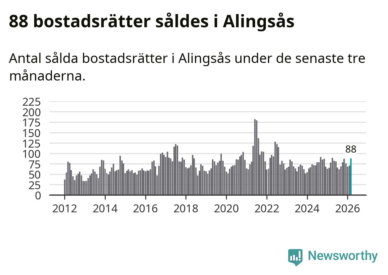 Sammanlagt såldes 88 bostadsrätter i Alingsås kommun mellan januari och mars till ett genomsnittligt pris på 2,5 miljoner kronor. I fjol gjordes 78 affärer vid den här tiden på året.