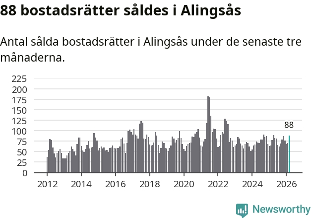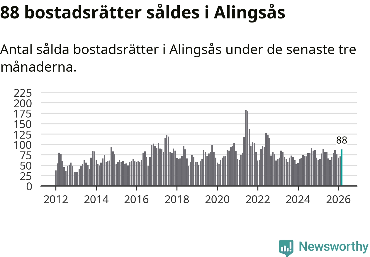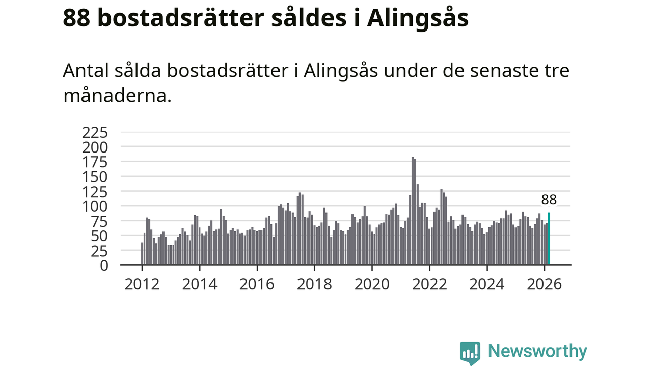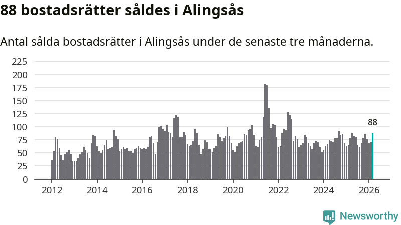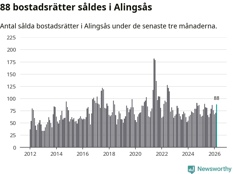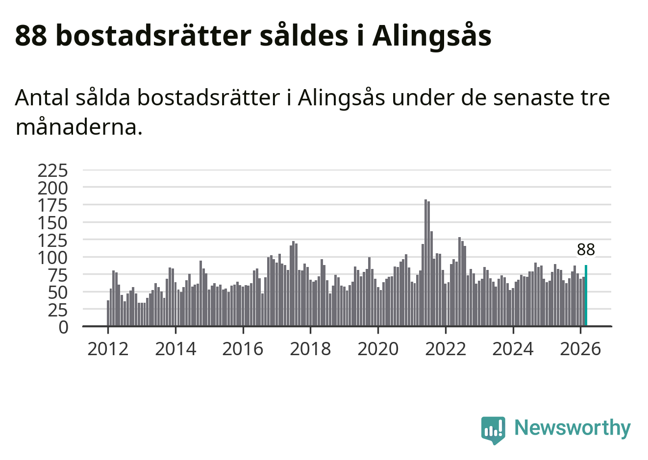Sammanlagt såldes 88 bostadsrätter i Alingsås kommun mellan januari och mars till ett genomsnittligt pris på 2,5 miljoner kronor. I fjol gjordes 78 affärer vid den här tiden på året.