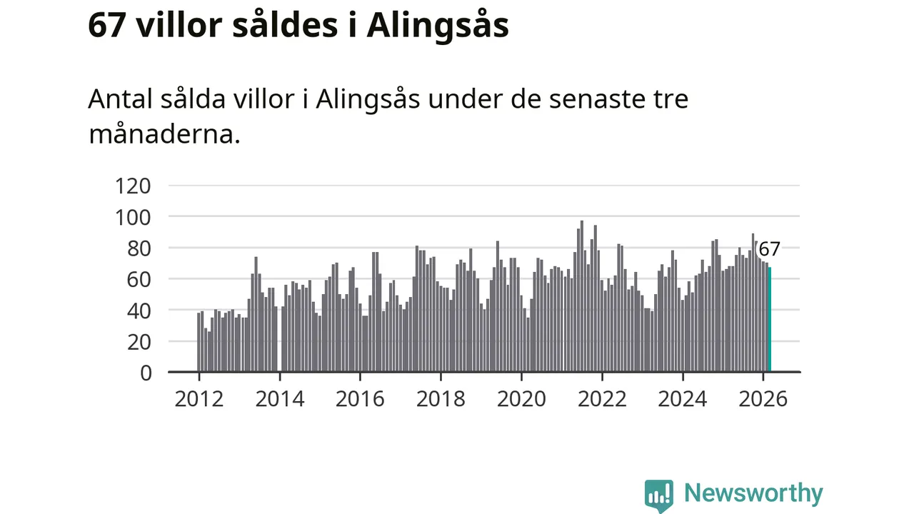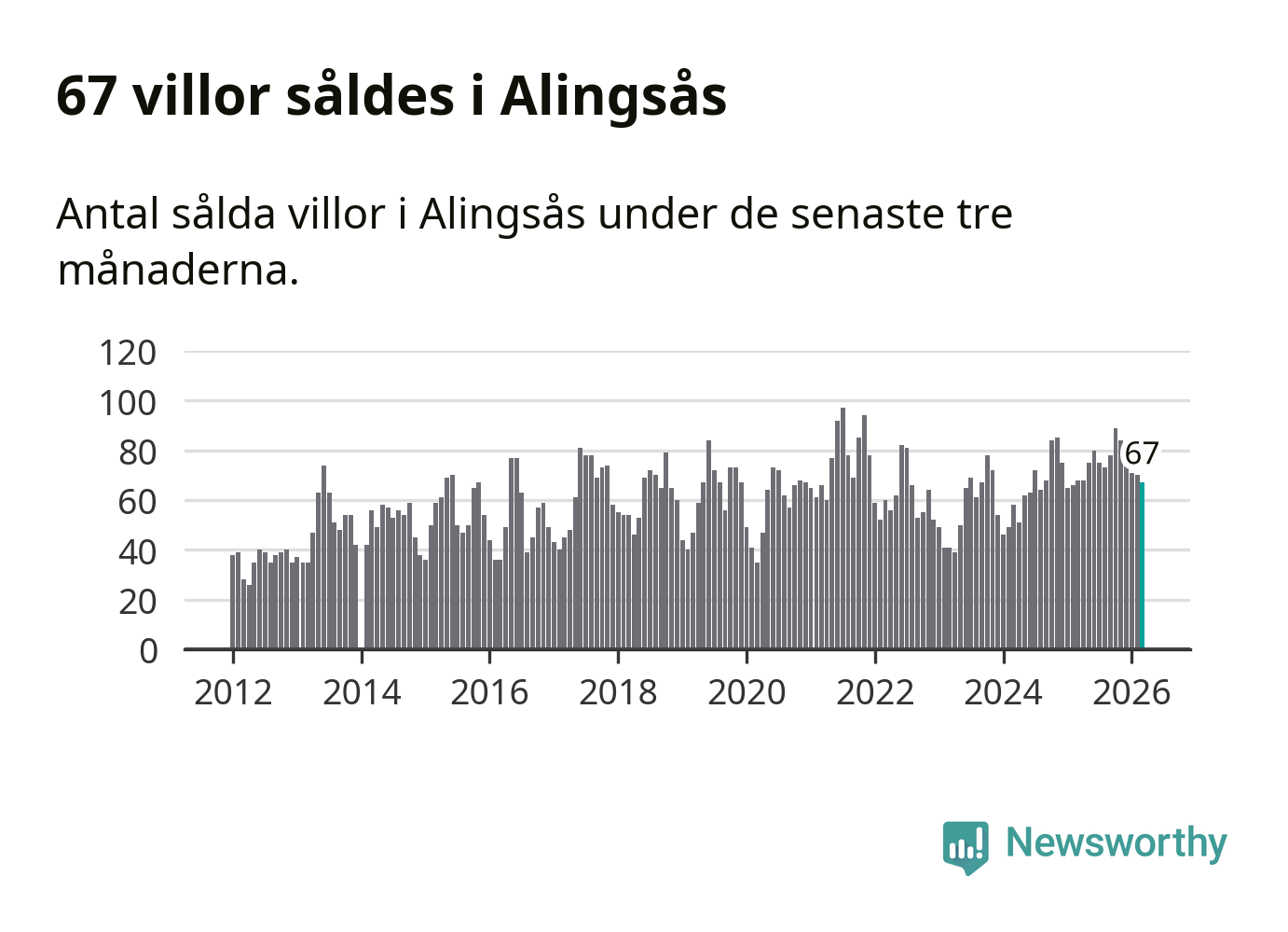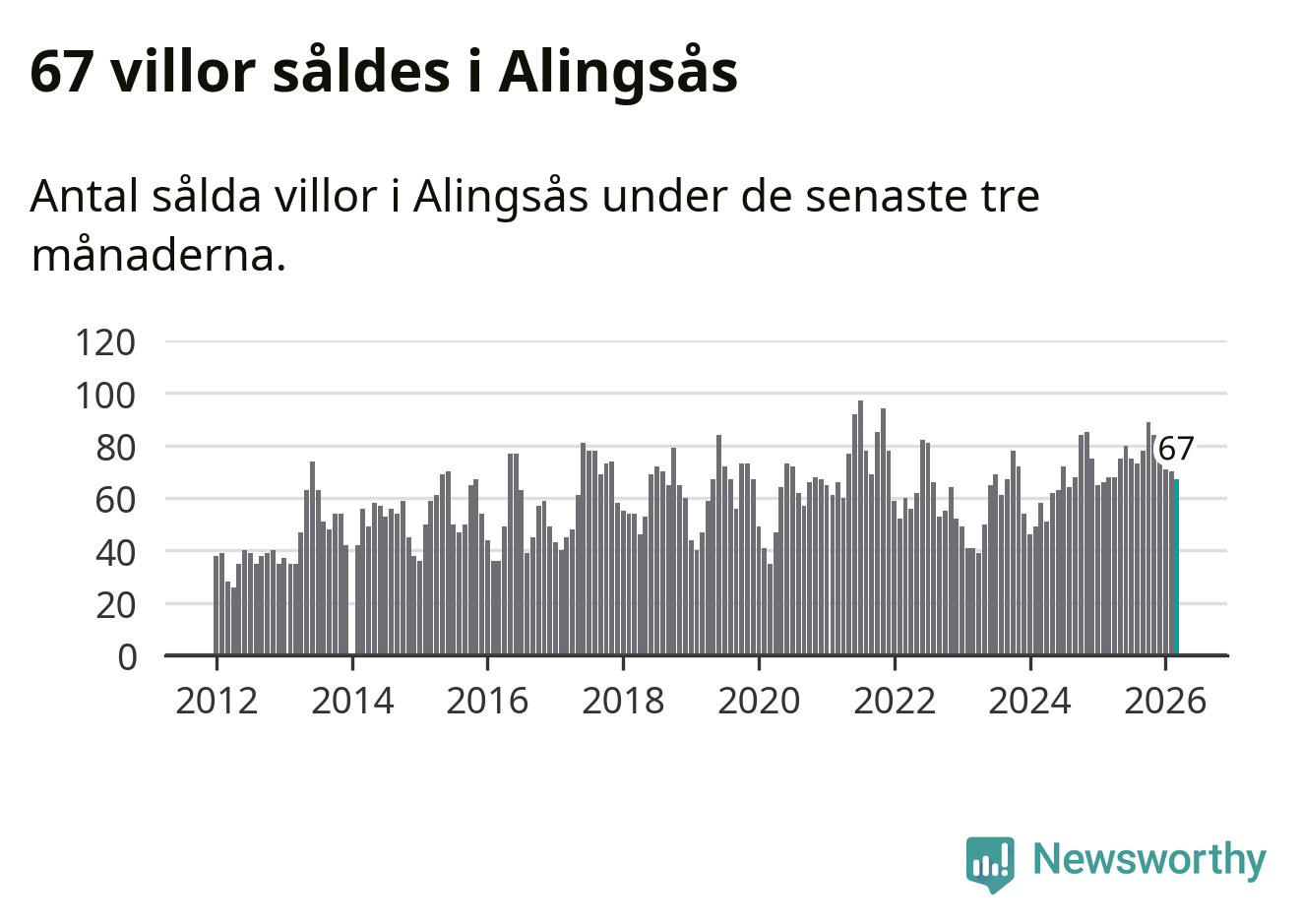 Sammanlagt såldes 67 villor i Alingsås kommun mellan januari och mars till ett genomsnittligt pris på 4,5 miljoner kronor. I fjol gjordes 68 affärer vid den här tiden på året.