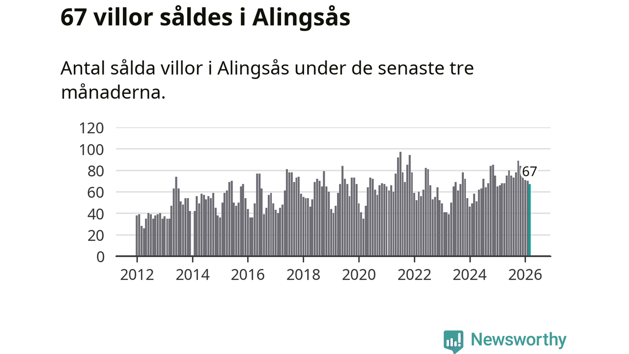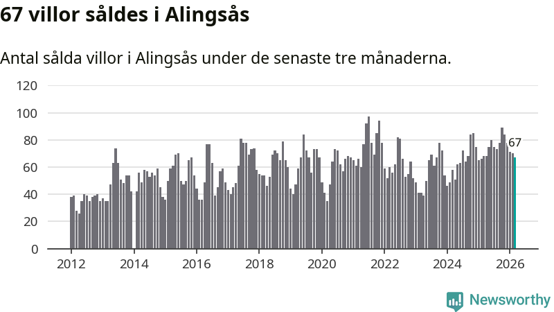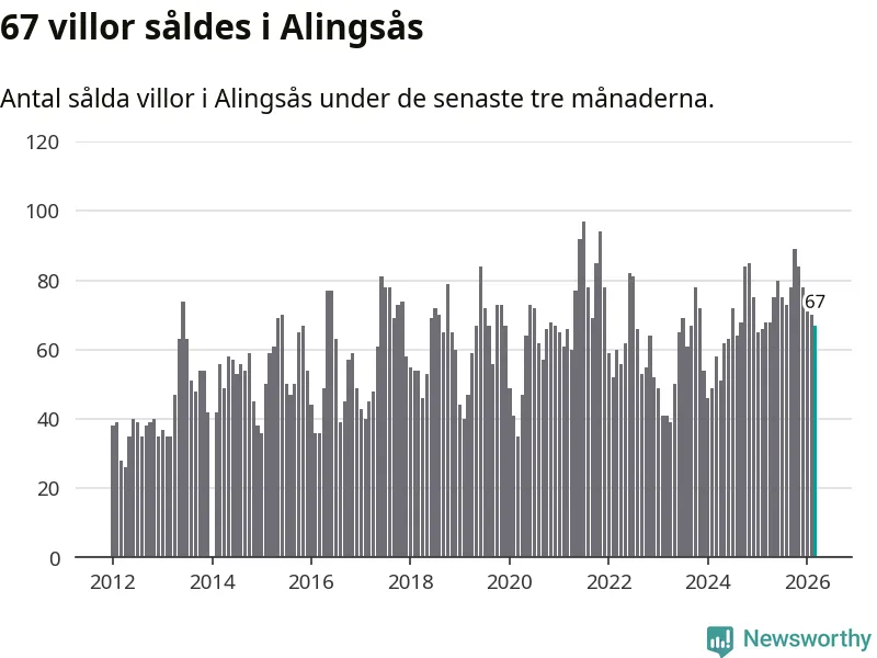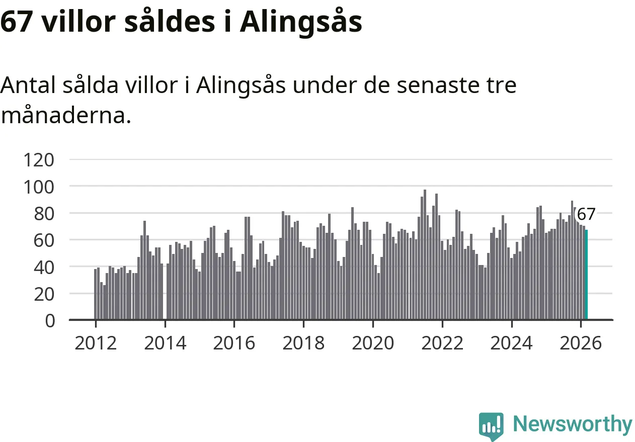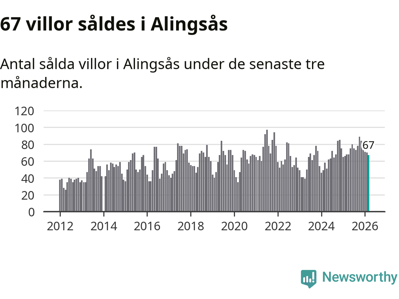 Sammanlagt såldes 67 villor i Alingsås kommun mellan januari och mars till ett genomsnittligt pris på 4,5 miljoner kronor. I fjol gjordes 68 affärer vid den här tiden på året.