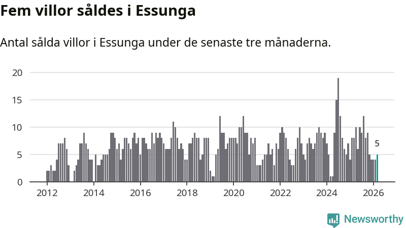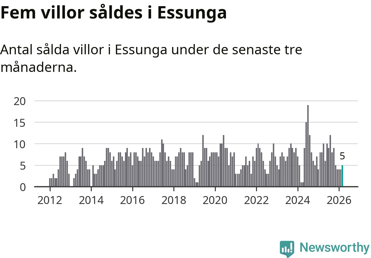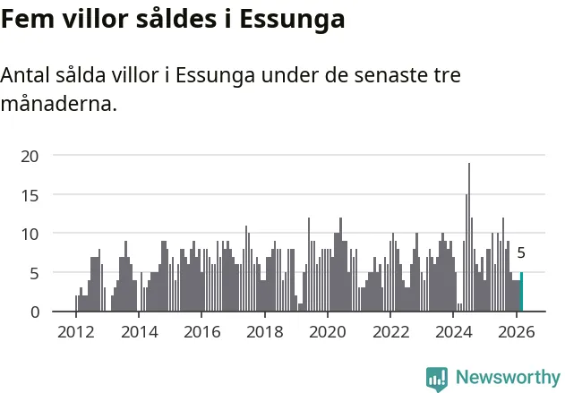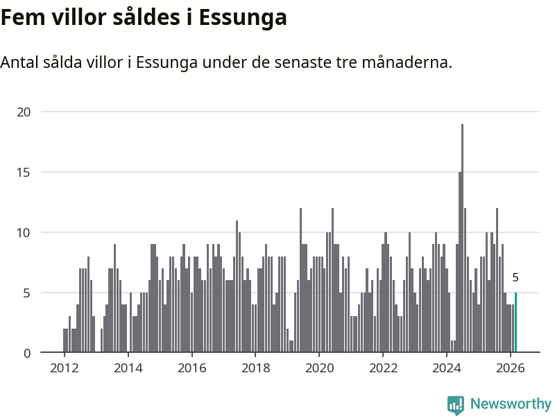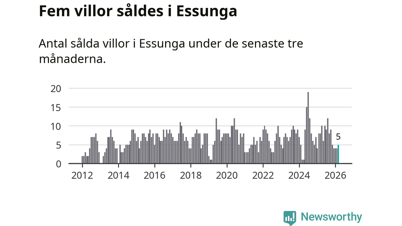 Mellan januari och mars gjordes sammanlagt fem affärer med villor i Essunga kommun. Det kan jämföras med åtta vid motsvarande tid i fjol.