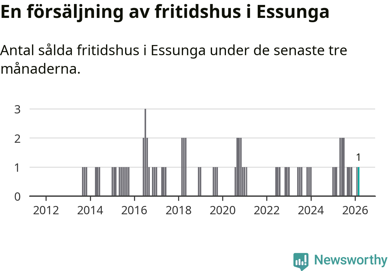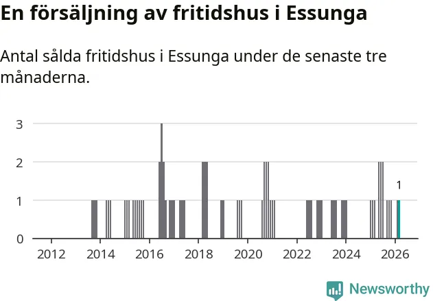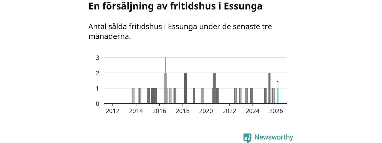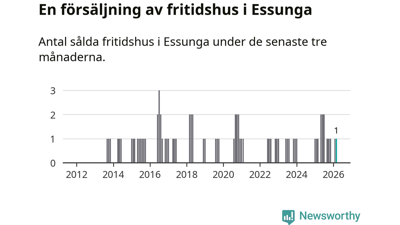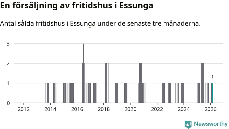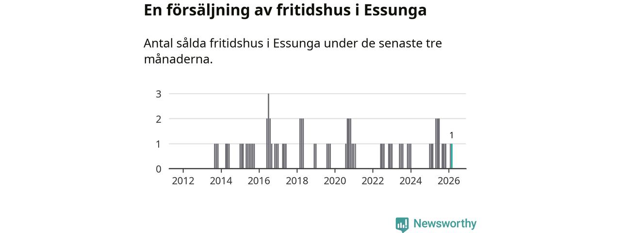 Mellan januari och mars gjordes sammanlagt en affär med fritidshus i Essunga kommun. Det är lika många affärer som vid motsvarande tid i fjol.