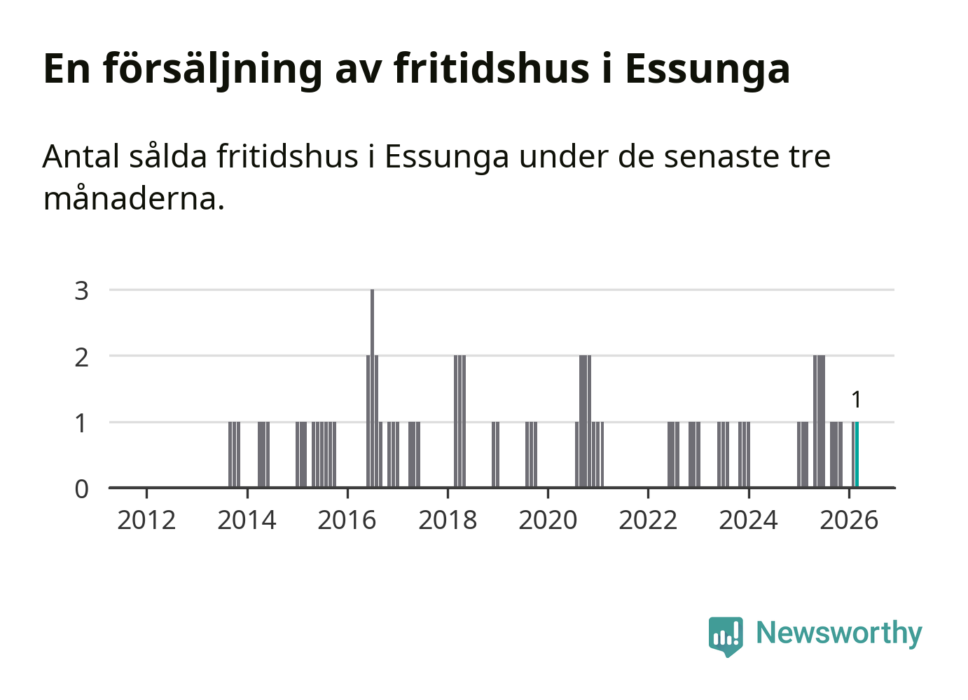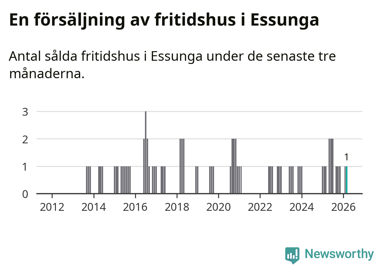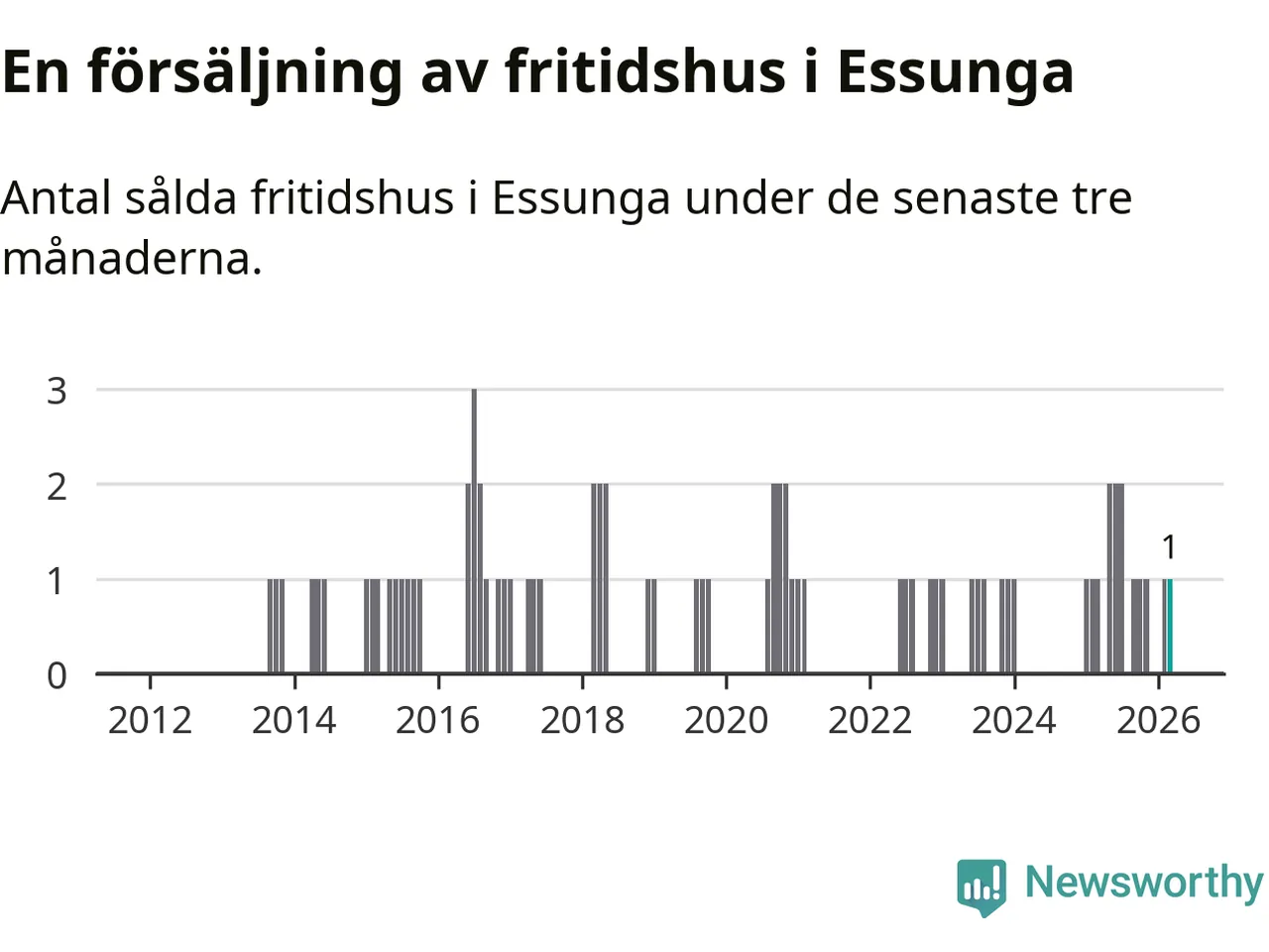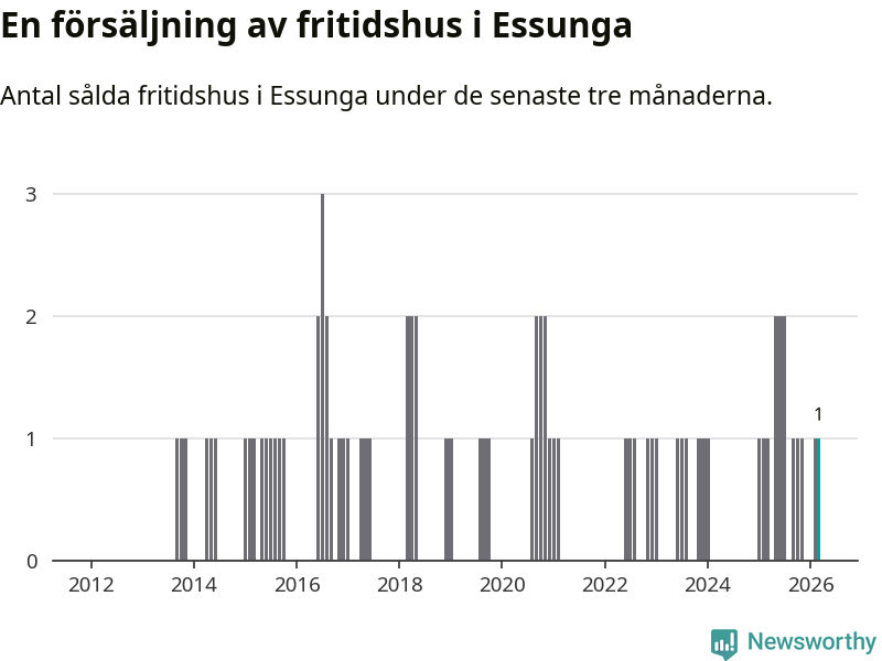 Mellan januari och mars gjordes sammanlagt en affär med fritidshus i Essunga kommun. Det är lika många affärer som vid motsvarande tid i fjol.