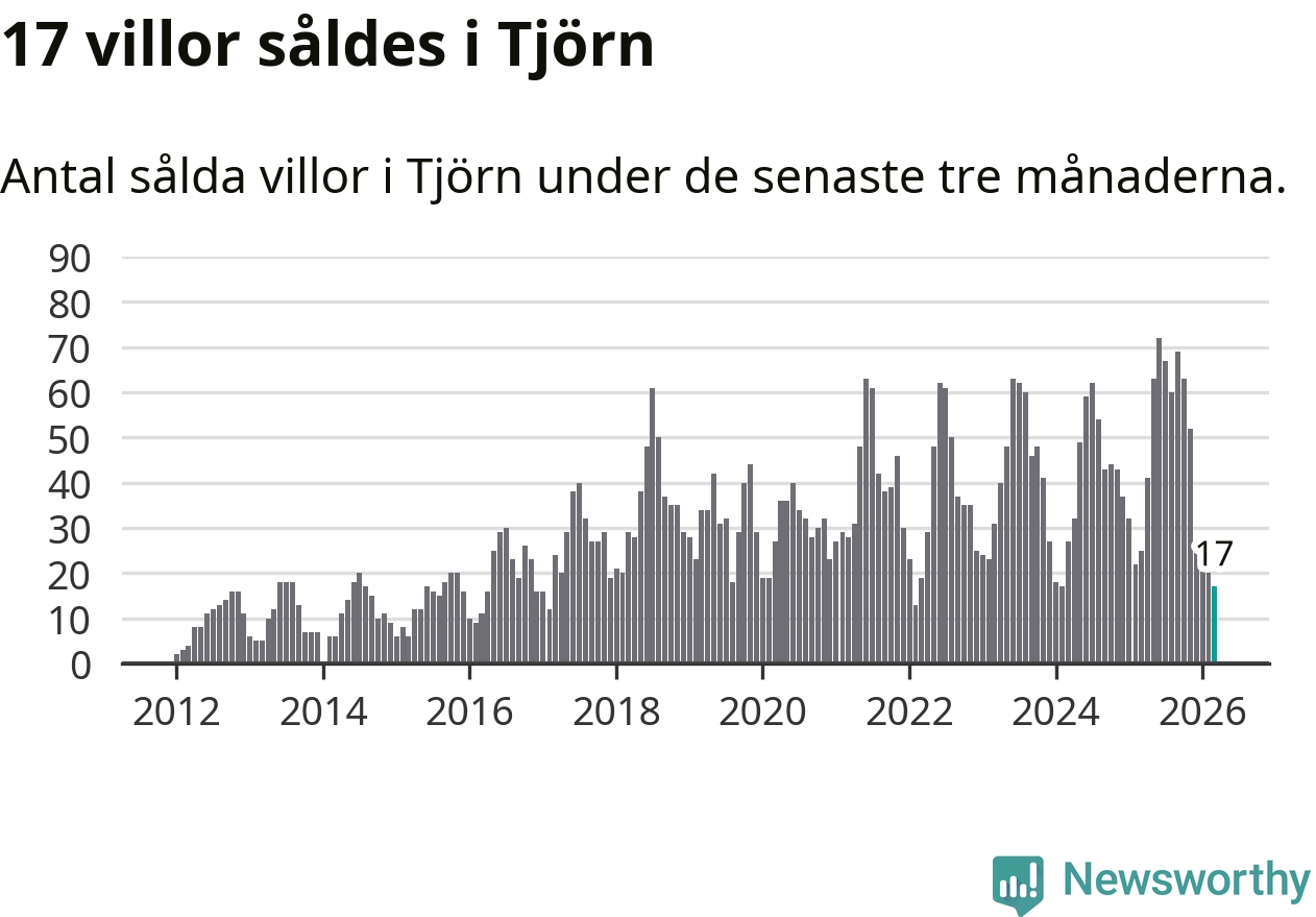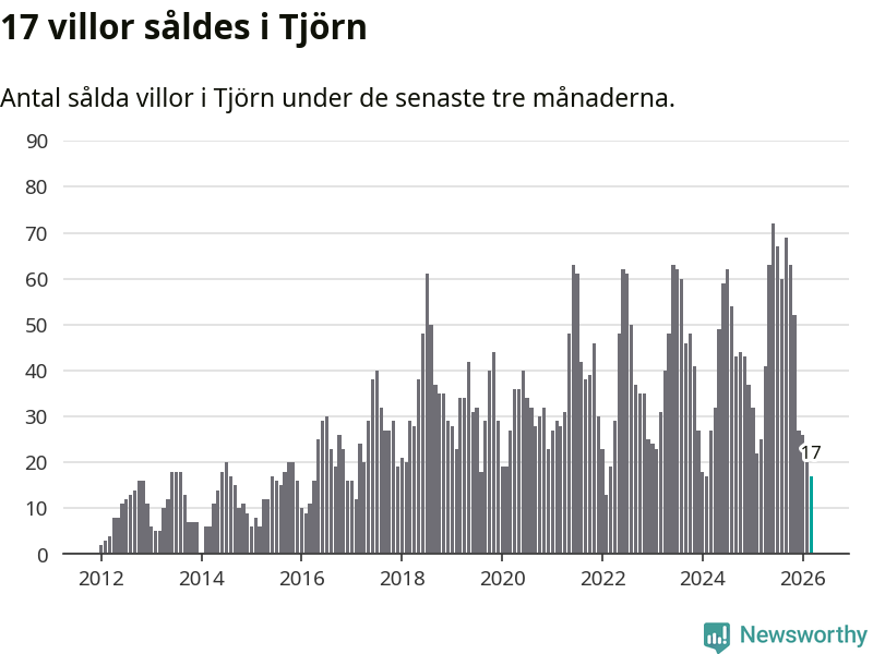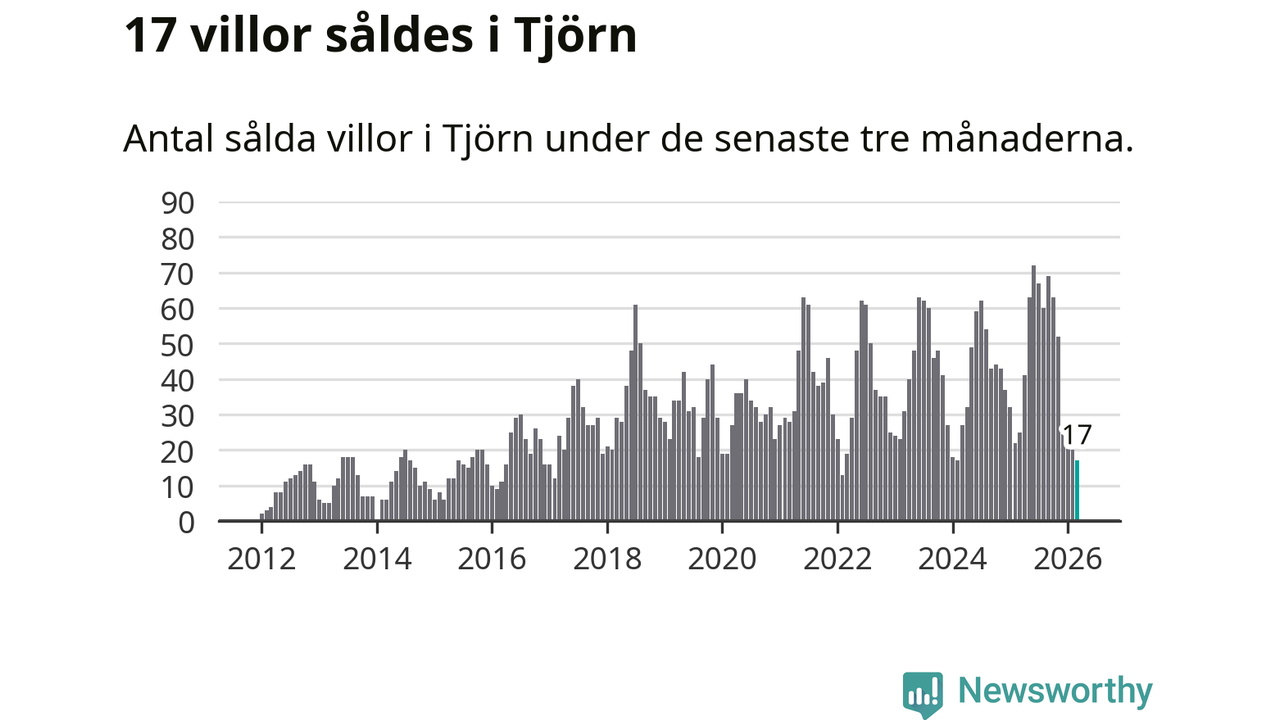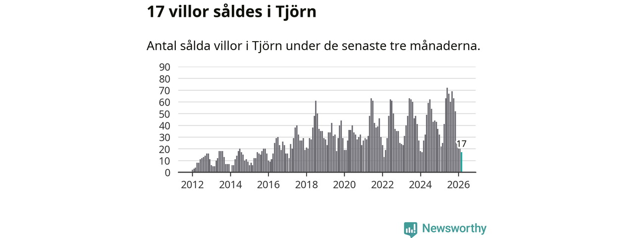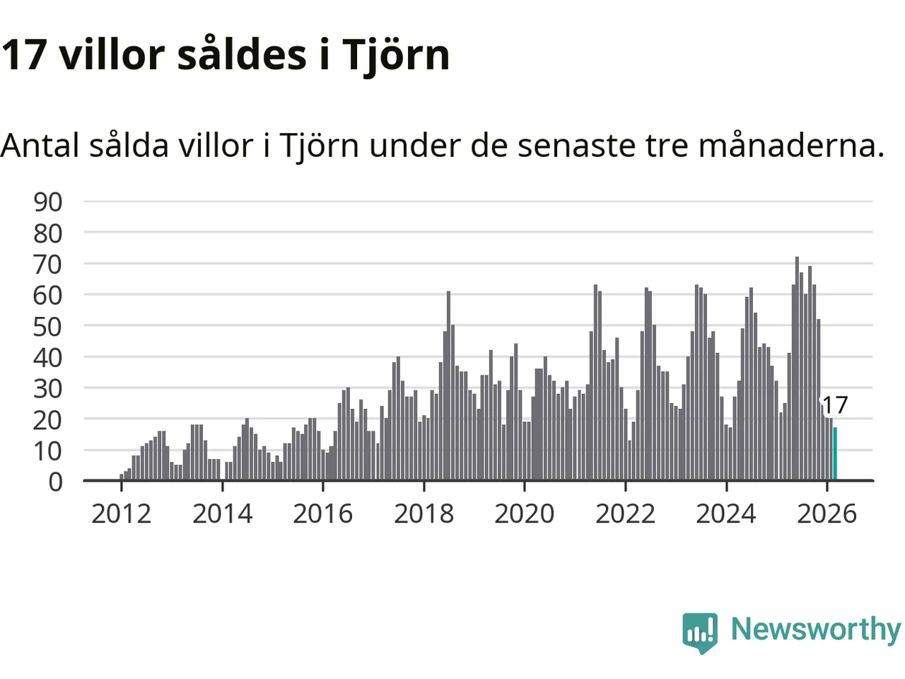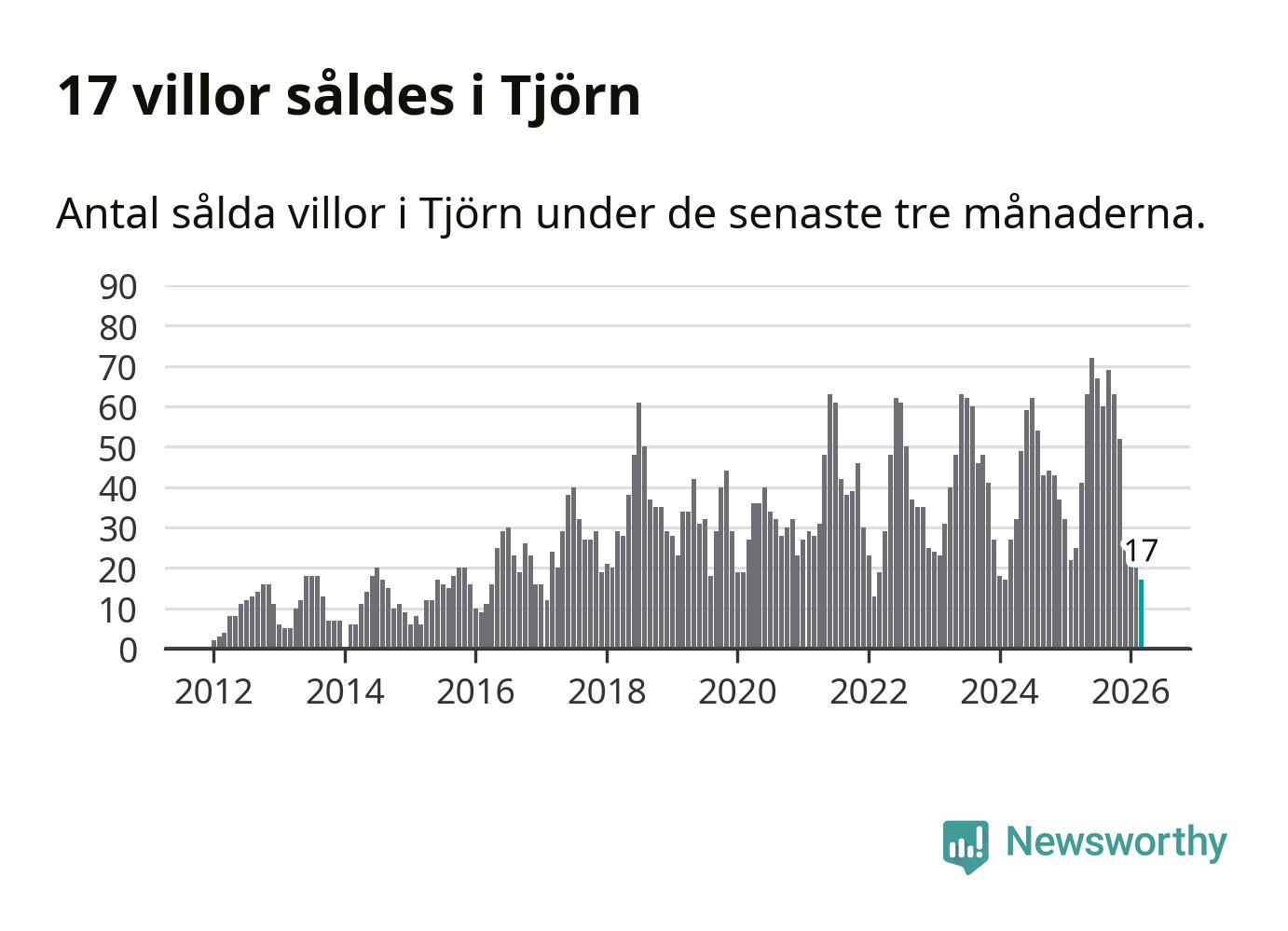 Mellan januari och mars gjordes sammanlagt 17 affärer med villor i Tjörns kommun. Det kan jämföras med 25 vid motsvarande tid i fjol.