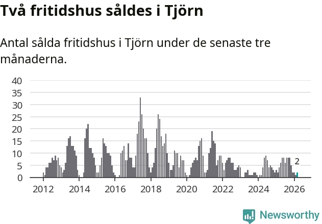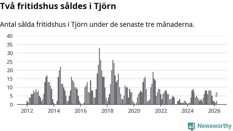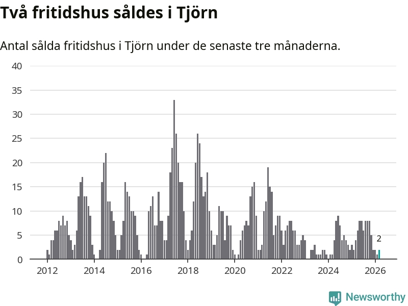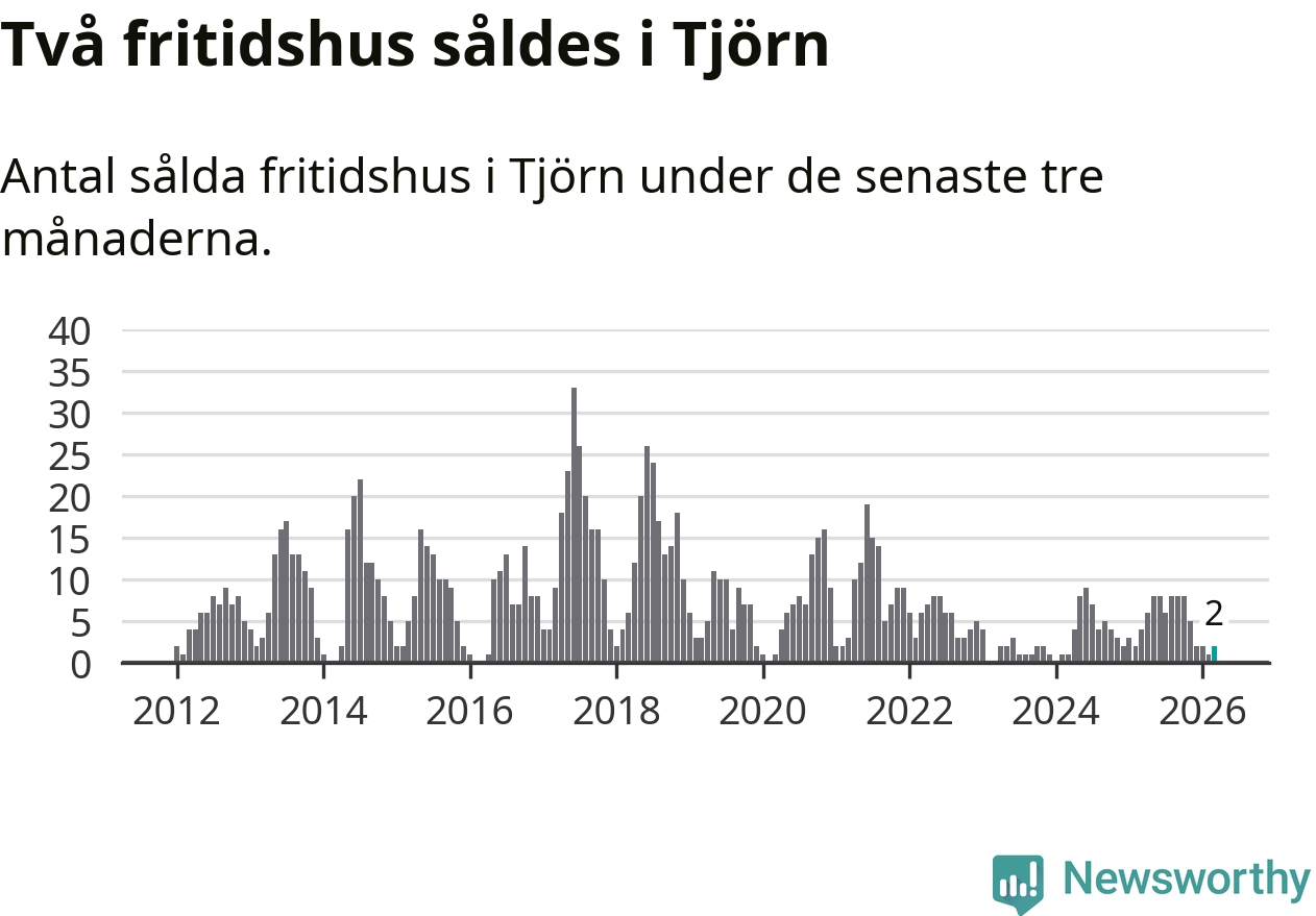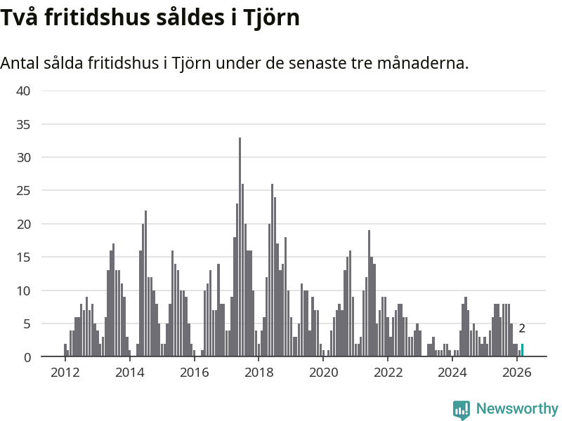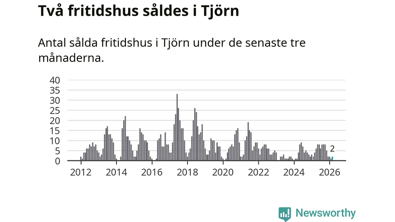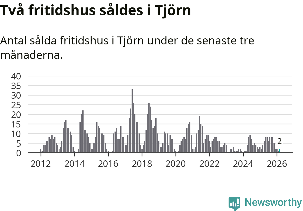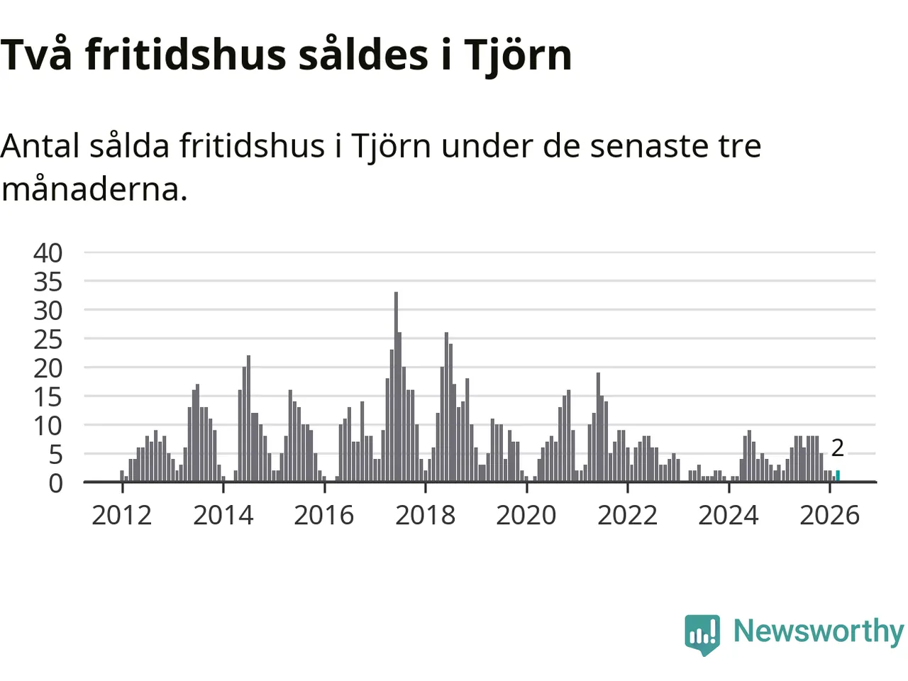 Mellan januari och mars gjordes sammanlagt två affärer med fritidshus i Tjörns kommun. Det kan jämföras med fyra vid motsvarande tid i fjol.