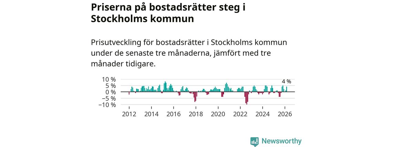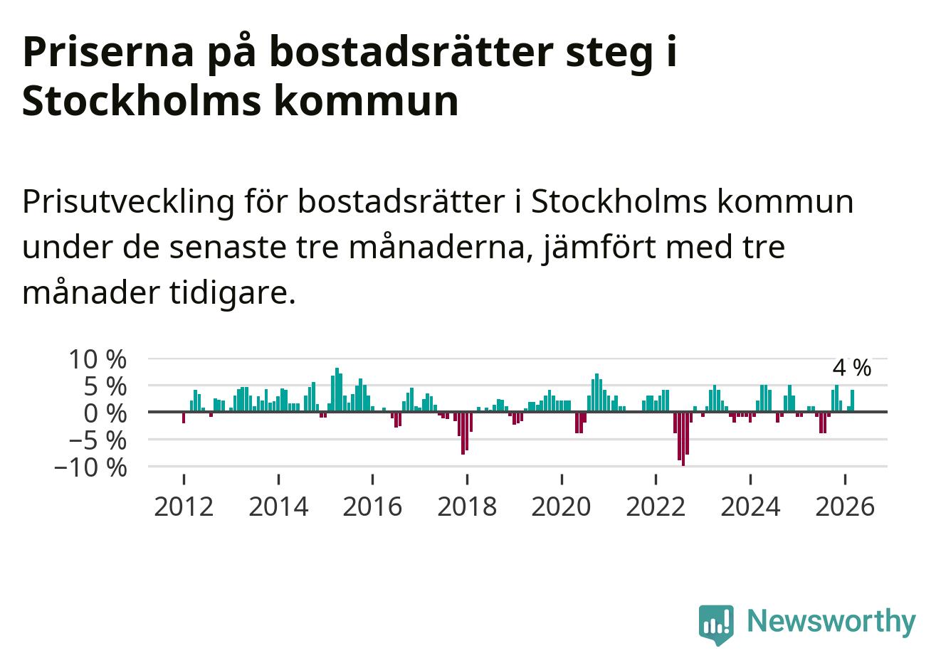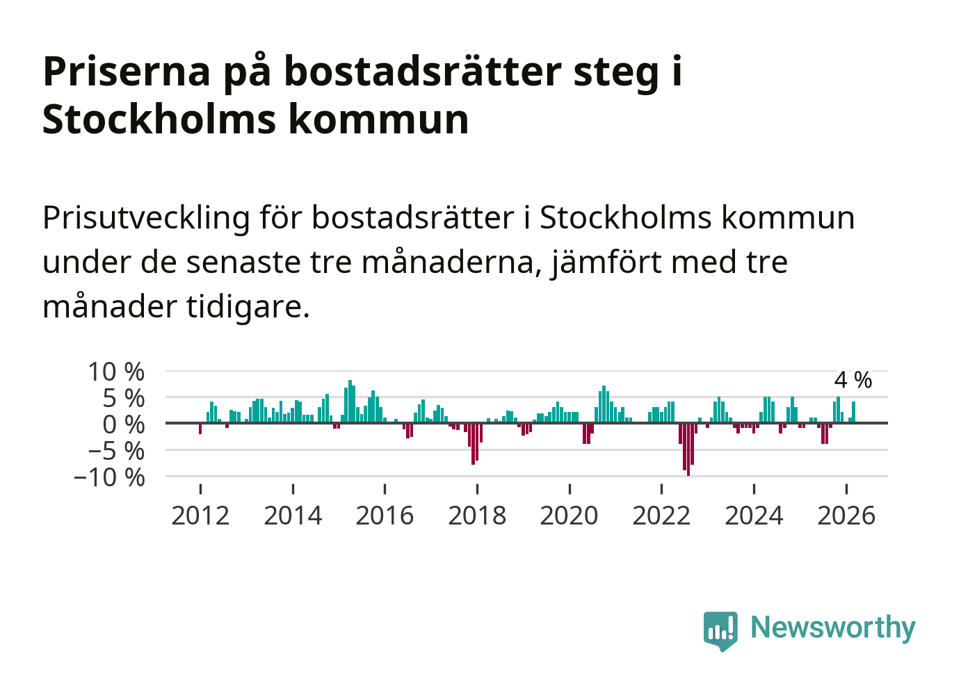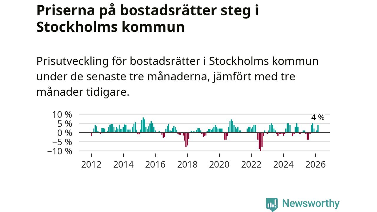 Priserna på bostadsrätter har gått upp i Stockholms kommun. Medelpriset på försäljningarna under de senaste tre månaderna visar på en uppgång med 4 procent.