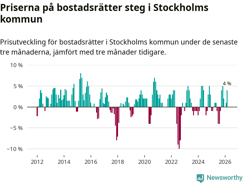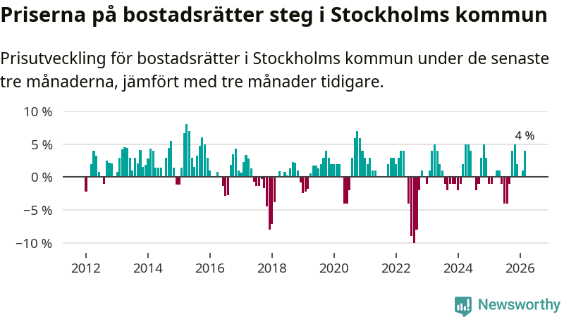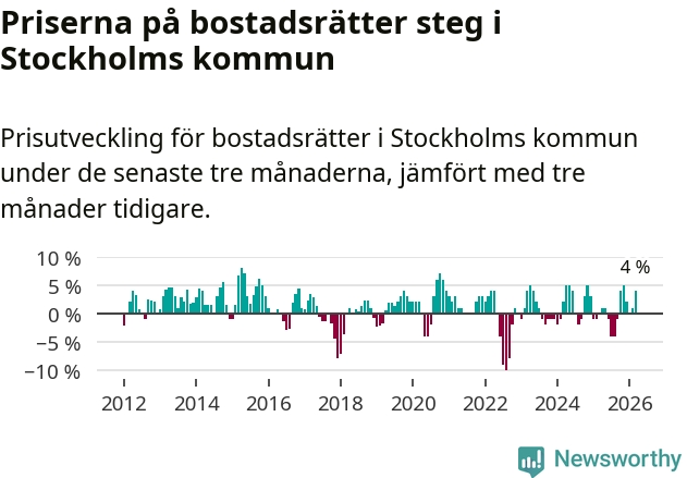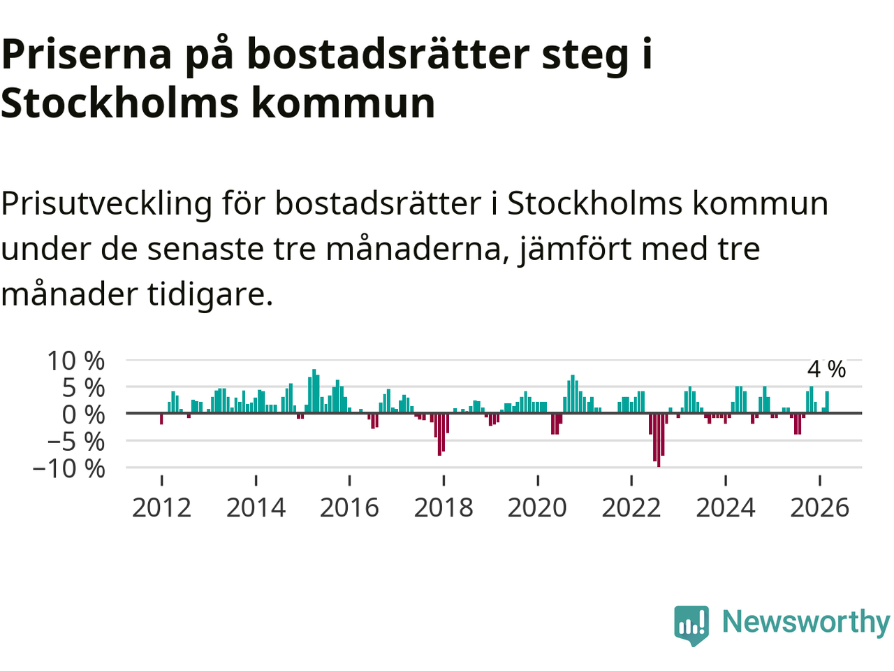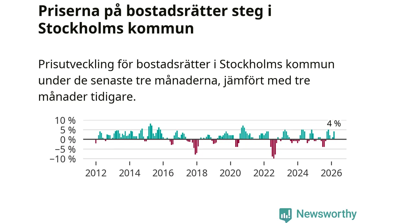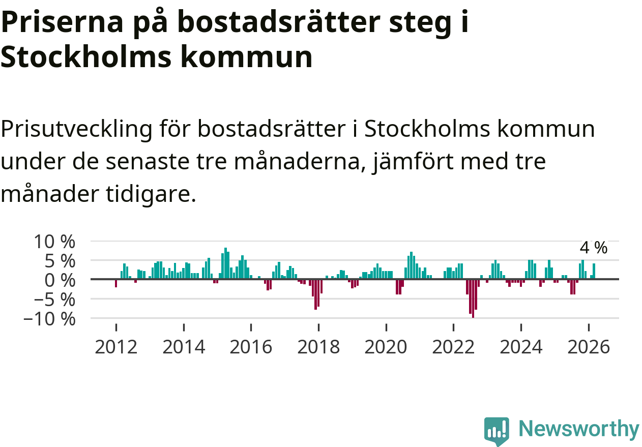 Priserna på bostadsrätter har gått upp i Stockholms kommun. Medelpriset på försäljningarna under de senaste tre månaderna visar på en uppgång med 4 procent.