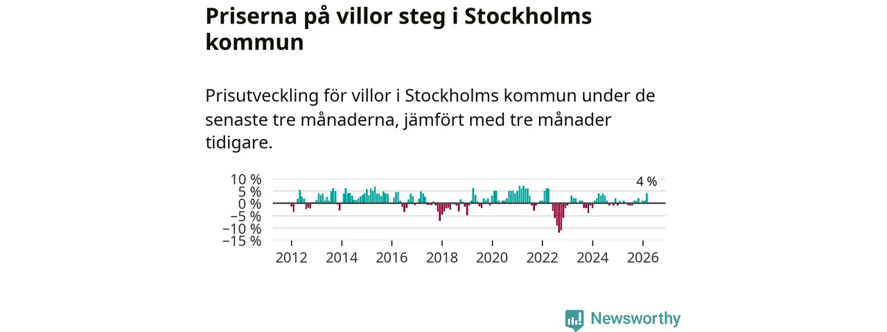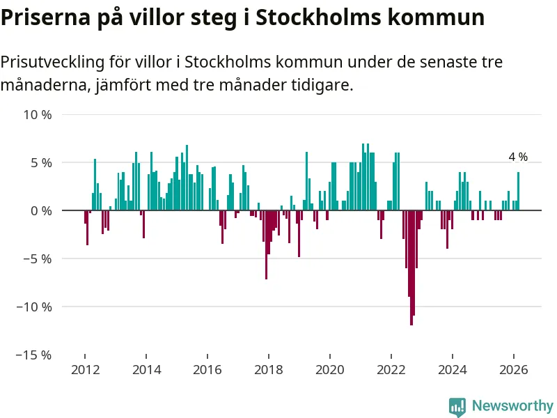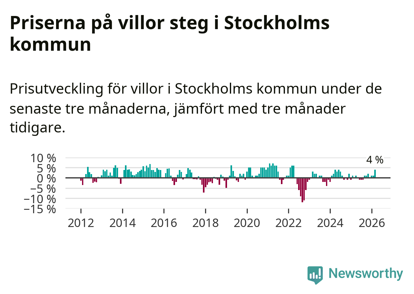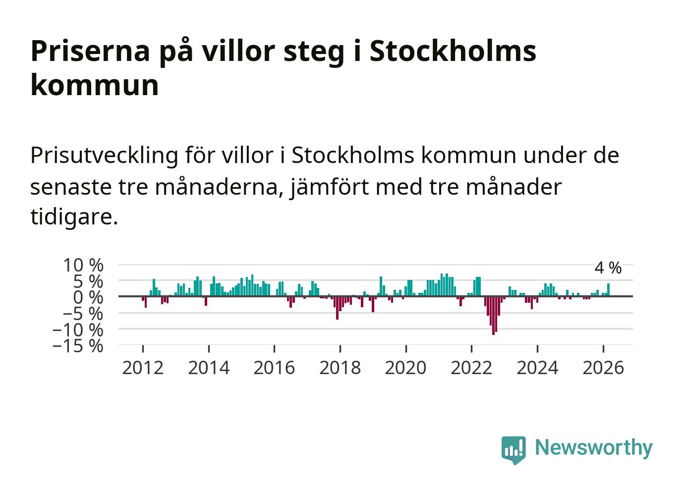Villapriserna har gått upp i Stockholms kommun. Medelpriset på försäljningarna under de senaste tre månaderna visar på en uppgång med 4 procent.