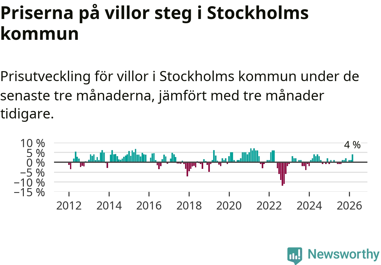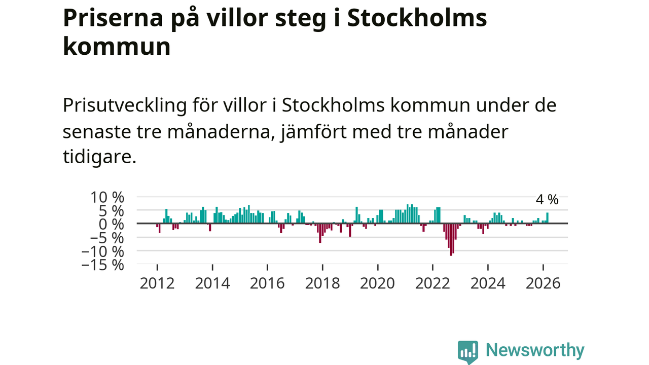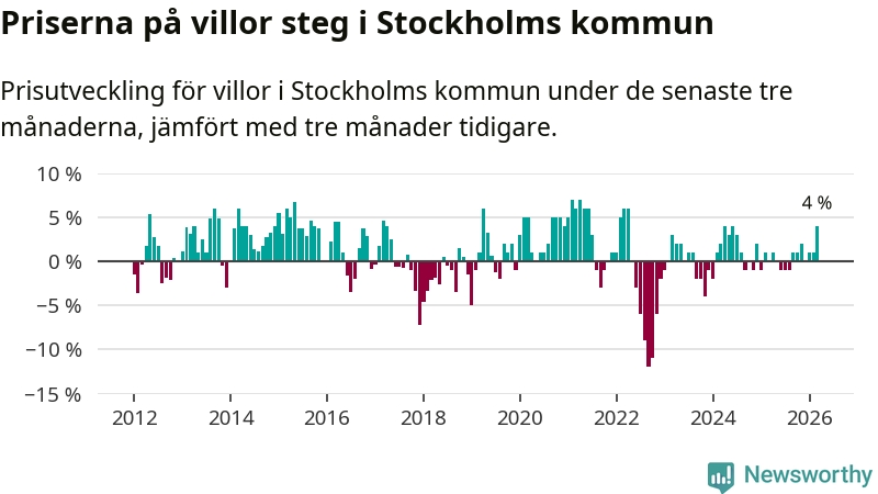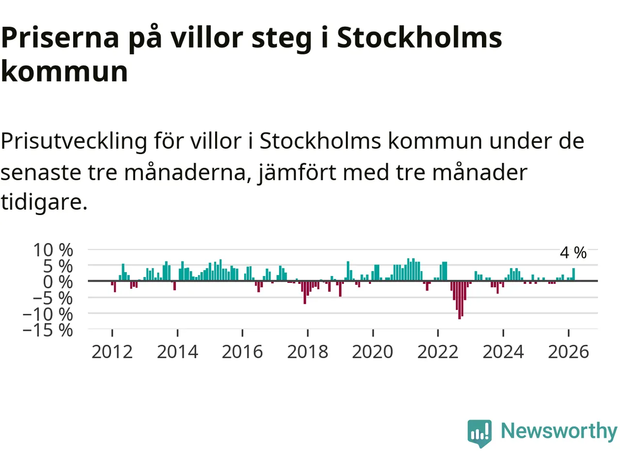 Villapriserna har gått upp i Stockholms kommun. Medelpriset på försäljningarna under de senaste tre månaderna visar på en uppgång med 4 procent.
