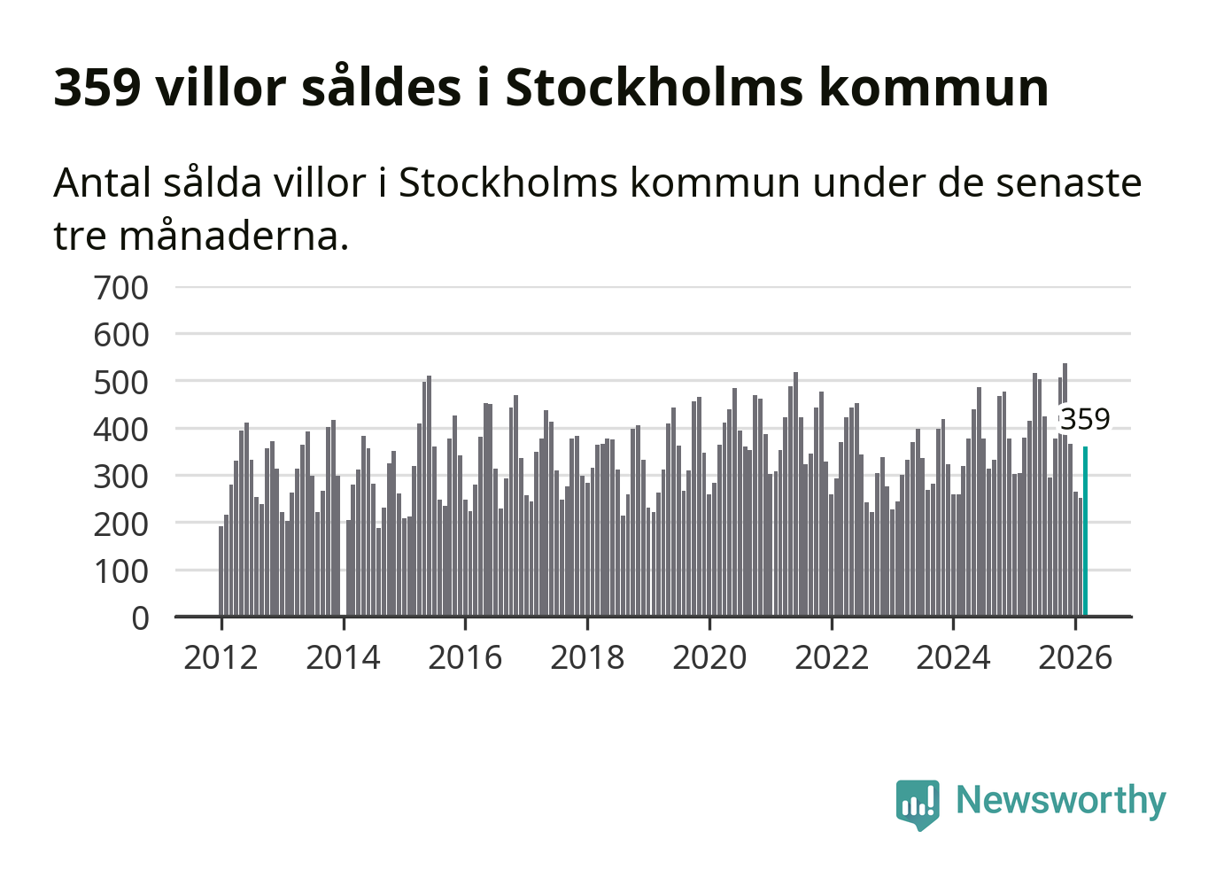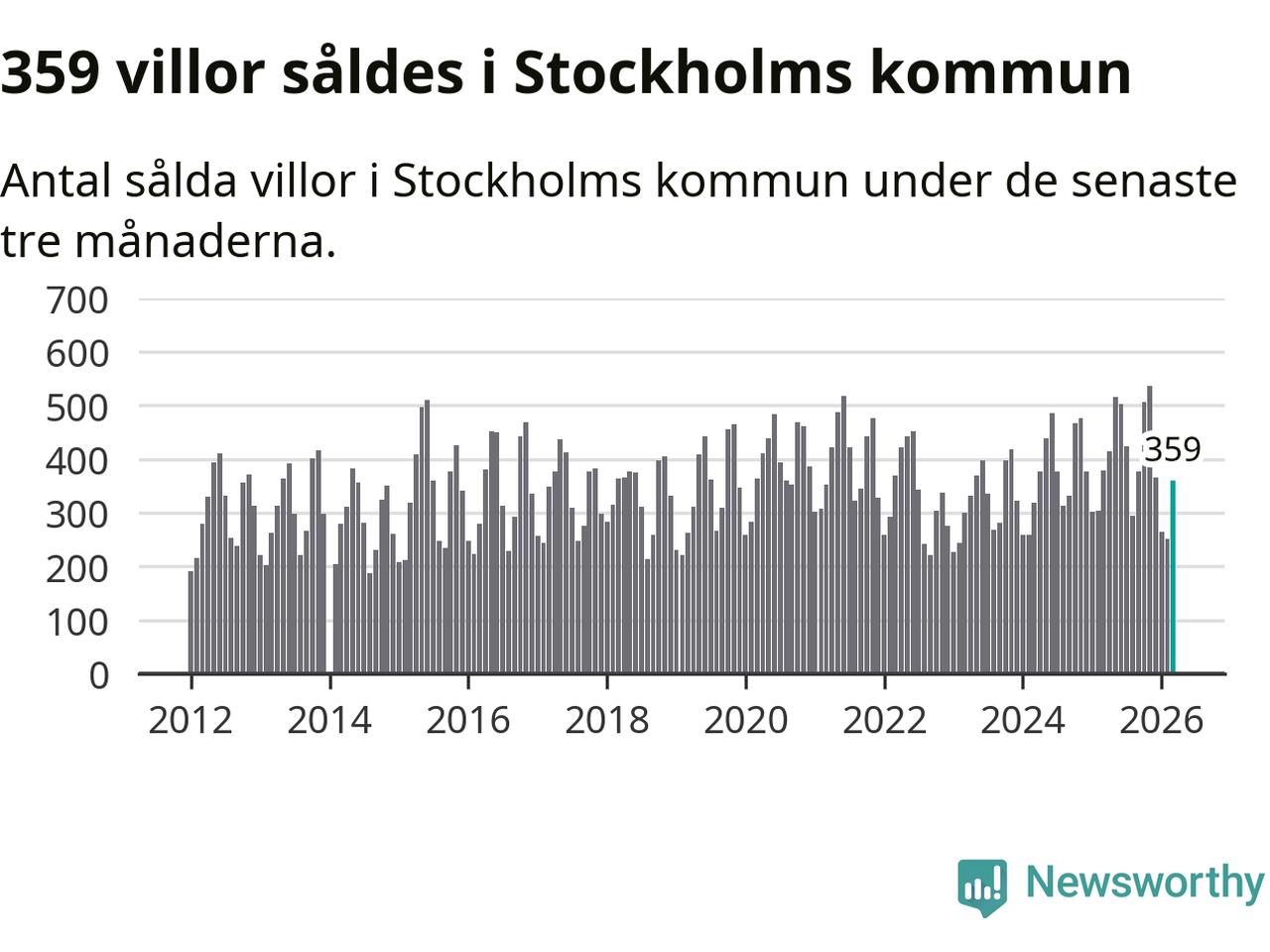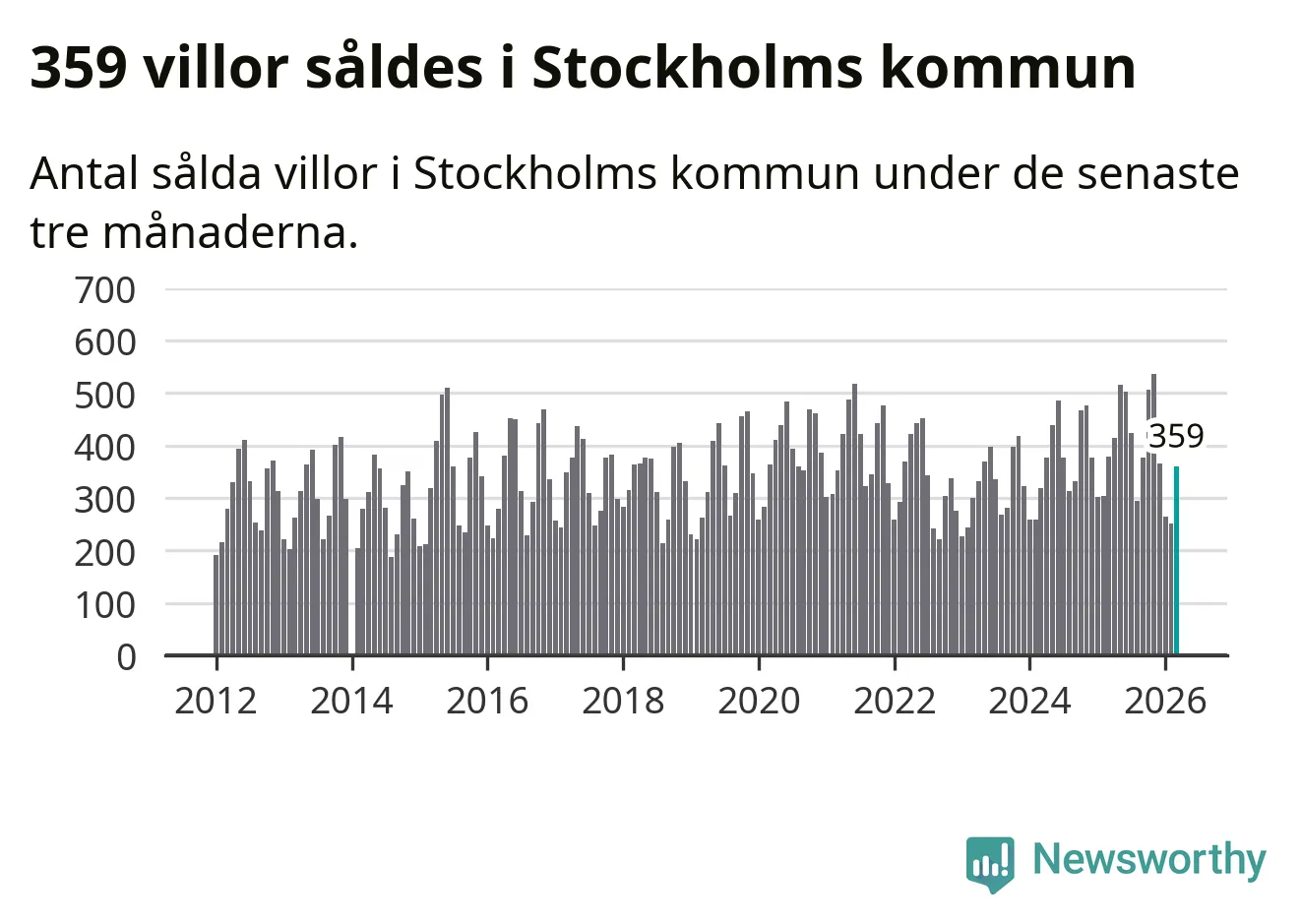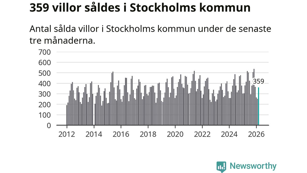 Sammanlagt såldes 359 villor i Stockholms kommun mellan januari och mars till ett genomsnittligt pris på 9,5 miljoner kronor. I fjol gjordes 379 affärer vid den här tiden på året.