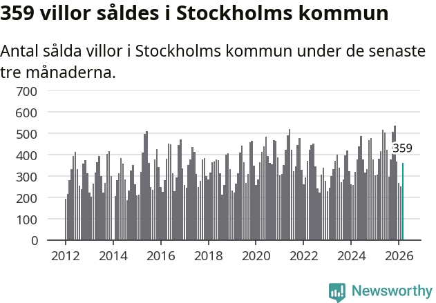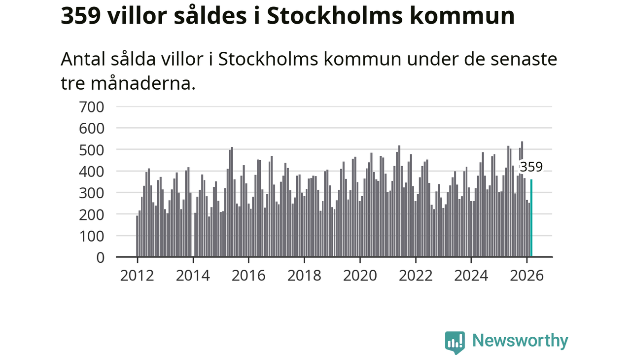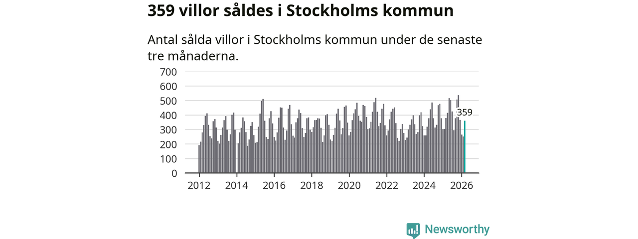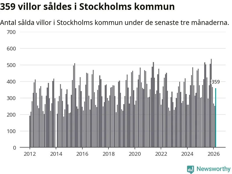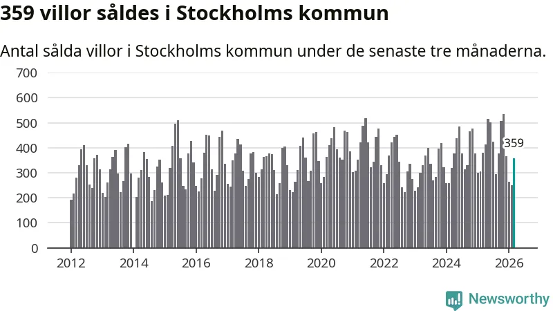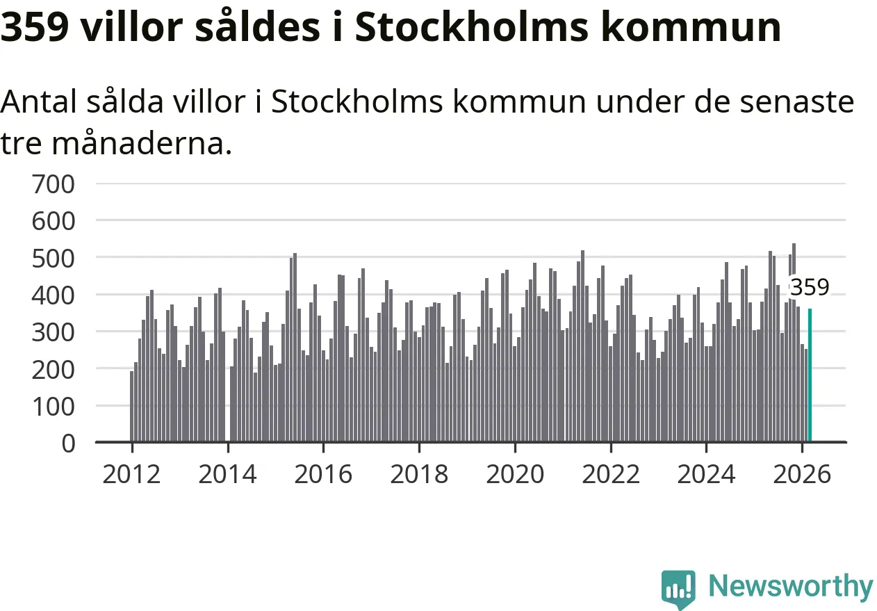Sammanlagt såldes 359 villor i Stockholms kommun mellan januari och mars till ett genomsnittligt pris på 9,5 miljoner kronor. I fjol gjordes 379 affärer vid den här tiden på året.