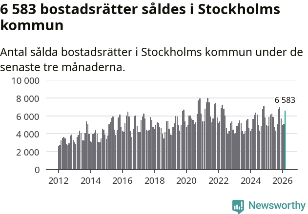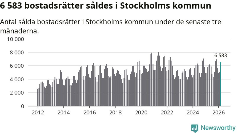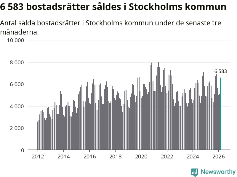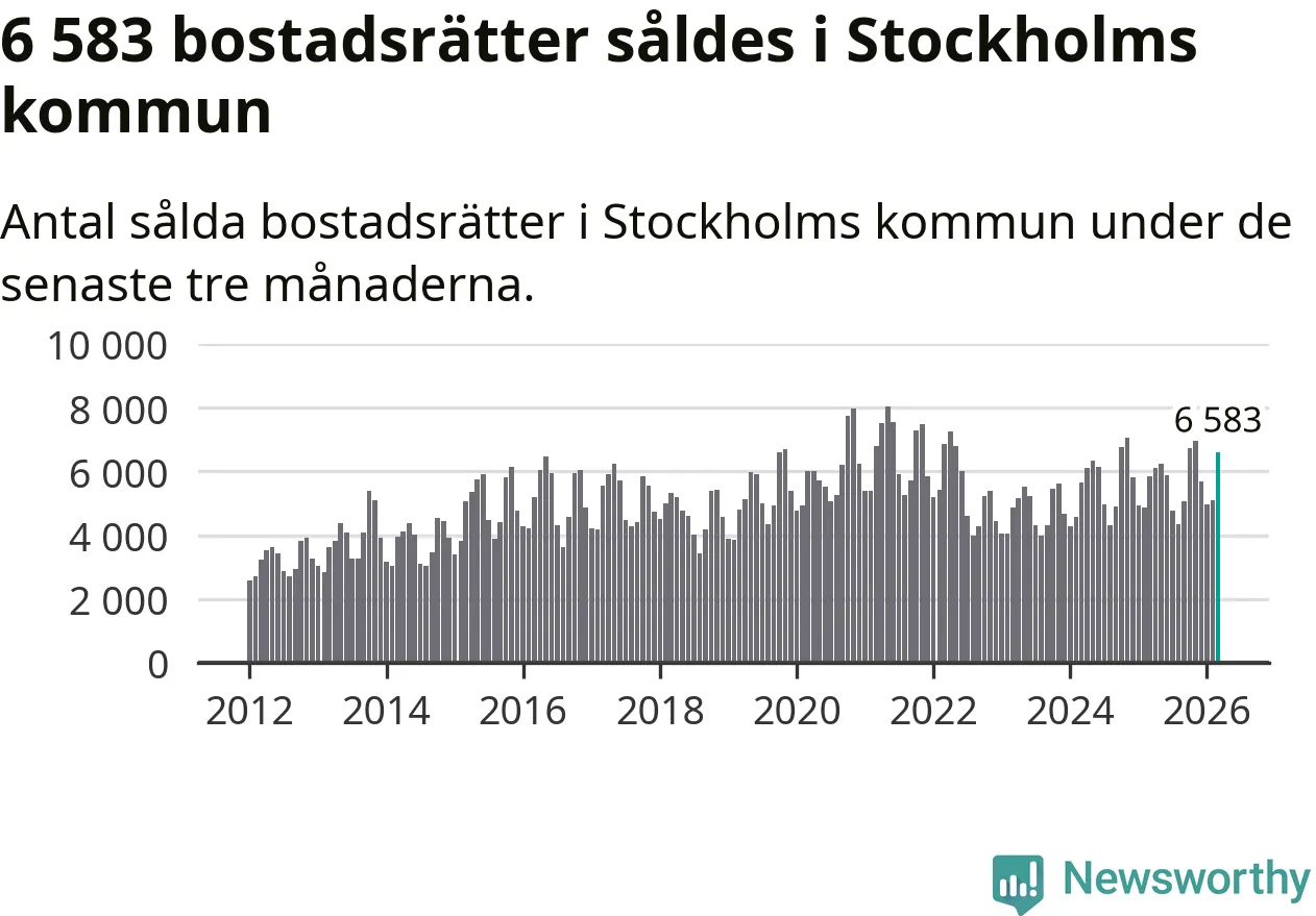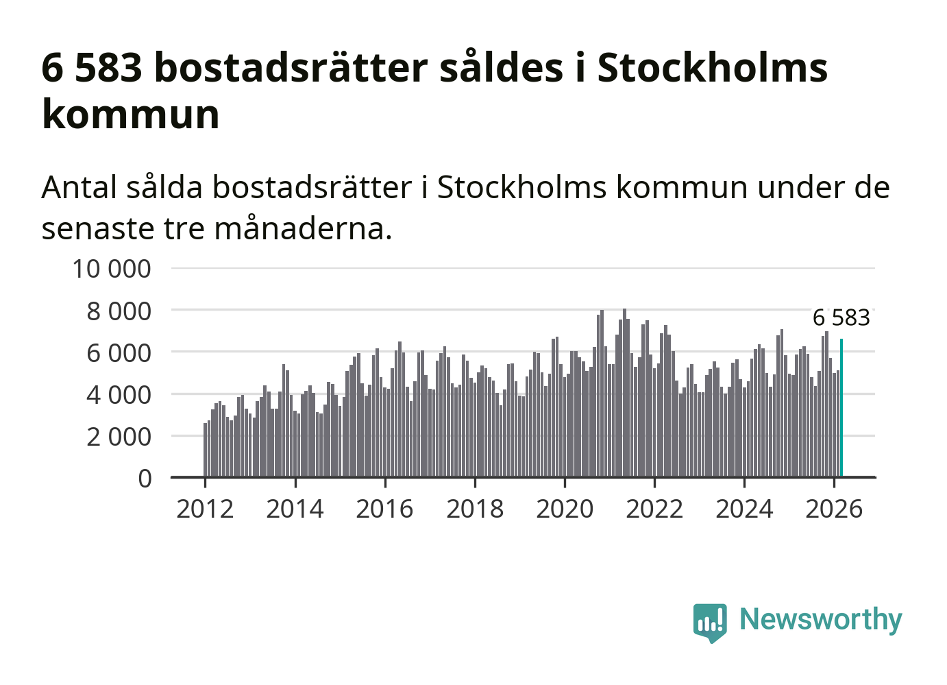 Sammanlagt såldes 6 583 bostadsrätter i Stockholms kommun mellan januari och mars till ett genomsnittligt pris på 5,4 miljoner kronor. I fjol gjordes 5 851 affärer vid den här tiden på året.